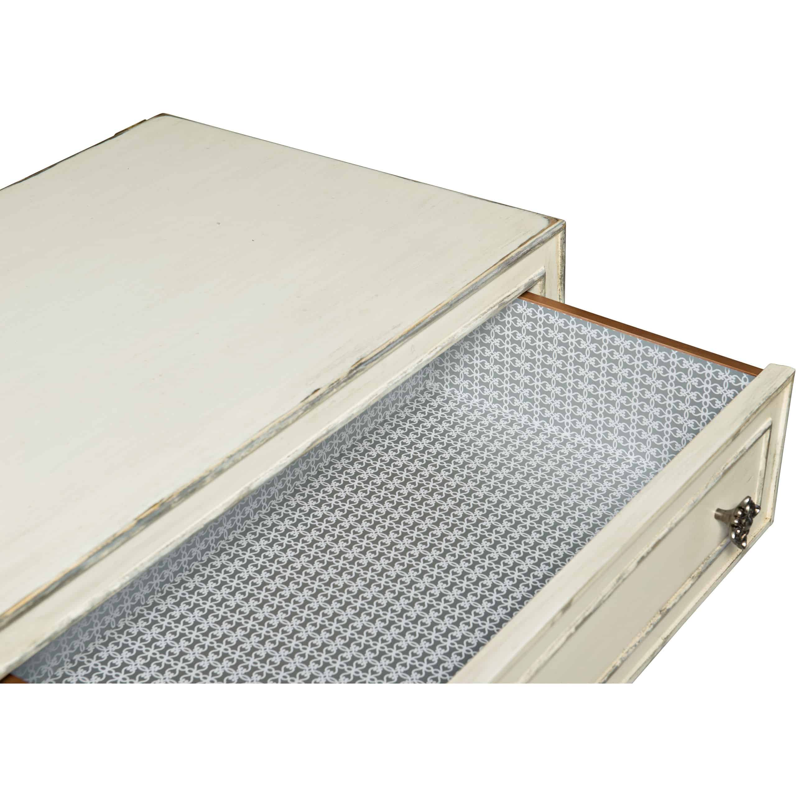Top drawer has a gray and white wallpaper interior
