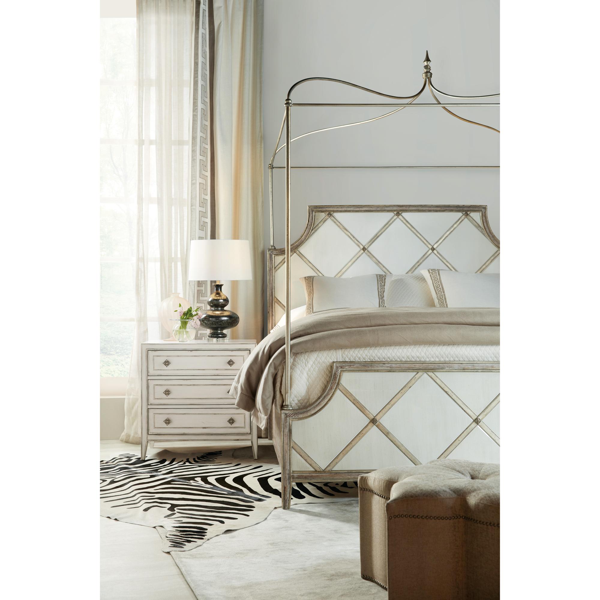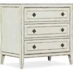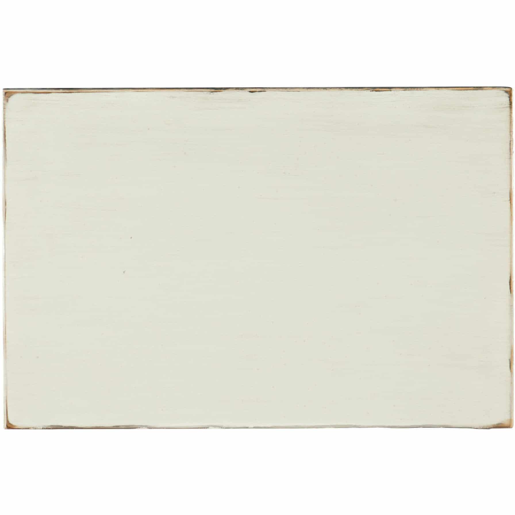 Finish: Blanc, a creamy white finish accented with champagne and silver tipping. Distressing includes rasping. Antique silver colored metal alloy custom decorative pull designed to look like a piece of jewelry.
