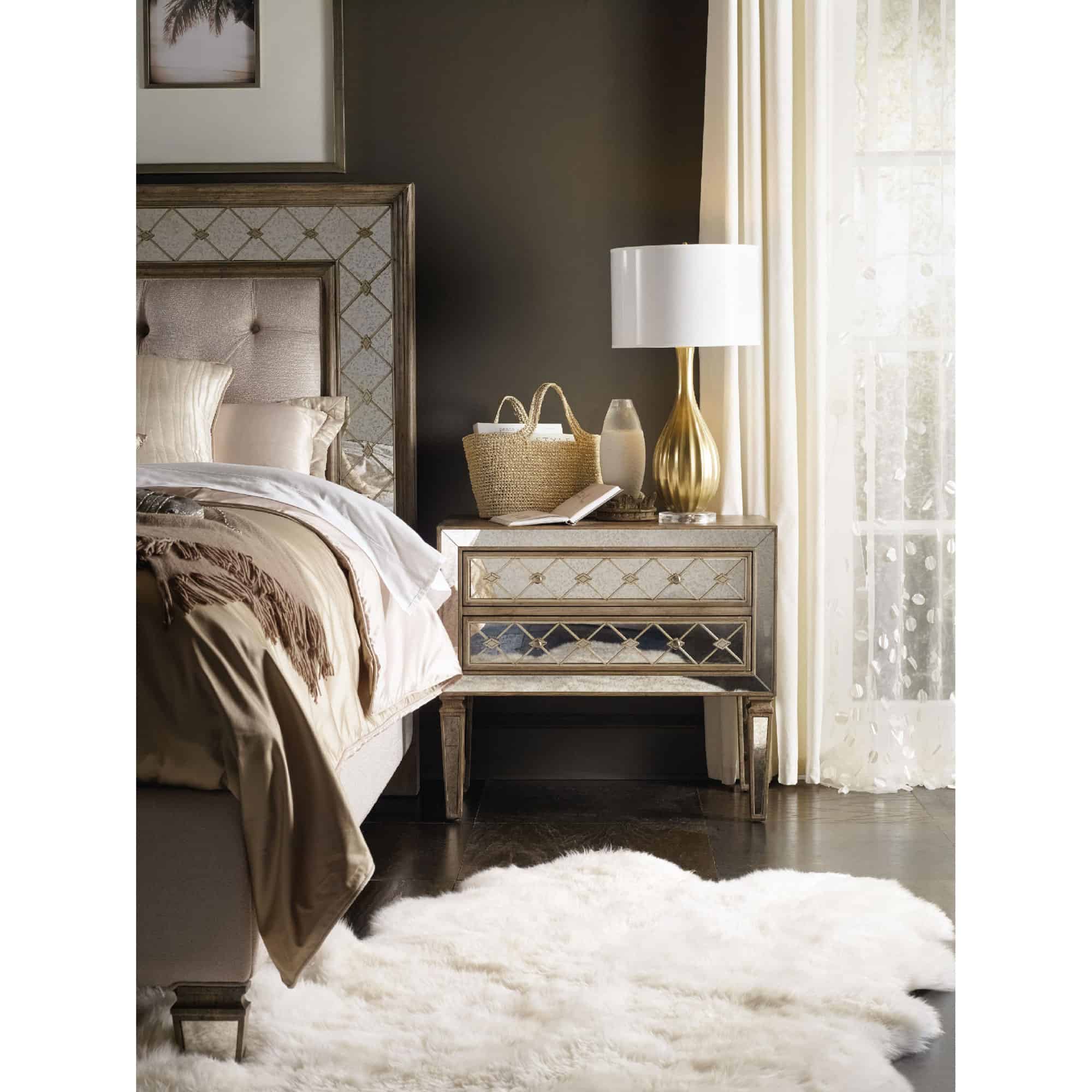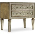 Finish: Avalon: Case fronts are framed in antique mirror with hand colored silver leaf eglomise panels with wood finished sides and tops. Distressing includes planking.