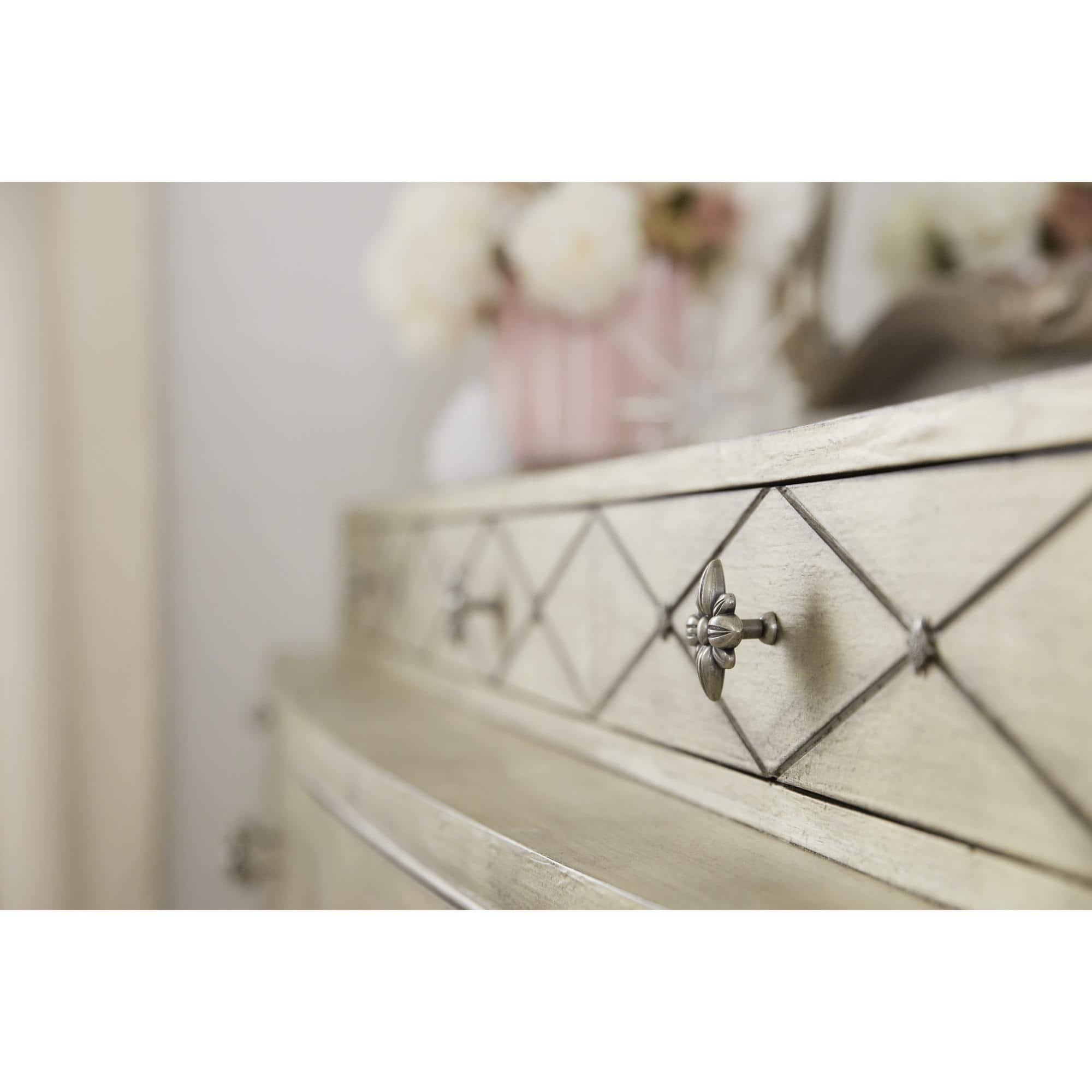 Finish: Jewel, a silver finish with rich undertones of gold and champagne. Antique silver color metal alloy custom decorative pull designed to look like a piece of jewelry.