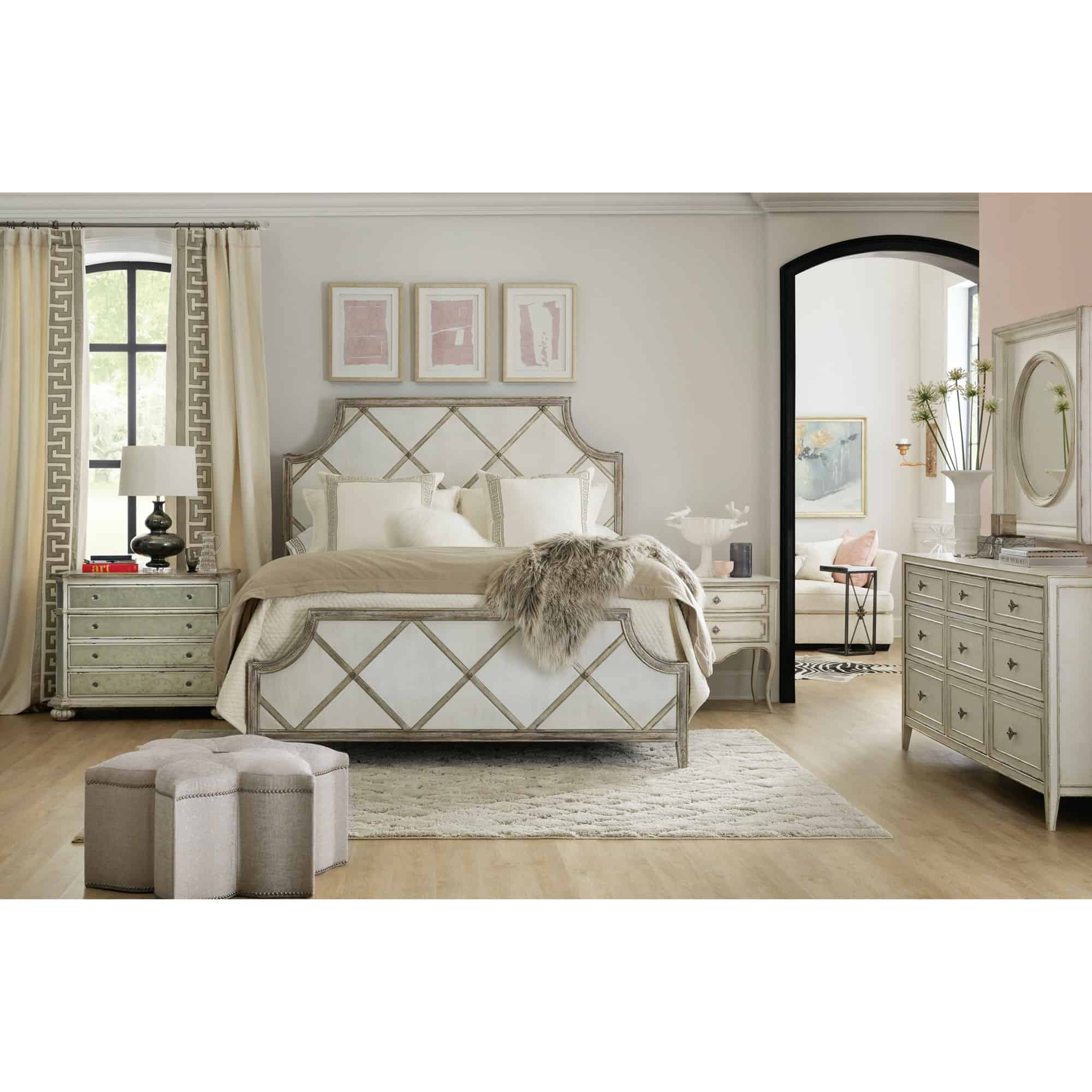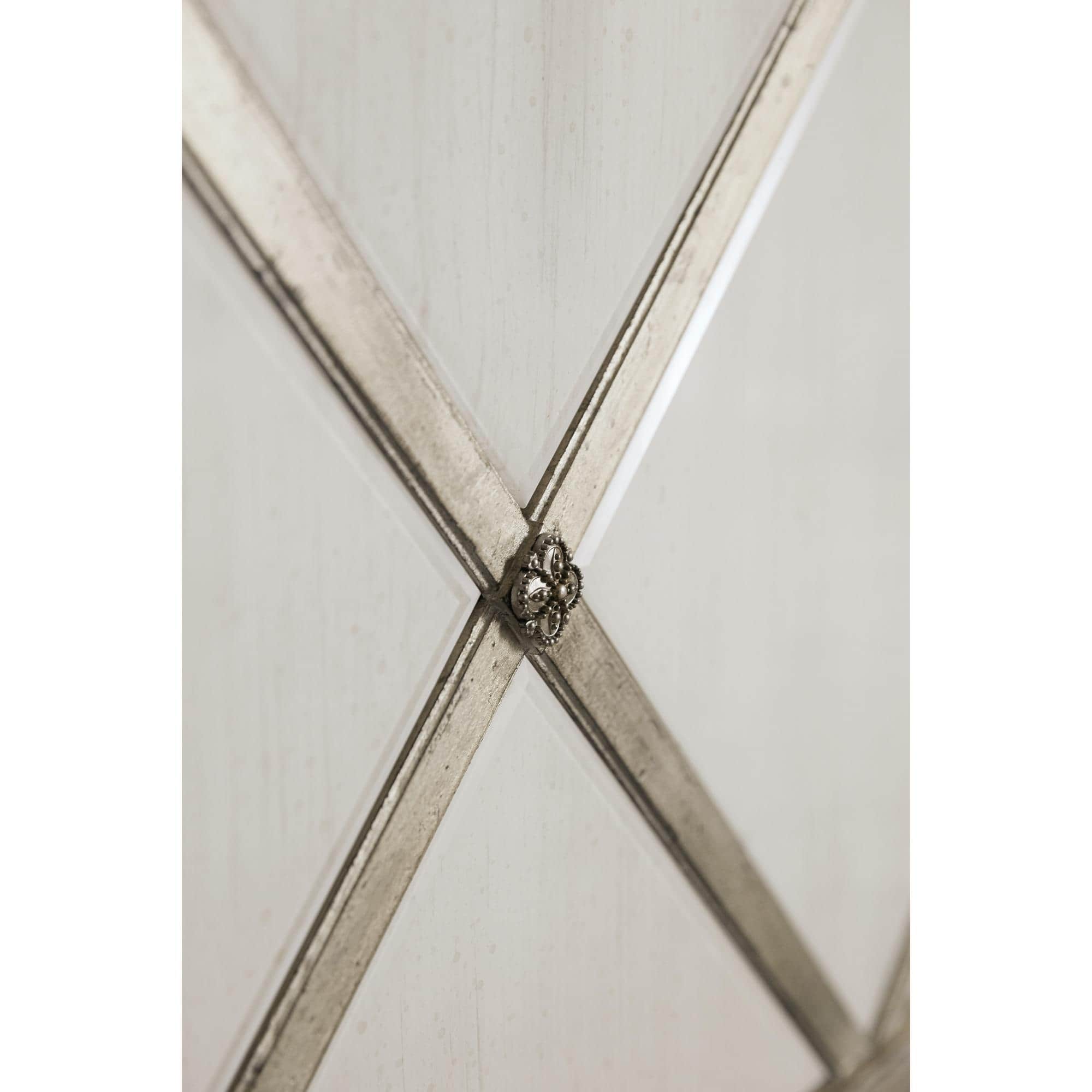 Finish: The main finish is Le Sable, a light wood tone washed with a white and gray glaze. Distressing includes rasping, gouging and worm holes. The diamond fretwork is Jewel, a silver finish with rich undertones of gold and champagne. Headboard and footboard panels use Merinque, a reverse painted glass in a creamy white finish.