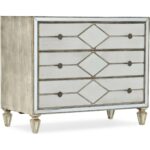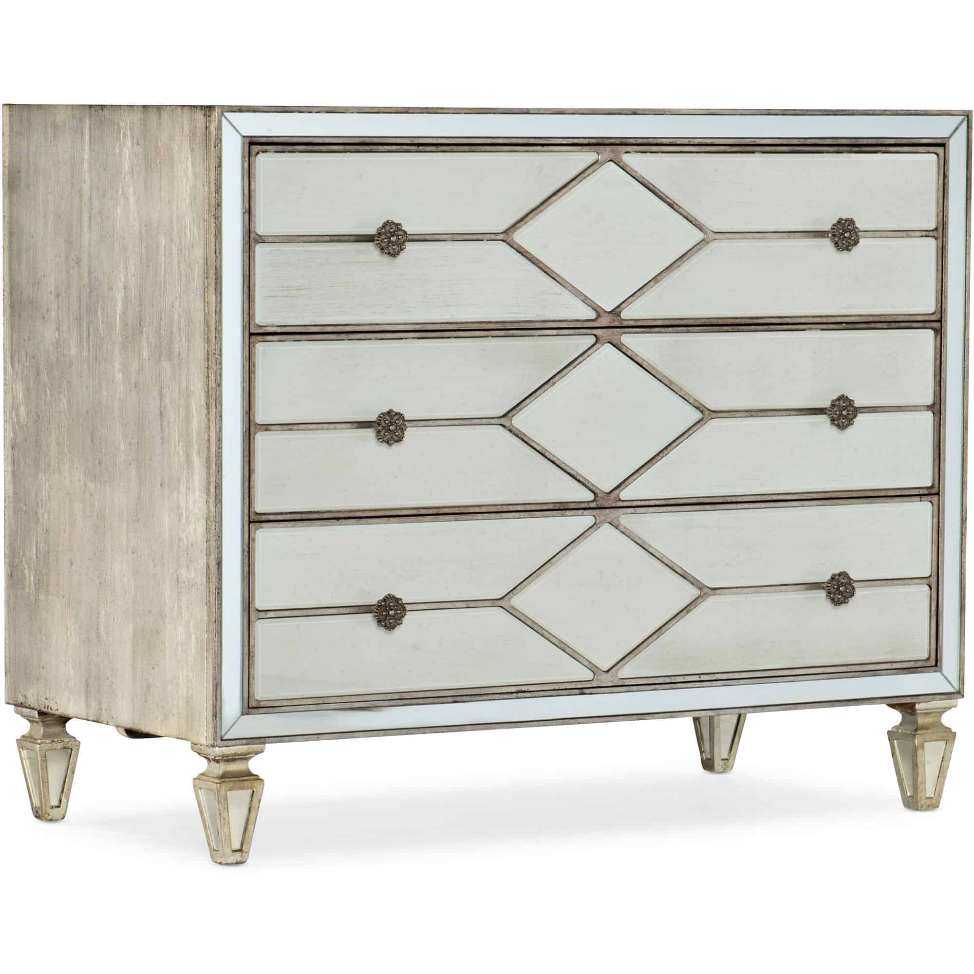 Finish: Jewel, a silver finish with rich undertones of gold and champagne. Drawer fronts use Merinque, a reverse painted glass in a creamy white finish. Antique silver color metal alloy custom decorative pull designed to look like a piece of jewelry.