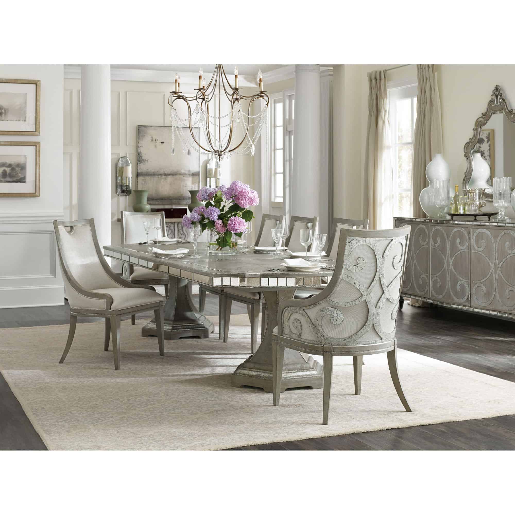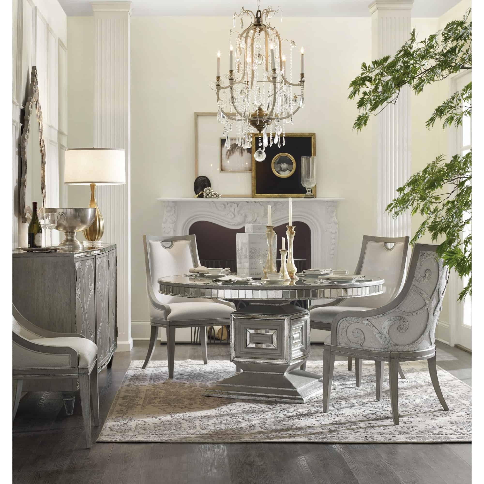 - Finish: Epoque: Greige with shimmer on oak veneers. Distressing includes light rasping.