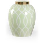 A midsize ginger jar featuring an elongated graceful geometric design in metallic satin gold with a coordinating lid detail. Available in a variety of colors. Designed by Shayla Copas.