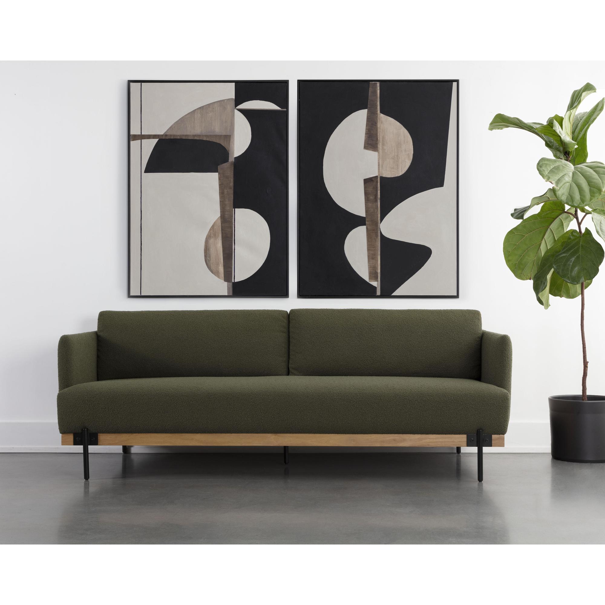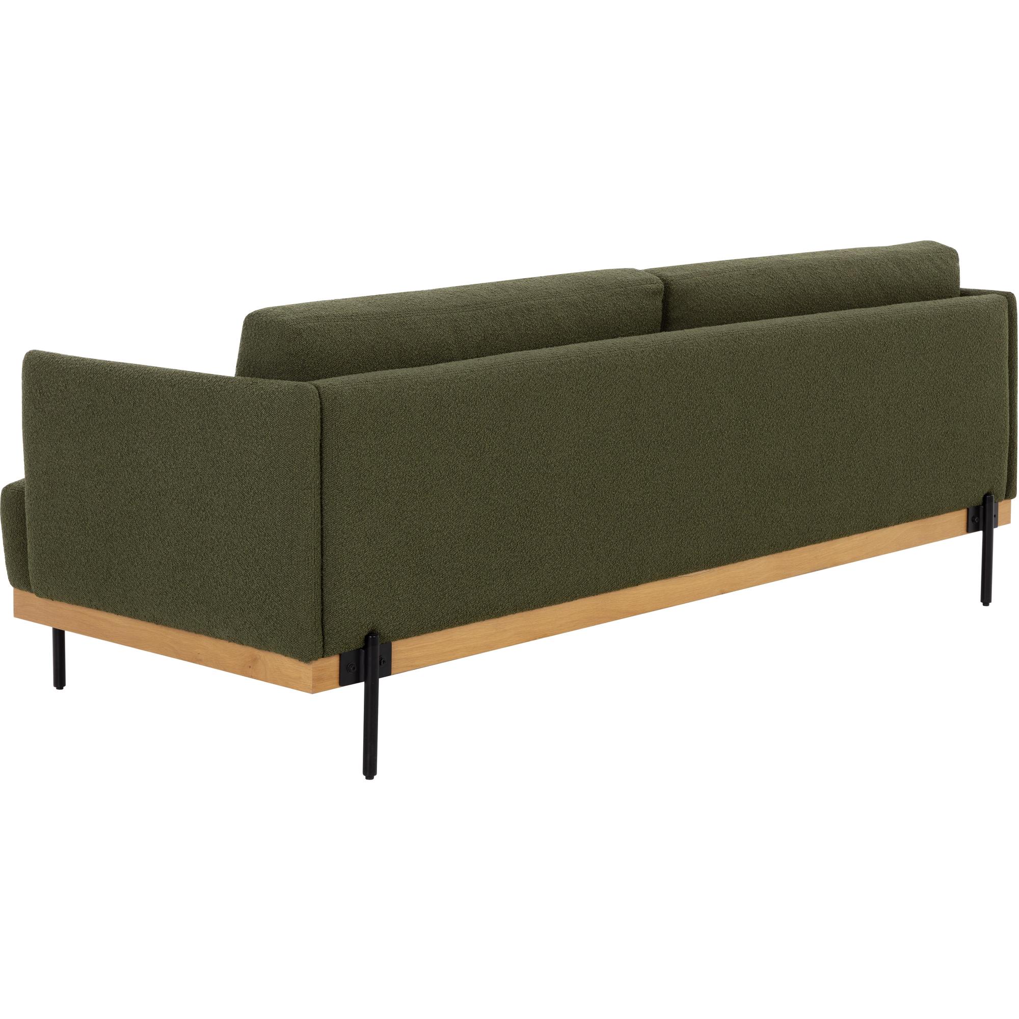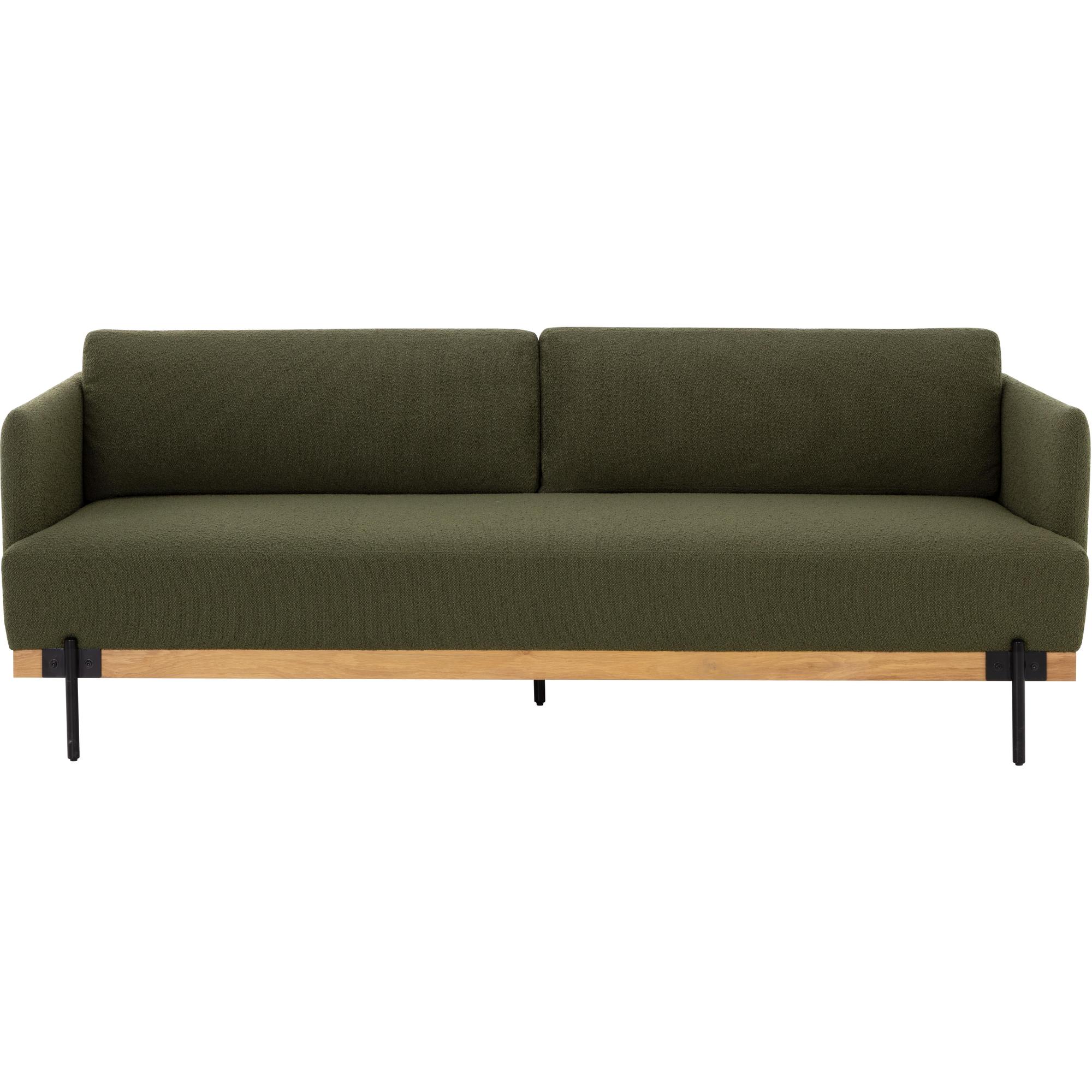Meticulously crafted for relaxation, the Saul Sofa is a staple for any living space. Generously upholstered in copenhagen olive boucle fabric for a soft feel and comfort. Features an exposed rustic oak wood frame for added detail. Black powder-coated iron legs finish the look. As wood is an organic, porous material, these pieces will contain natural variation of texture and may also exhibit fine indentations and cracks. Wood pieces will also display a disparity of colour and grain, and visible knots and burls that add to the character of each piece.