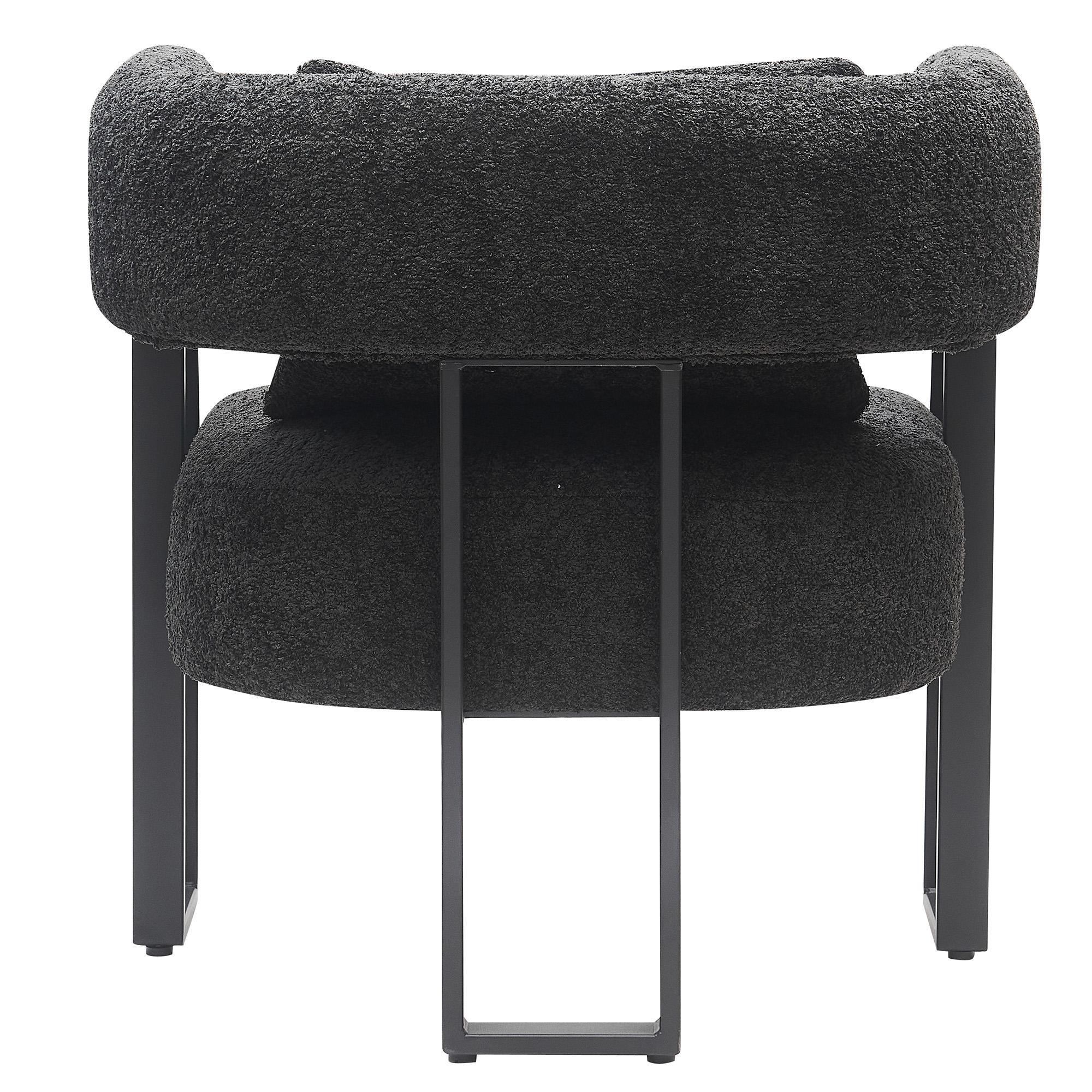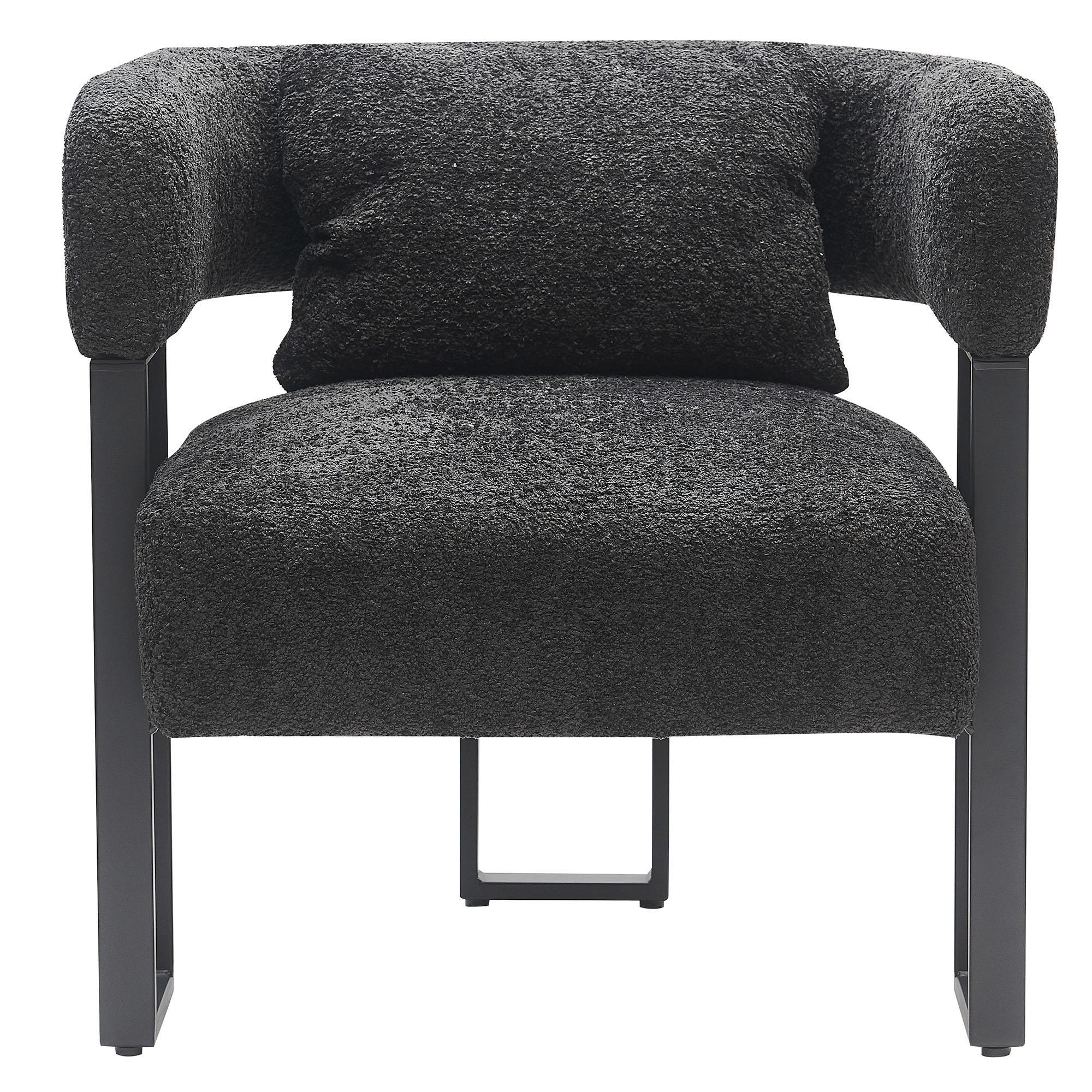 Modern bucket-style accent is the epitome of high-end designer style. The textured boucle fabric and the squared, black metal frame work perfectly with the contoured seat back to create the perfect accent seating. Matching throw pillow provides lumbar support or gives opportunity for mixing and matching with other fabrics in the room. Create a cozy conversation space in a formal living room, or place in a bedroom for a perfect reading chair.