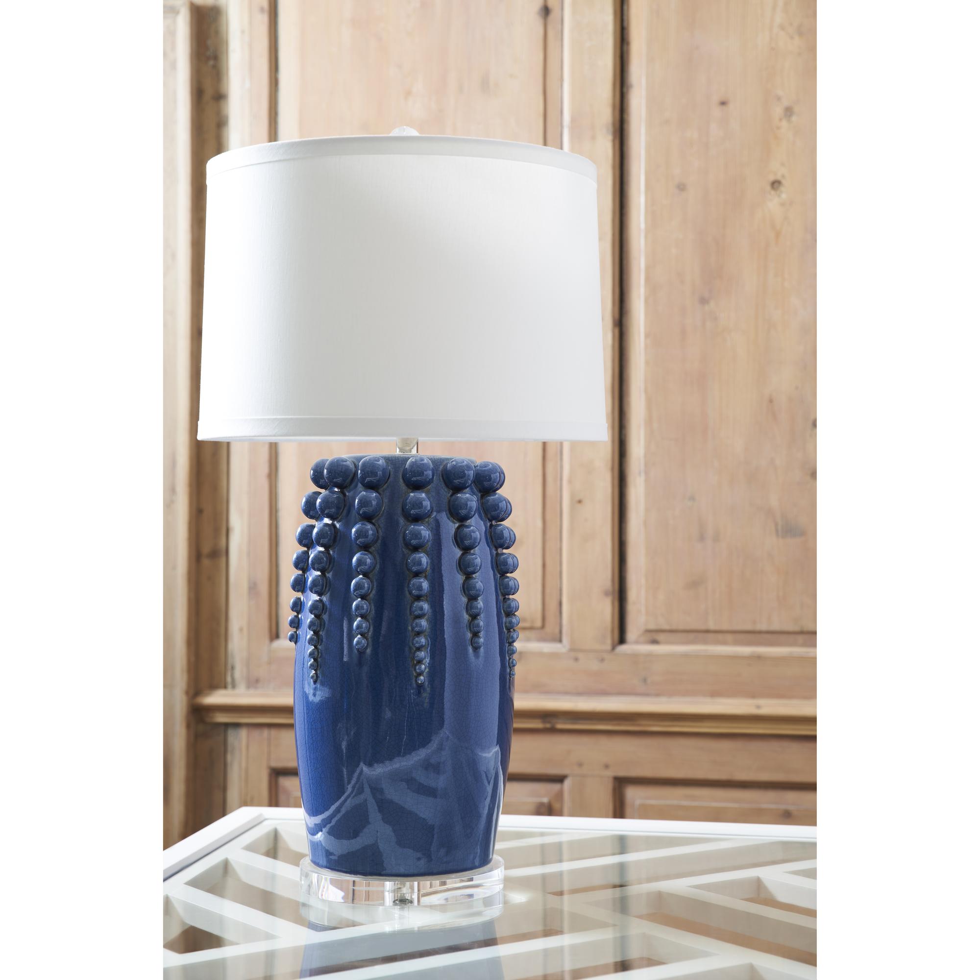 Create an eye-catching display with the Sea Urchin Lamp as the focal point. A blue ceramic glaze finish, large silhouette with beaded details and an acrylic base brings a tasteful coastal feel to your home. Designed by Jamie Merida.