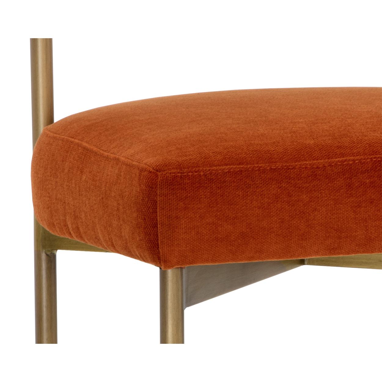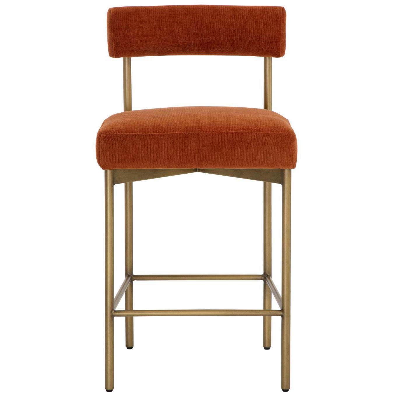 Exude modern style with this open back counter stool. Stocked in danny rust and ivory fabrics with an antique brass steel frame.