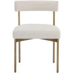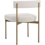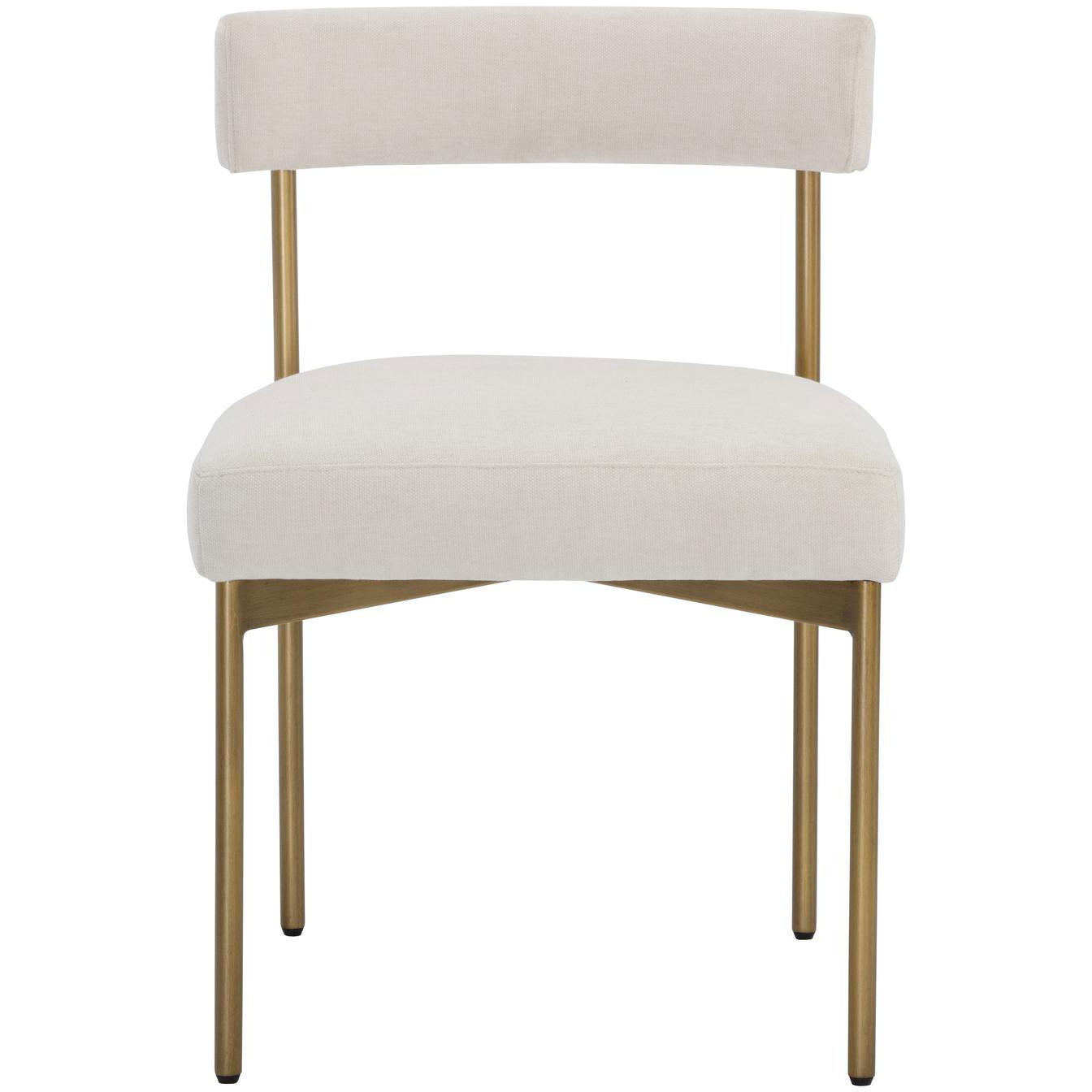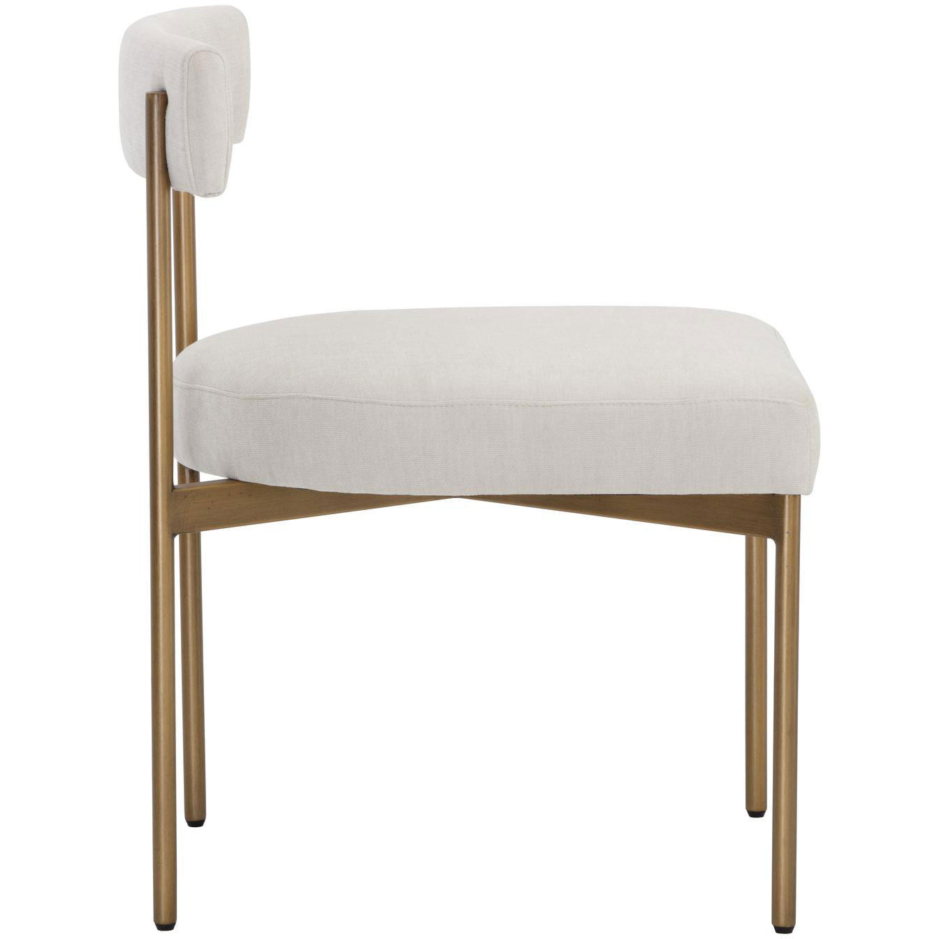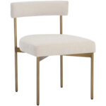 Exude modern style with this open back dining chair. Stocked in danny ivory, teal and rust fabrics with an antique brass steel frame.
