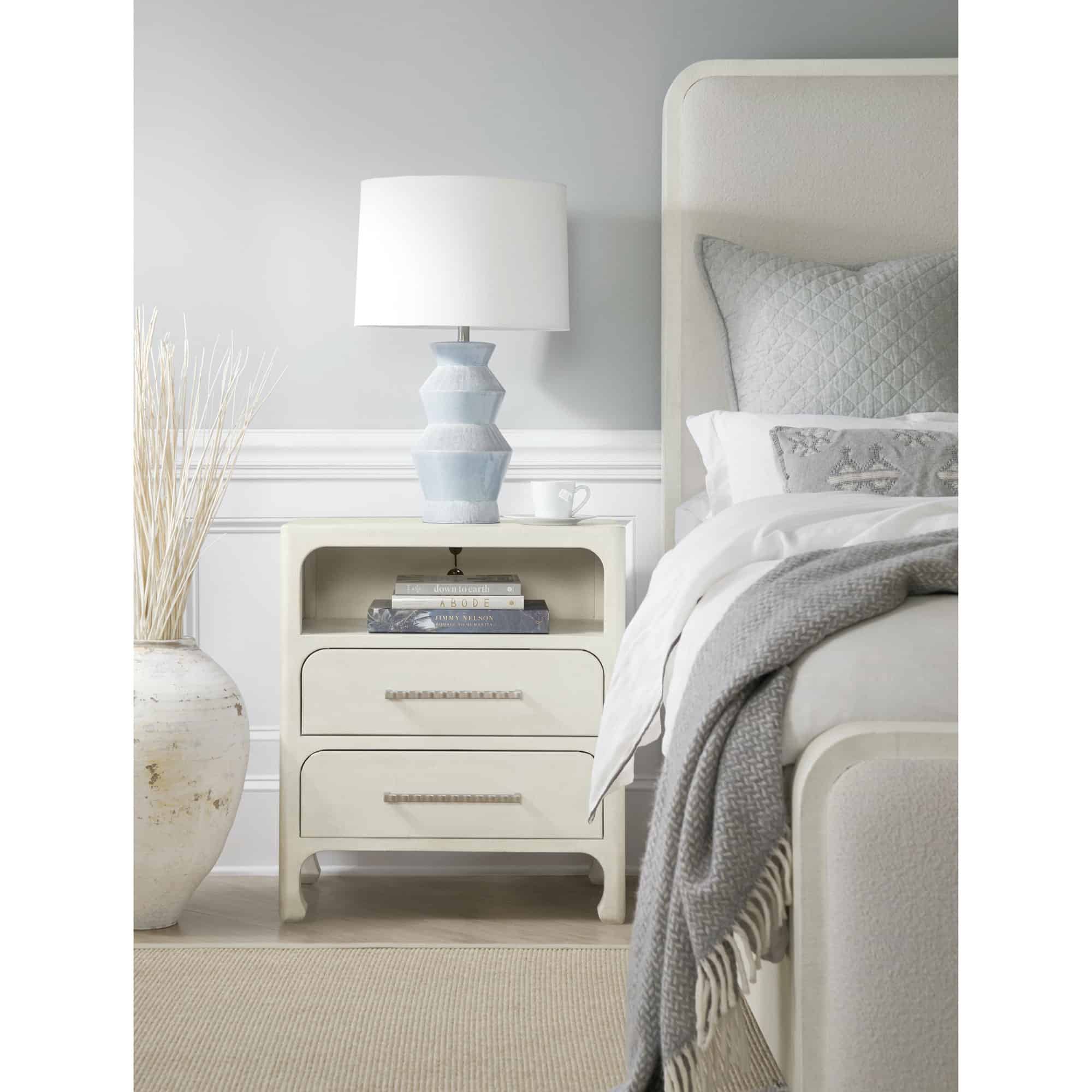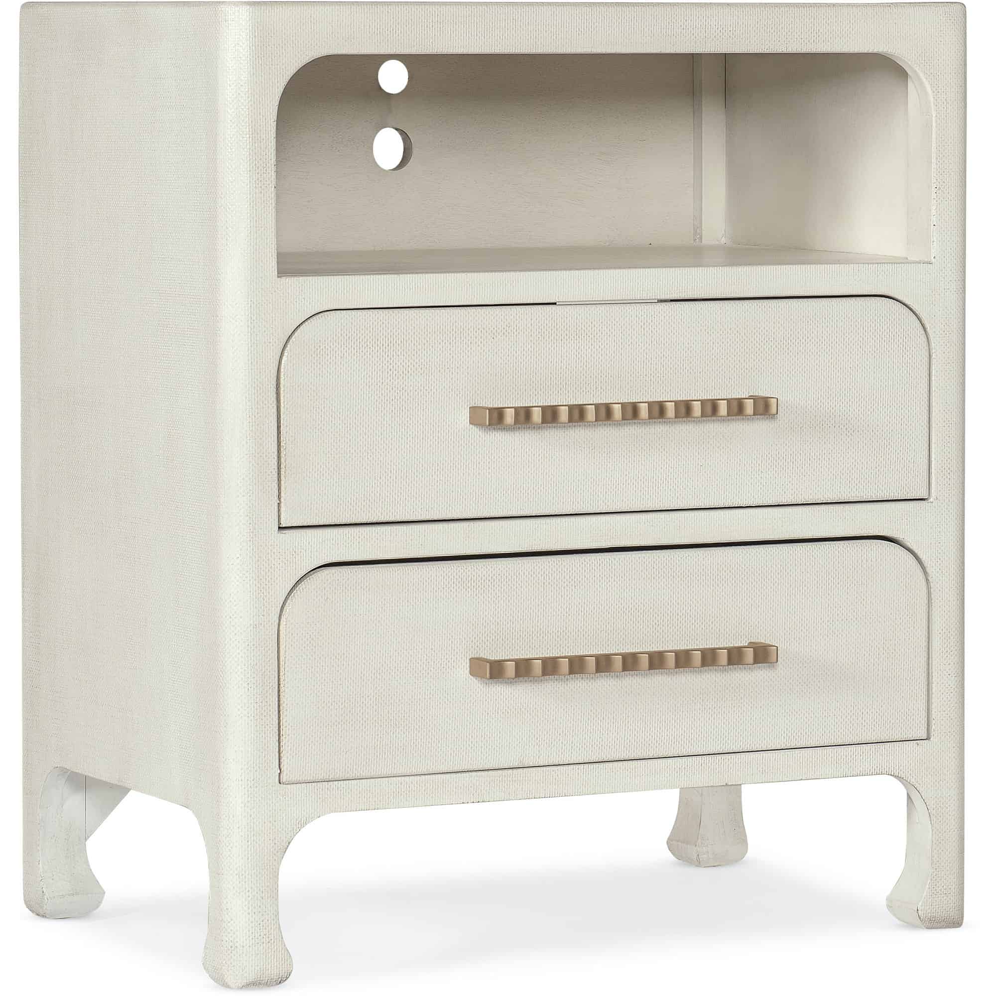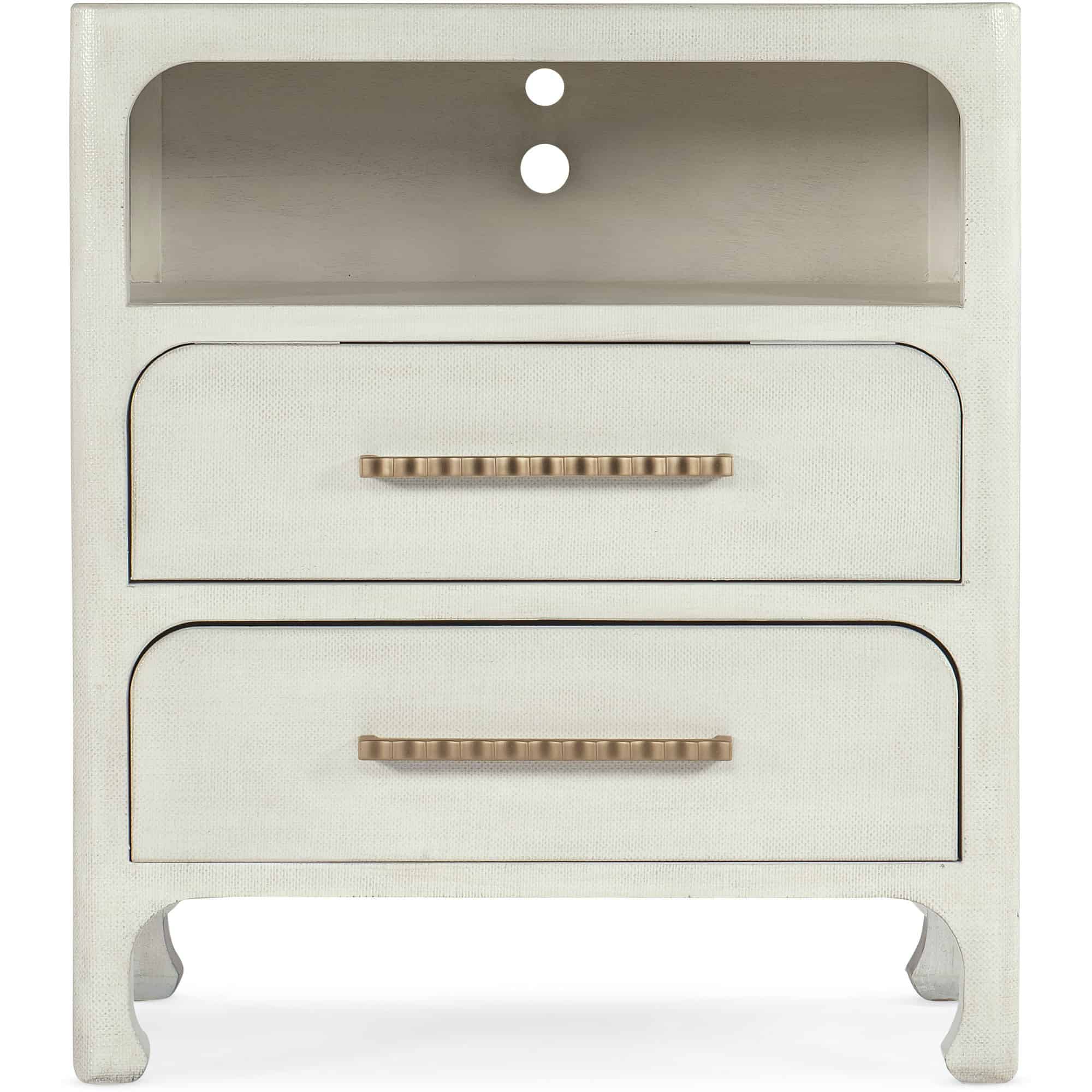- Finish: Sand Dollar: White lacquered grasscloth. Light champagne decorative bar pulls.
