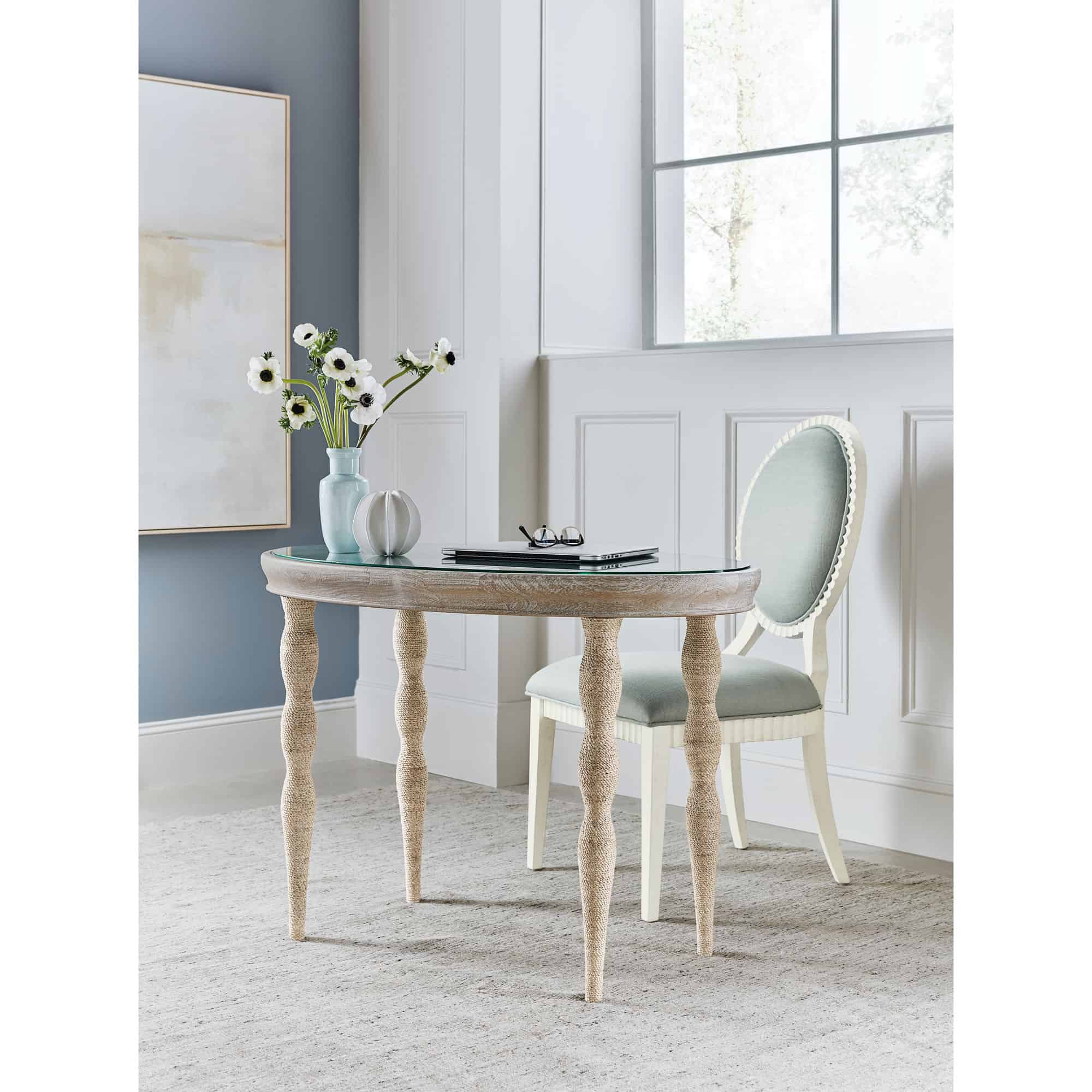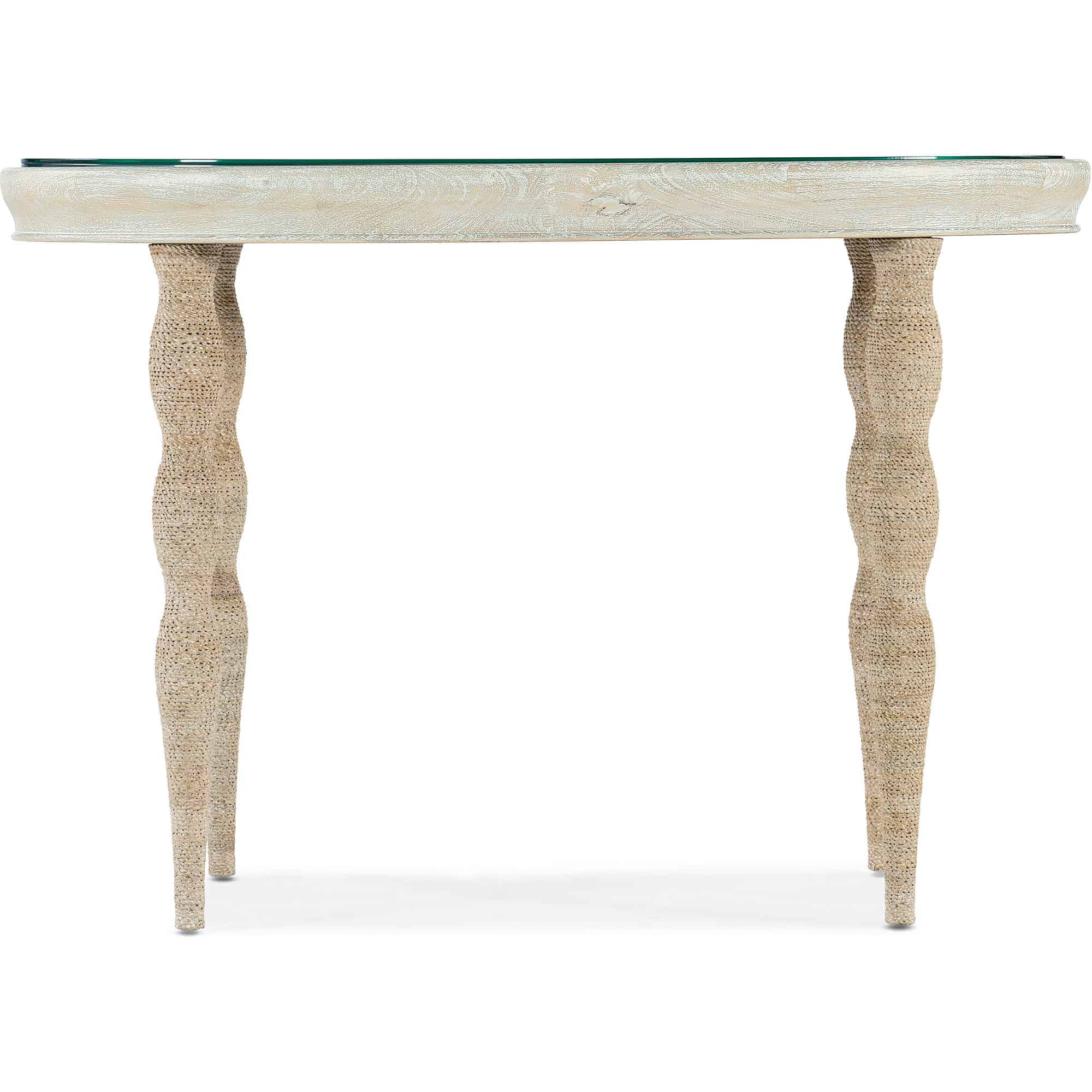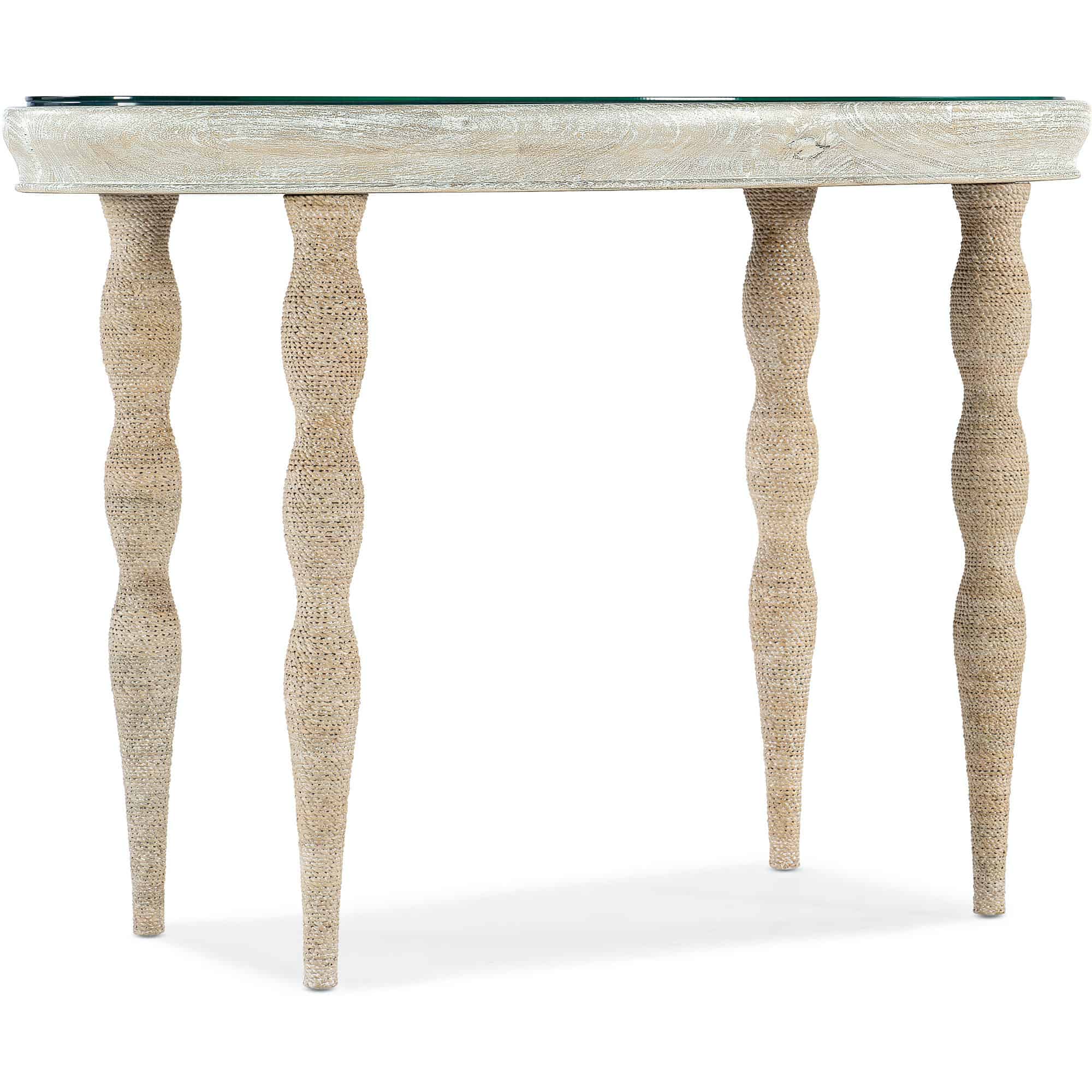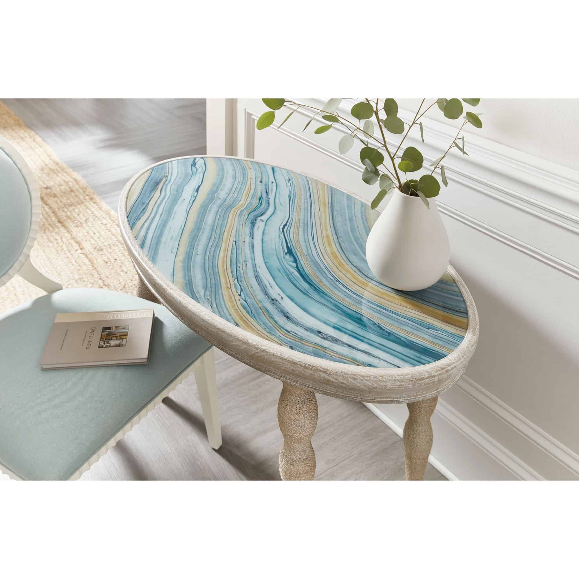 Finish: Surf: light, airy whitewashed oak. Neptune: whitewashed rope wrapping. Painted glass top in blue and yellow tones. Distressing includes sandblasting and wire brushing.