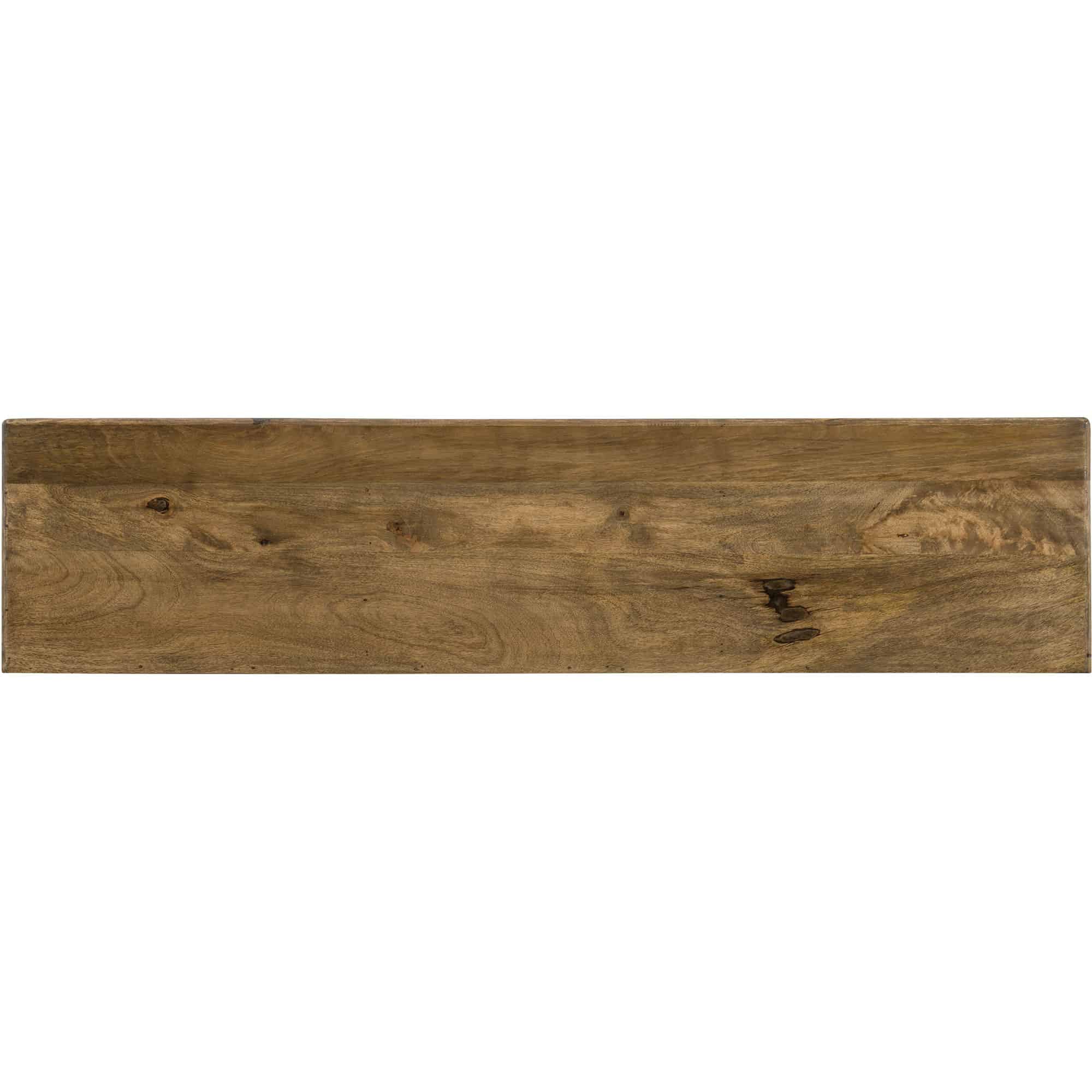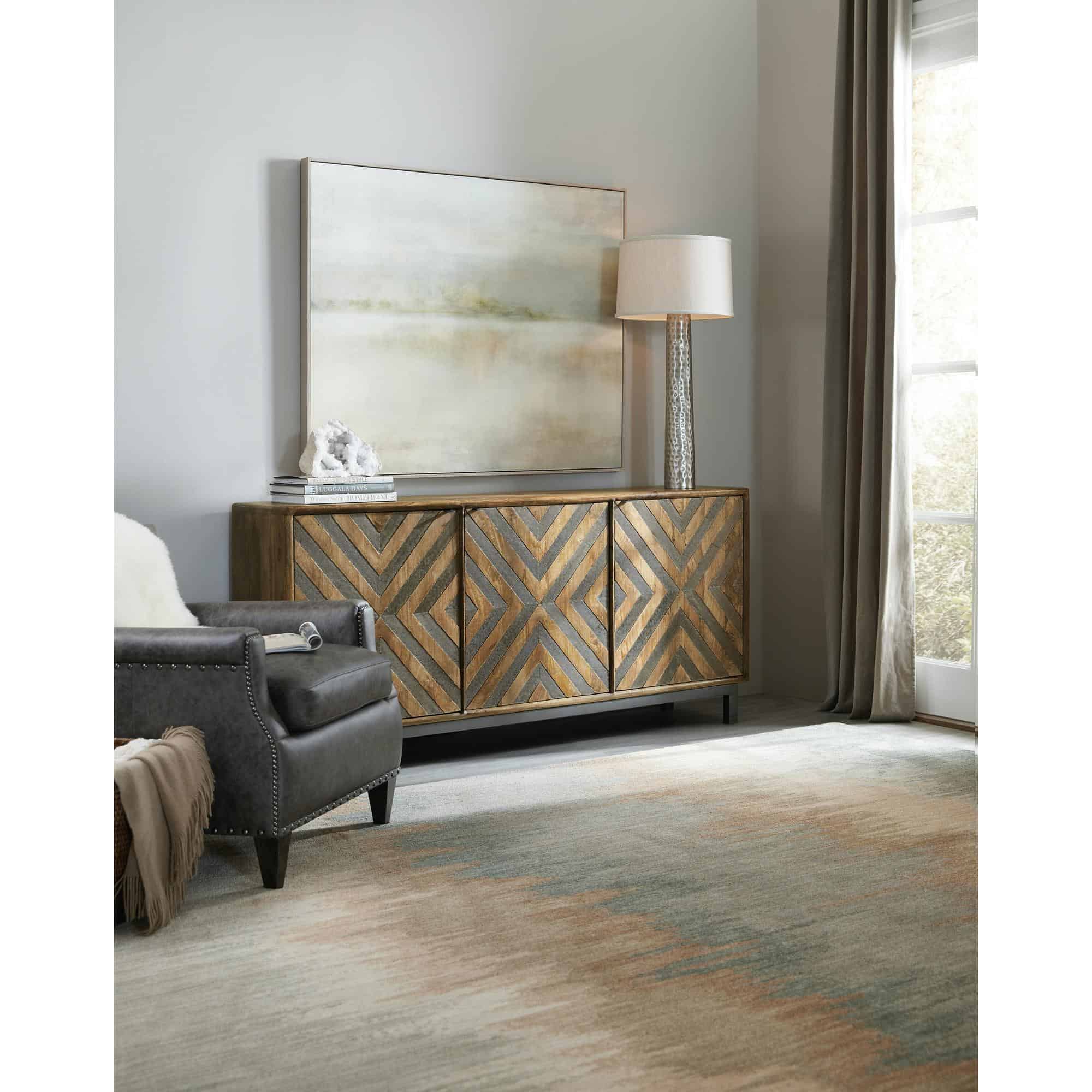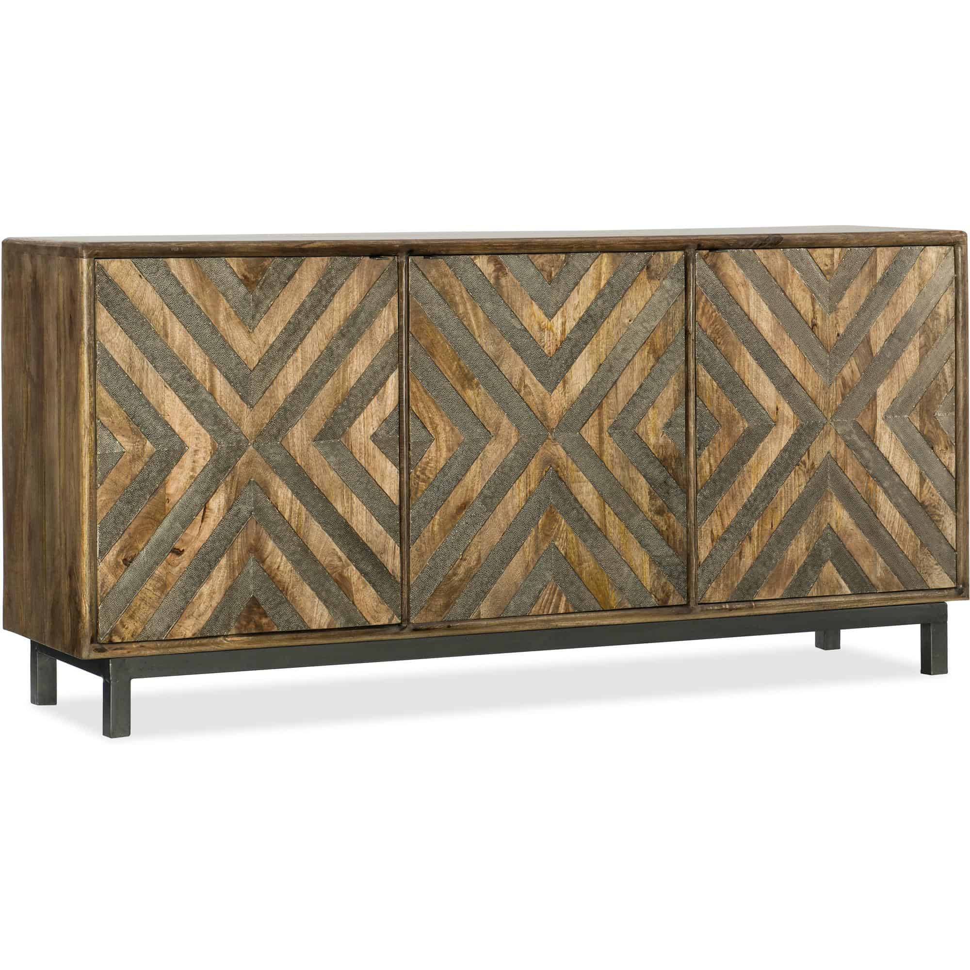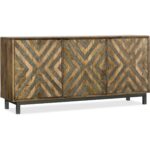 - Finish: Medium wood finish with metal chevron inlay on the front with dark pewter European pulls