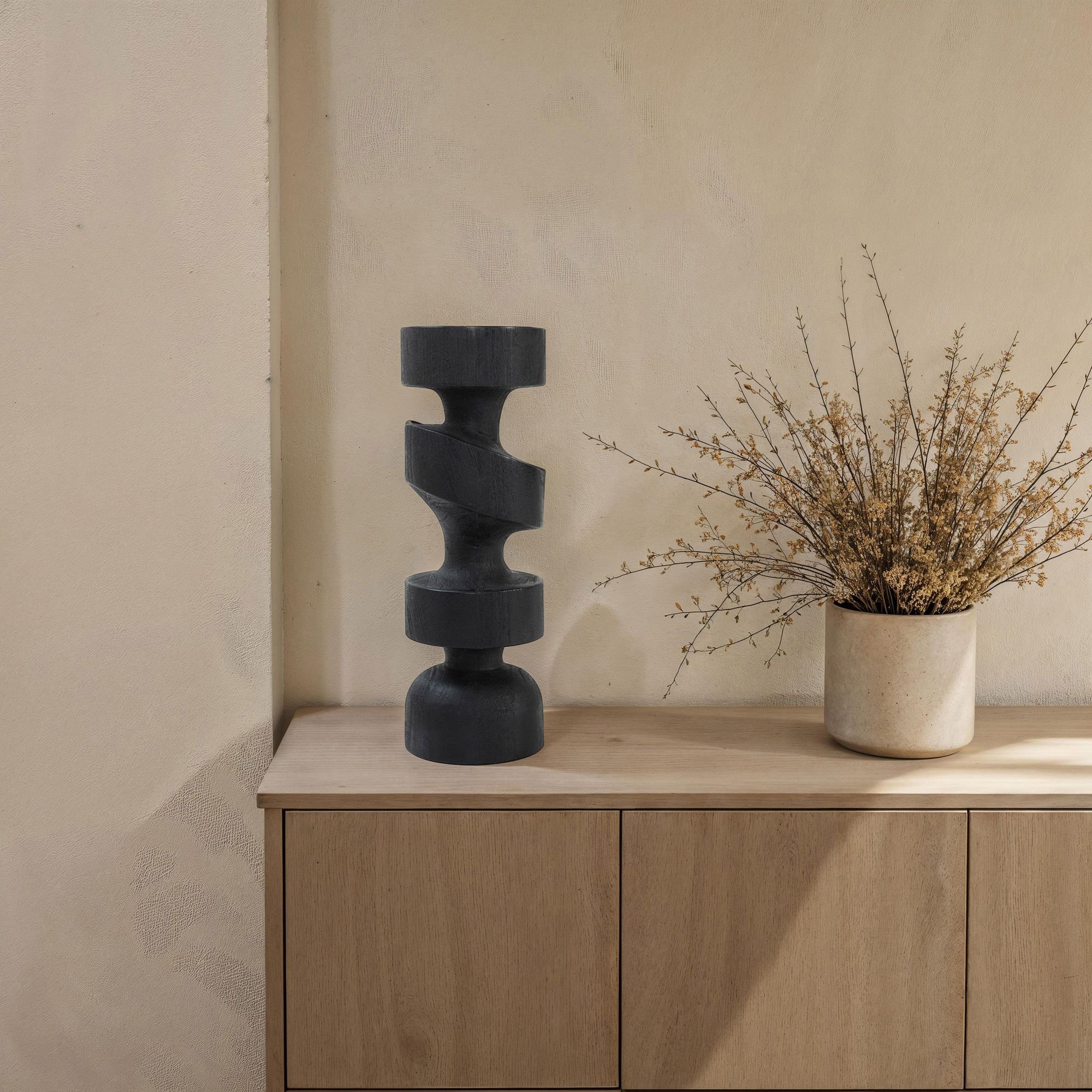 Taking the designers’ tip to always include a touch of black in every room is easy thanks to this striking statue from Steven Sabados. The Canadian television host, artist and designer created this decorative object from mango wood treated with a black burnt finish for added drama. Measuring 15 inches tall, this angular and geometric piece will bring a fresh update to any modern interior.