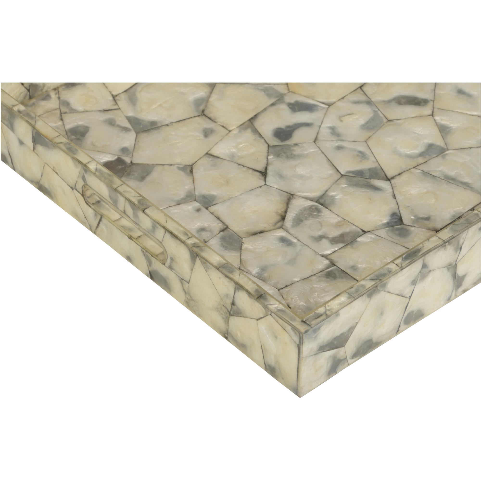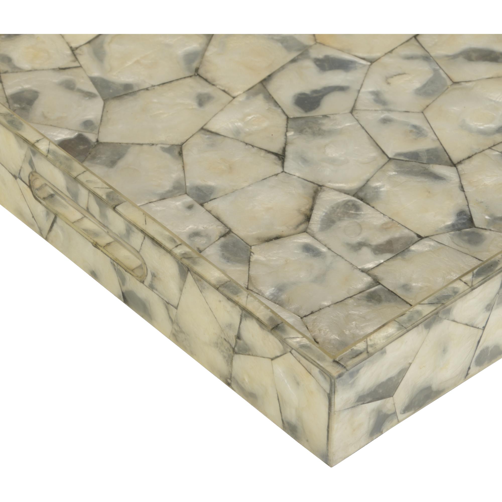 Covered in gray tortoise capiz shell, shell shock tray is ideal for serving guests at a cocktail party or holding the remote and decorative accents on a large ottoman or cocktail table.