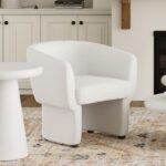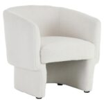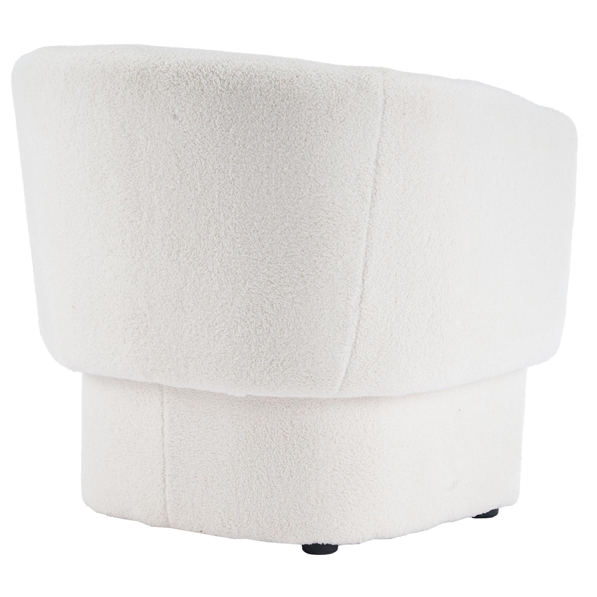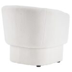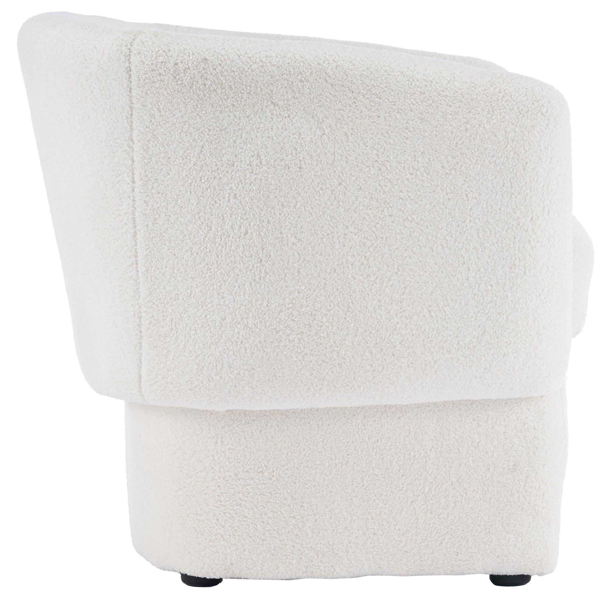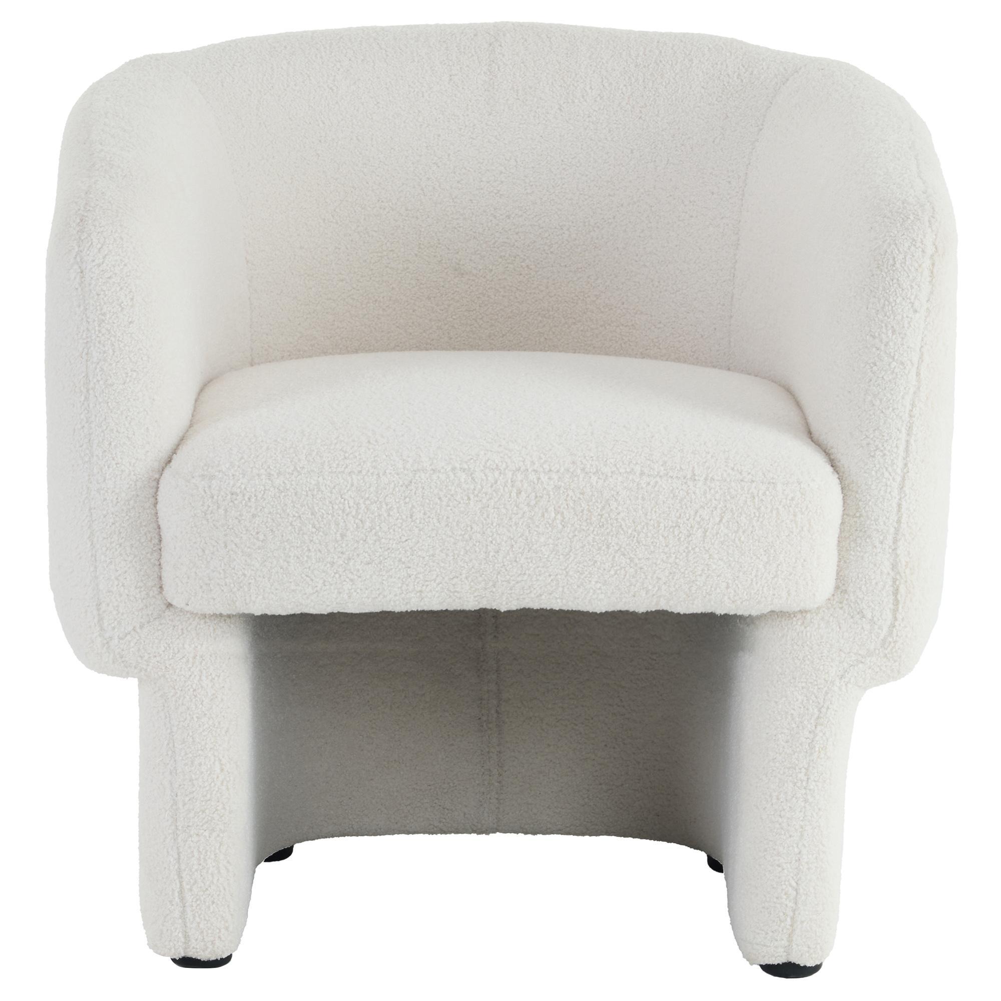 Take a seat in ultra cozy armchair and let it hug you with its softness. The round contoured shape adds to the inviting comfort factor of this chair. Soft, boucle fabric upholstery covers the entirety of this oversized accent chair. Can work well in any space as a an accent chair or for more formal seating in the living room.