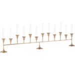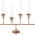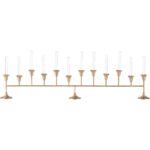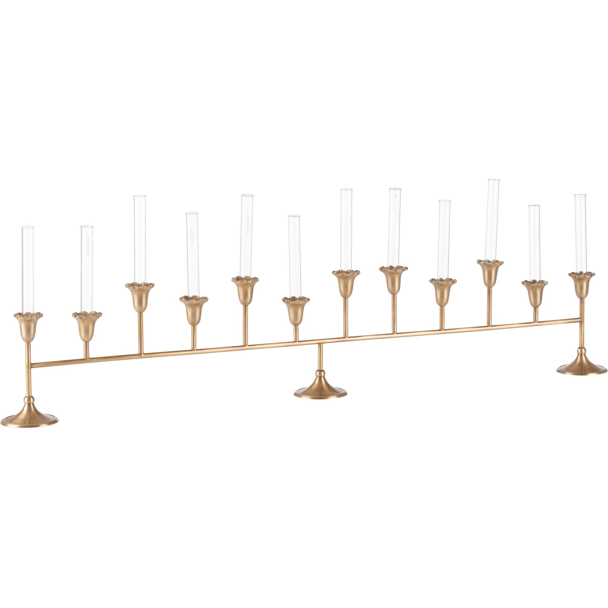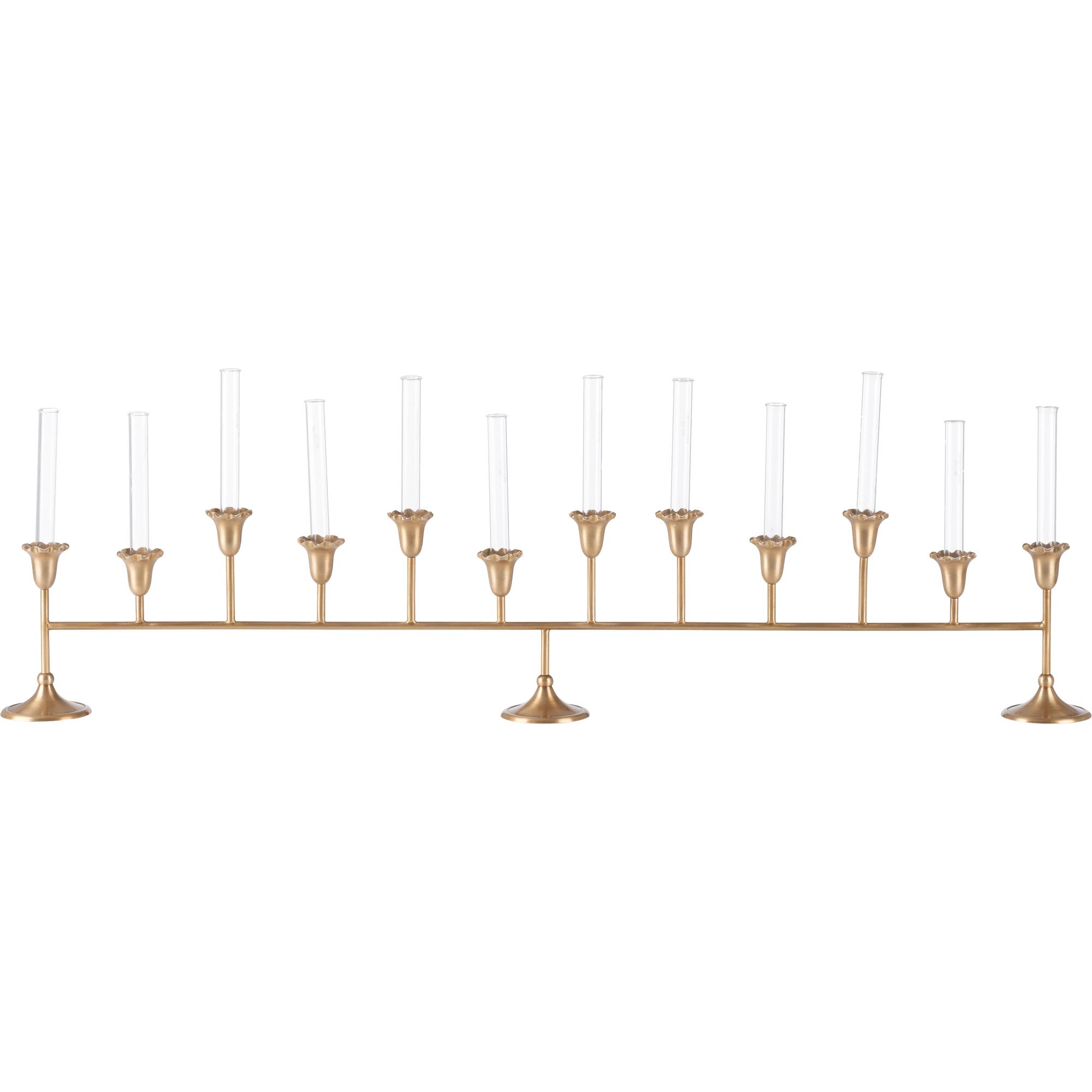 The Sherwood Bud Vase features an antique brass finish with fluted floral cups and glass inserts. Its elongated form makes a striking centerpiece, perfect for adding warmth and elegance to a dining table or mantel.