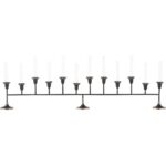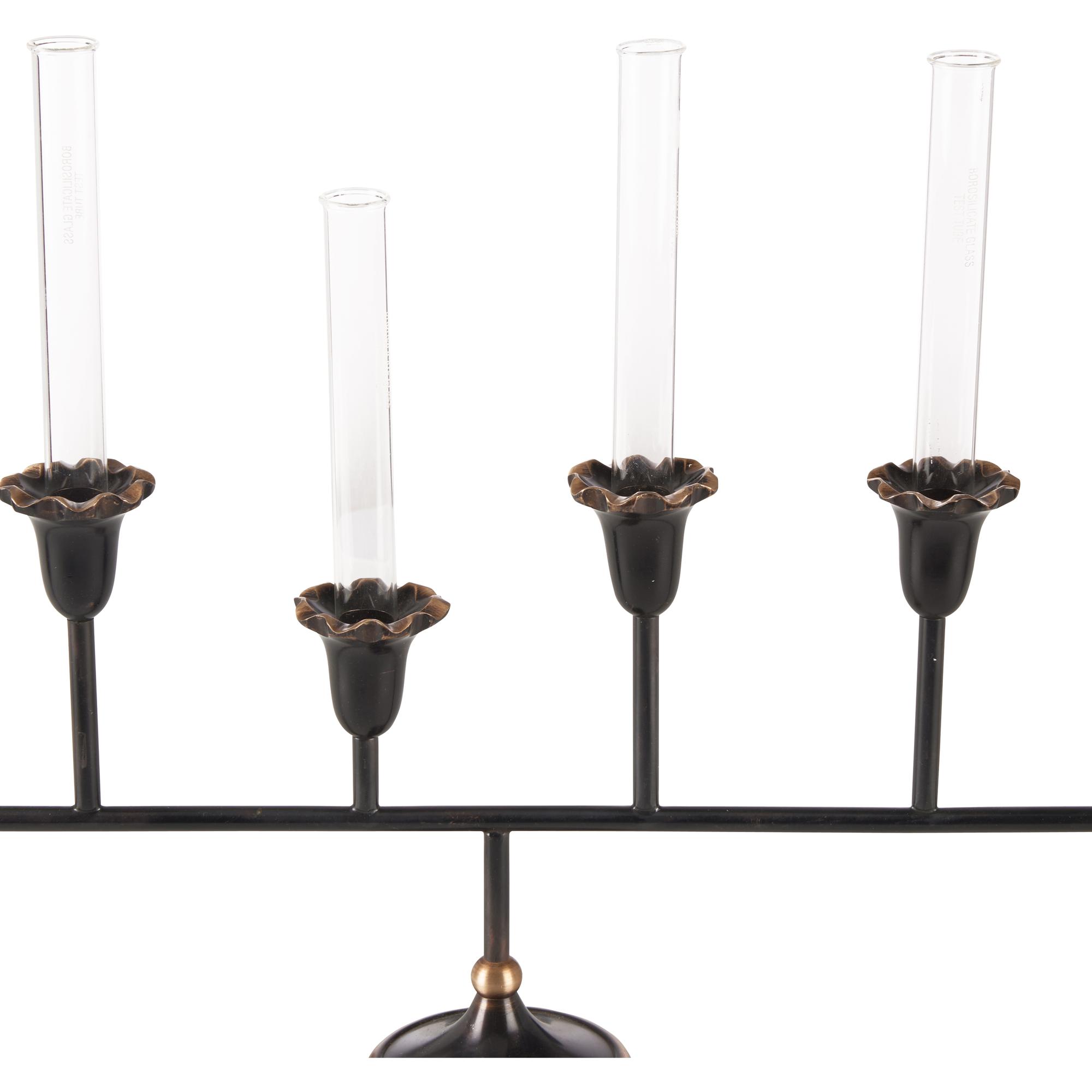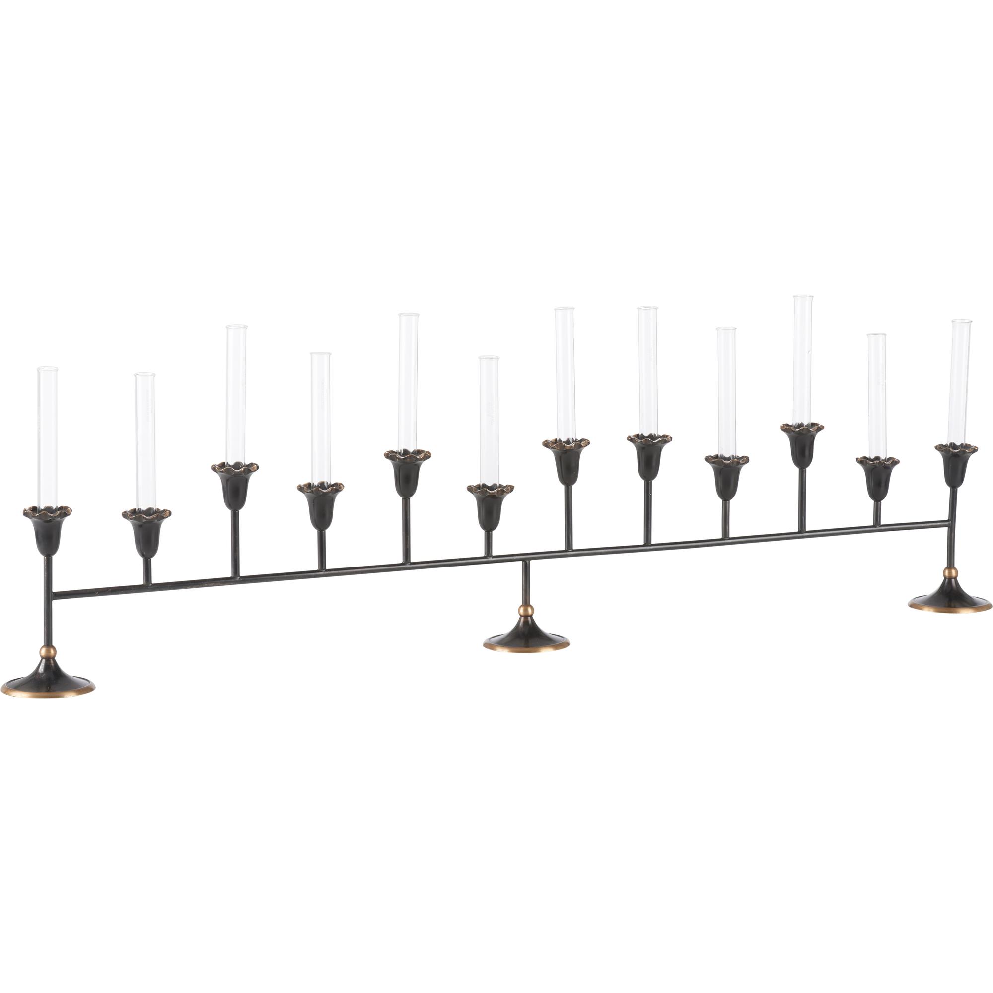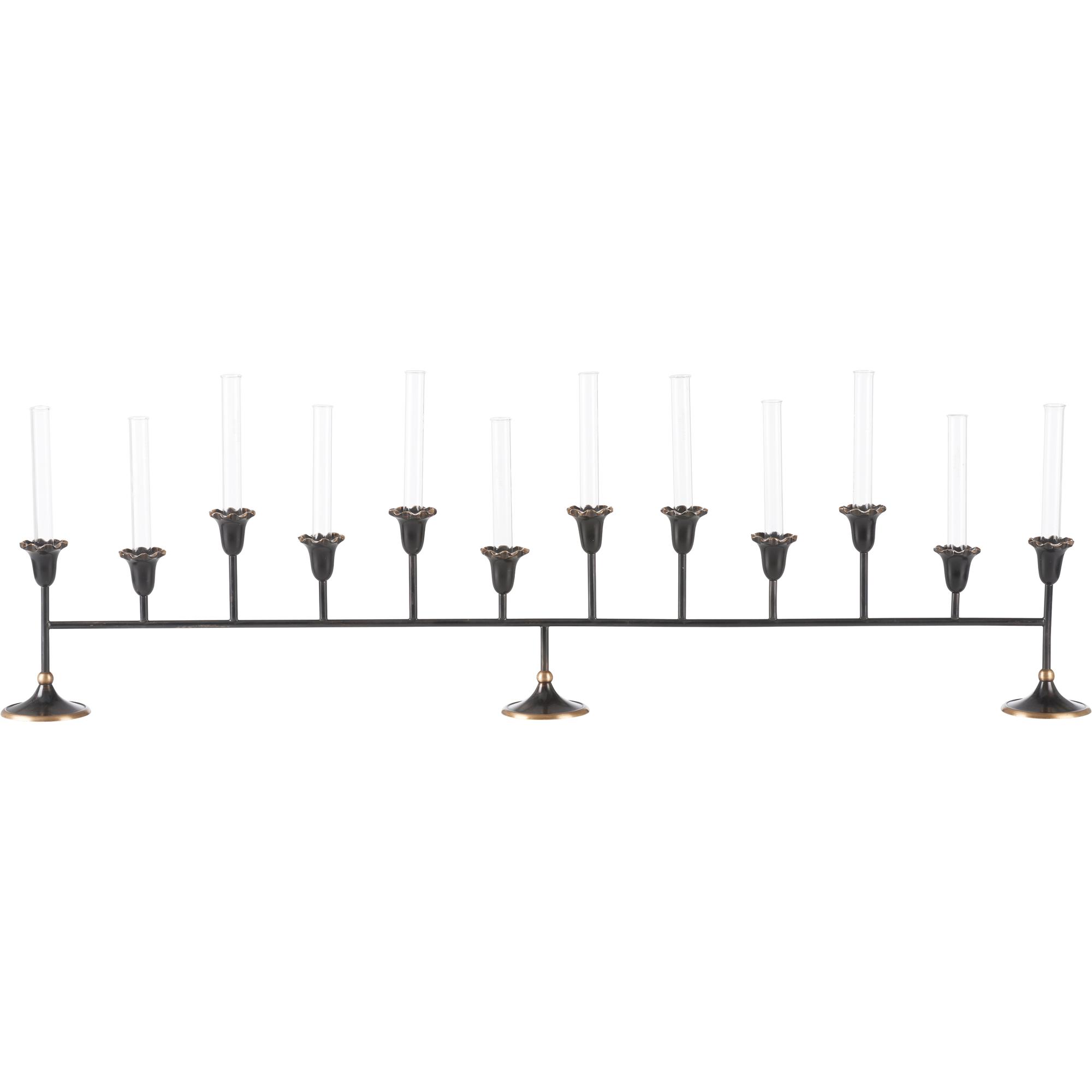 The Sherwood Bud Vase features a bronze/verdi finish with fluted floral cups and glass inserts. Its elongated form makes a striking centerpiece, perfect for adding warmth and elegance to a dining table or mantel.