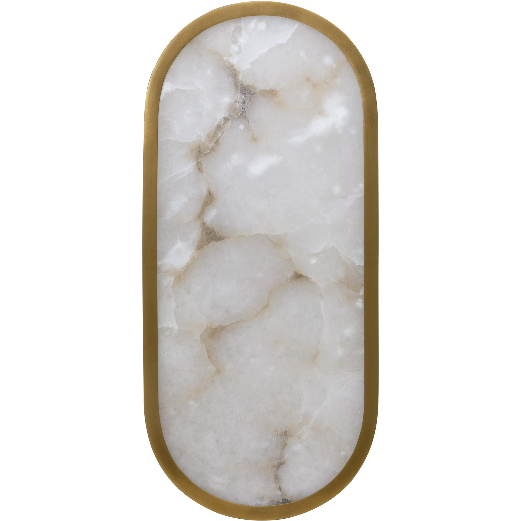 Exuding beauty and serenity, the Sidra Sconce is simply mesmerizing. Highlighted in an antique brass iron oval frame, this piece features natural alabaster imported from Spain that lends a soft warm glow to any space.