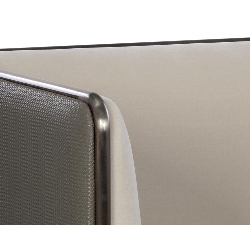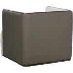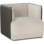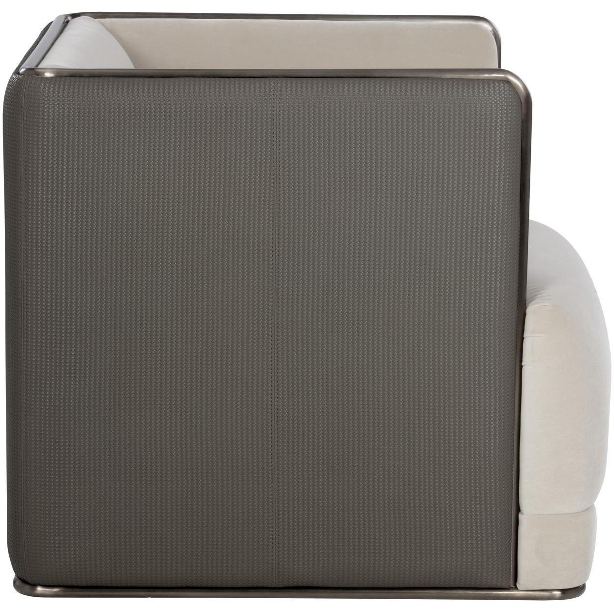 A bold form defines this modern and structured armchair that is guaranteed to turn heads. Features an interior upholstered in meg taupe fabric and an exterior in textured porcini taupe faux leather. Completed with an antique bronze stainless steel frame. Coordinating sofa also available. Handle With Care: This design has been crafted with faux leather. Faux leather is manufactured to reflect the natural characteristics of leather; as such, colour variations, markings wrinkles, grooves, and light scratches are appreciated characteristics. No two pieces will be alike. Visit our Product Care page for more information on how to ensure the lasting beauty of this piece.