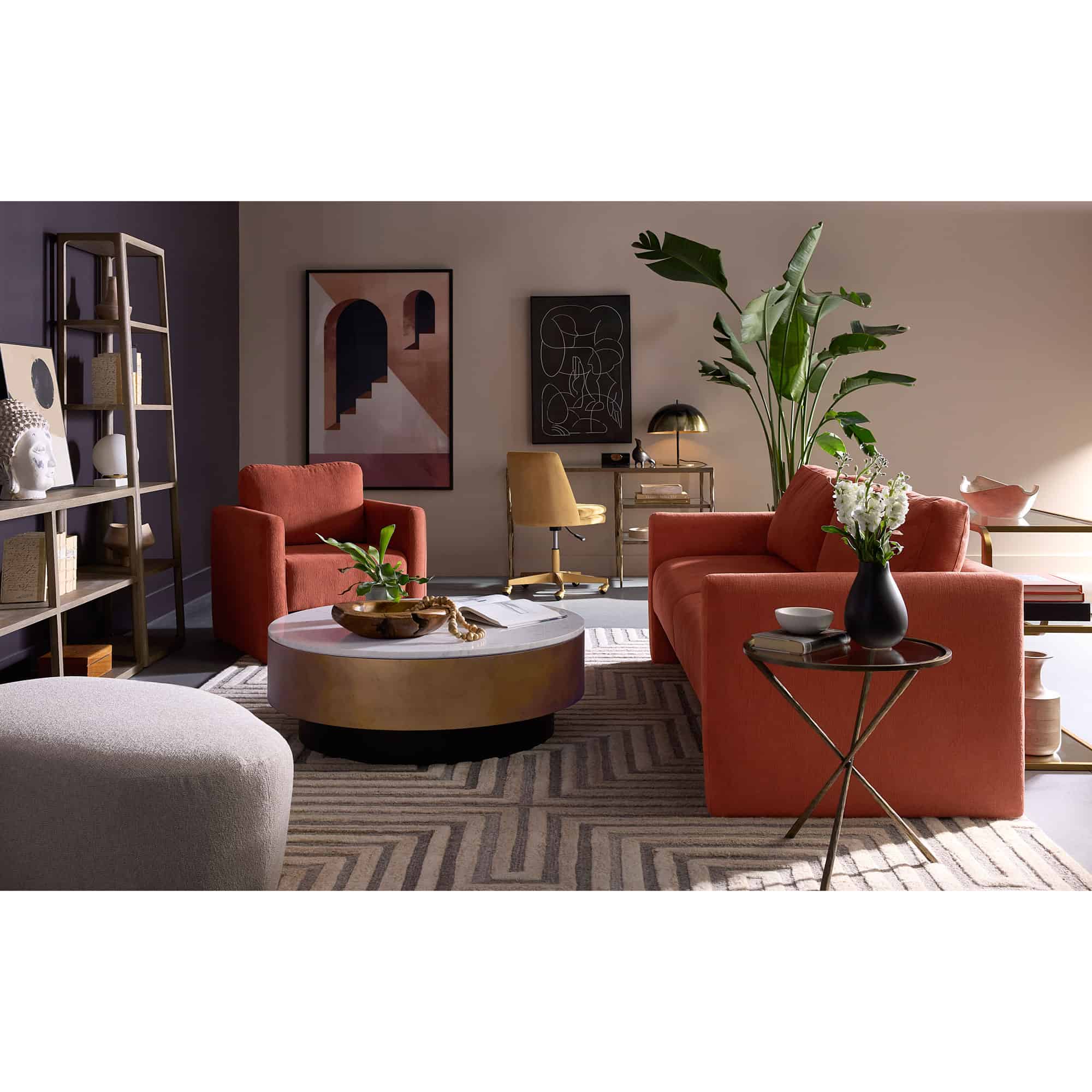 Bold shades of black stand out amongst tan and dusty mauve hues for an interesting play on shading and perspective in this triptych painting from our Luxe Art collection. Sharp geometric stairs contrast with smooth arches, inviting you to get lost in this painting. This piece features reverse painted acrylic with hand embellished copper leaf accents. Finished in a black wood frame. Due to the reflective nature of acrylic, images on site may not capture the artisanal characteristics precisely.