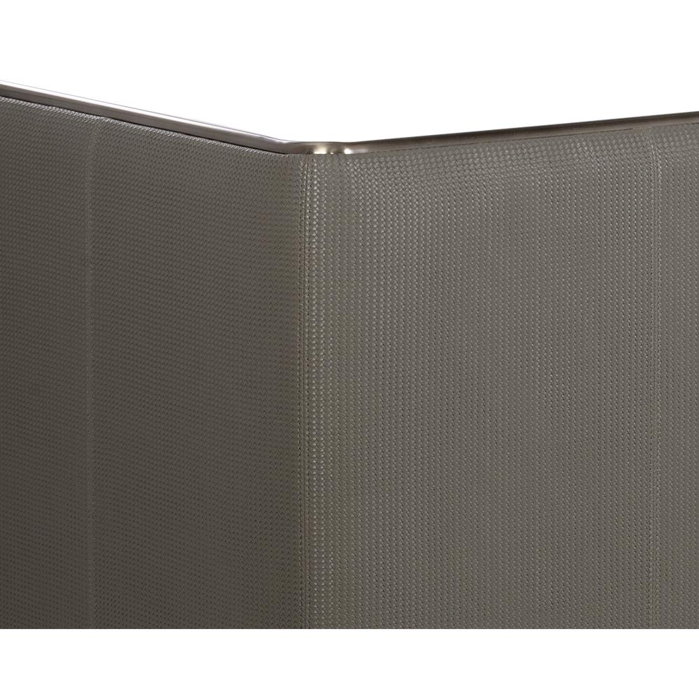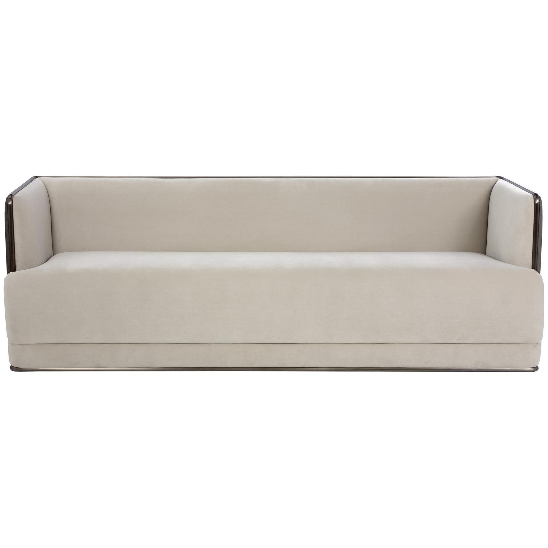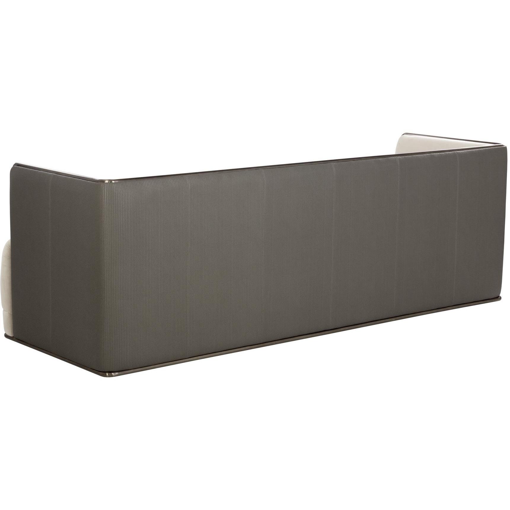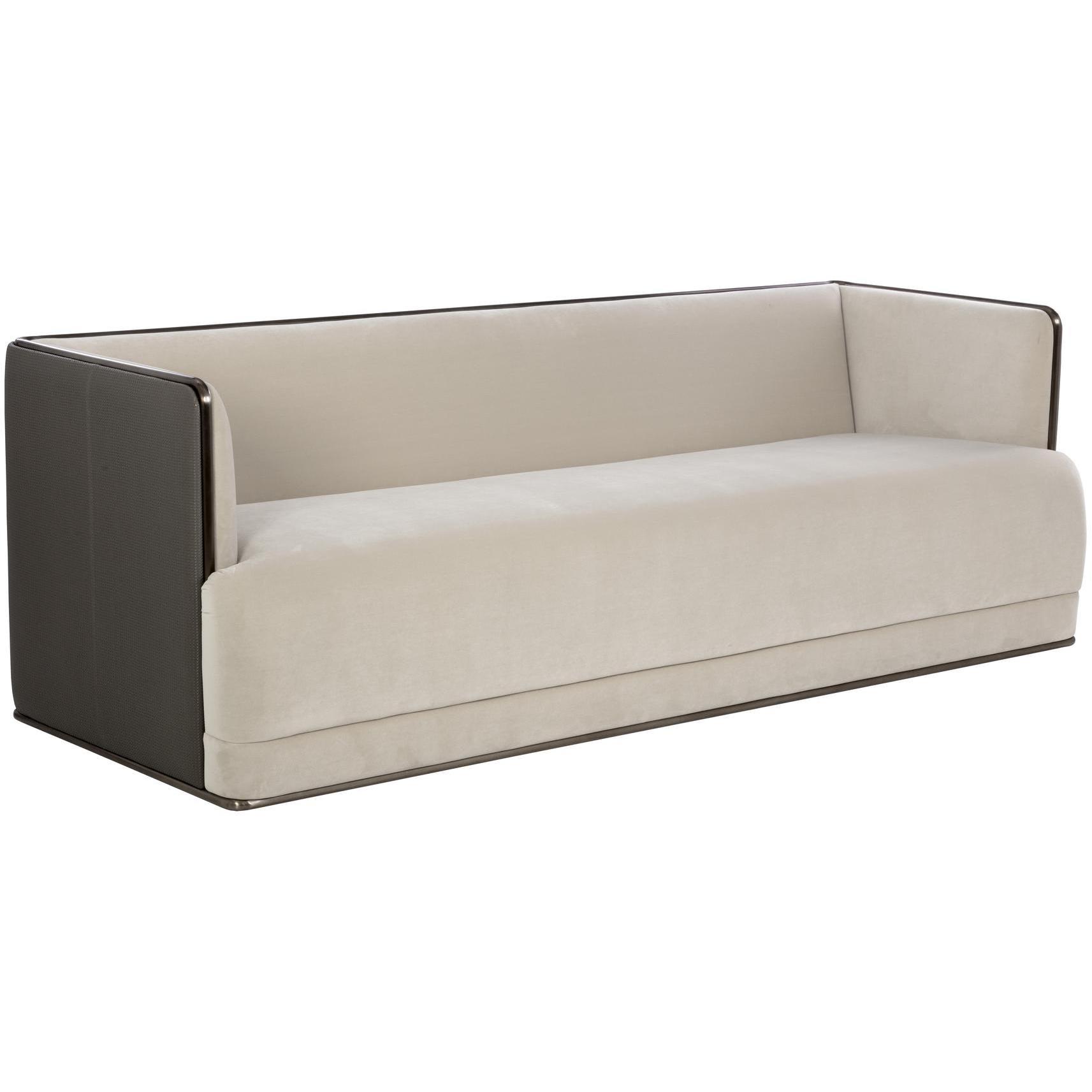 A bold form defines this modern and structured sofa that is guaranteed to turn heads. Features an interior upholstered in meg taupe fabric and an exterior in textured porcini taupe faux leather. Completed with an antique bronze stainless steel frame. Coordinating armchair also available. Handle With Care: This design has been crafted with faux leather. Faux leather is manufactured to reflect the natural characteristics of leather; as such, colour variations, markings wrinkles, grooves, and light scratches are appreciated characteristics. No two pieces will be alike. Visit our Product Care page for more information on how to ensure the lasting beauty of this piece.