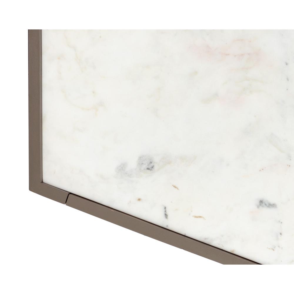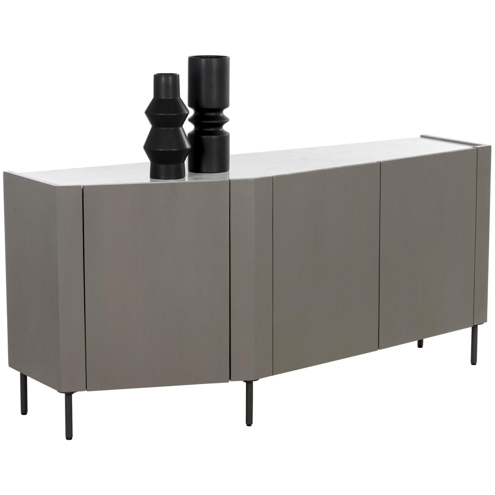 Featuring an angular shape, this unconventional sideboard is designed with modern appeal. Crafted with a grey solid mango wood frame and a white marble top. Black powder-coated steel legs complete the look. As marble is a natural material, unique veining, pitting, fissures, micro-cracks and colour variations are all characteristics that add to the uniqueness and beauty of each piece. Made in India. With refined craftsmanship, this design was brought to life by skilled local artisans. Due to the nature of handcraftsmanship, unique imperfections such as fissures, markings and variations in colour and shape are welcomed and appreciated characteristics for a truly one-of-a-kind piece.