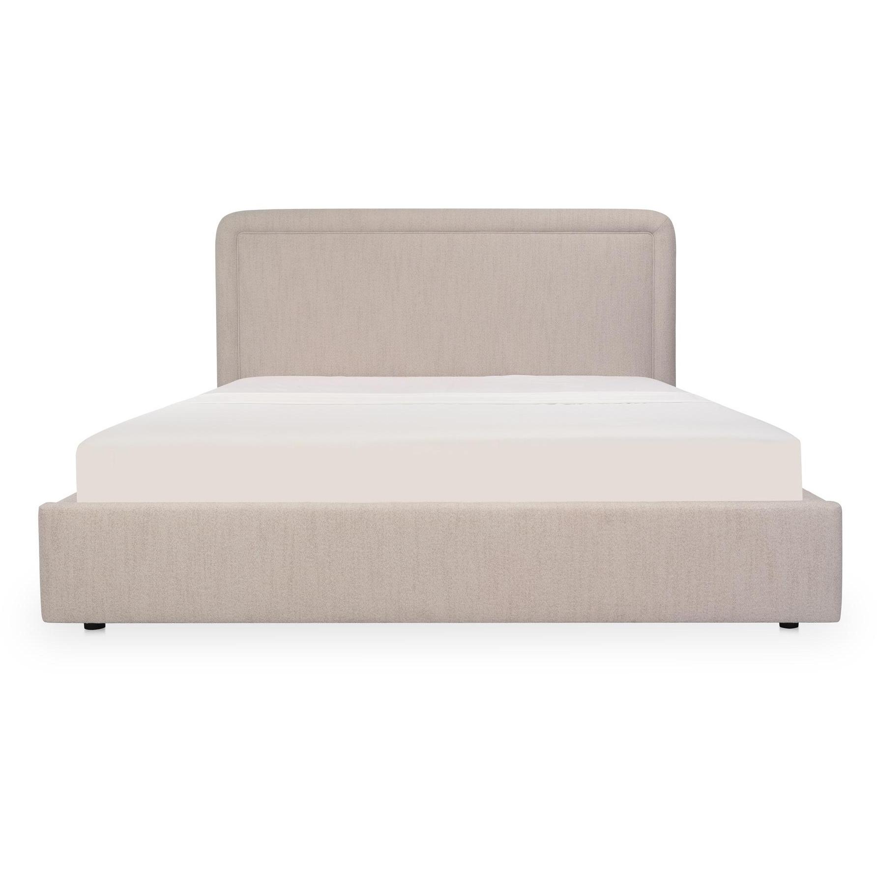 A bed with a hidden trick. The Simon Bed features a rounded silhouette with piped detailing, upholstered in flecked beige polyester for softness and durability. The full footboard pulls forward to reveal storage divided into two panels, keeping essentials organized without clutter. Built with engineered wood, solid wood, and MDF, Simon turns practical storage into part of the design story.