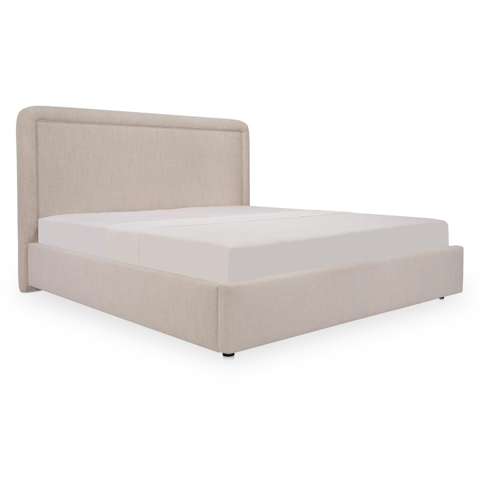 A bed with a hidden trick. The Simon Bed features a rounded silhouette with piped detailing, upholstered in flecked beige polyester for softness and durability. The full footboard pulls forward to reveal storage divided into two panels, keeping essentials organized without clutter. Built with engineered wood, solid wood, and MDF, Simon turns practical storage into part of the design story.