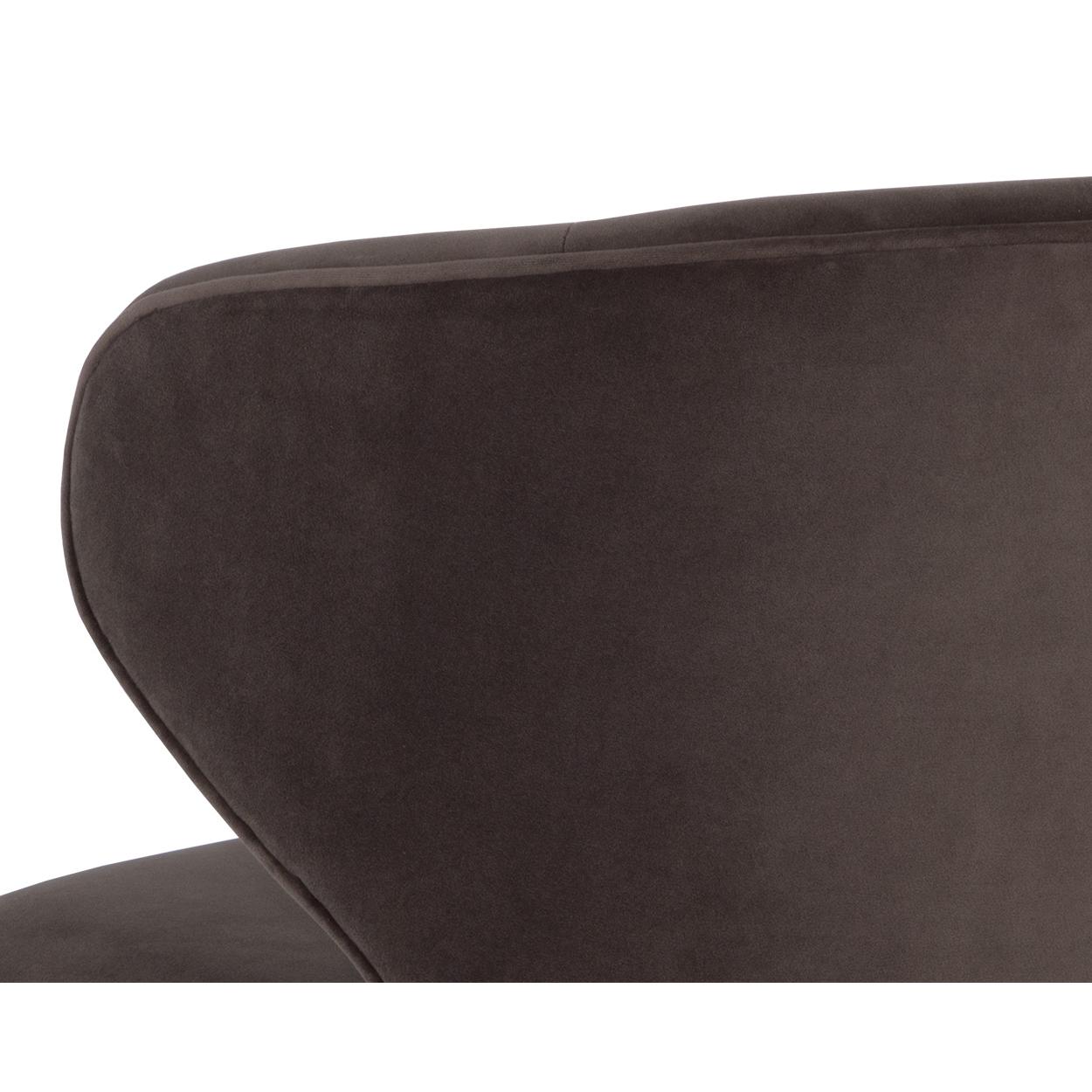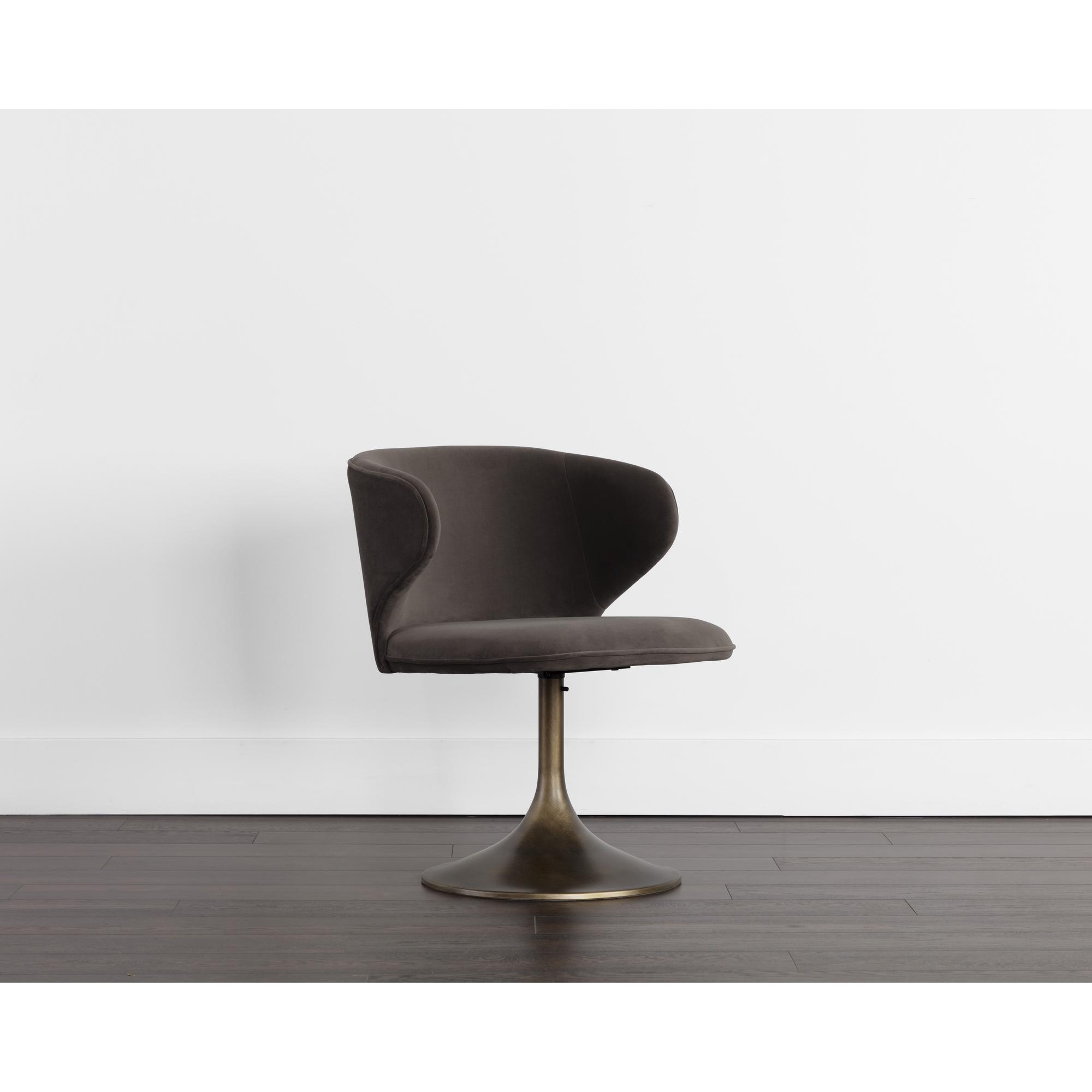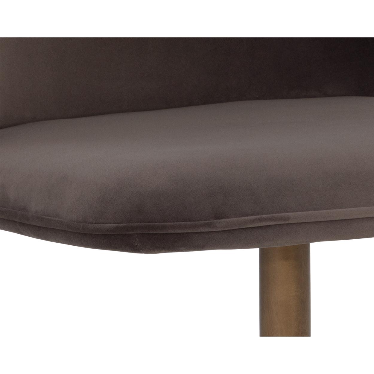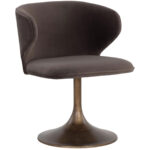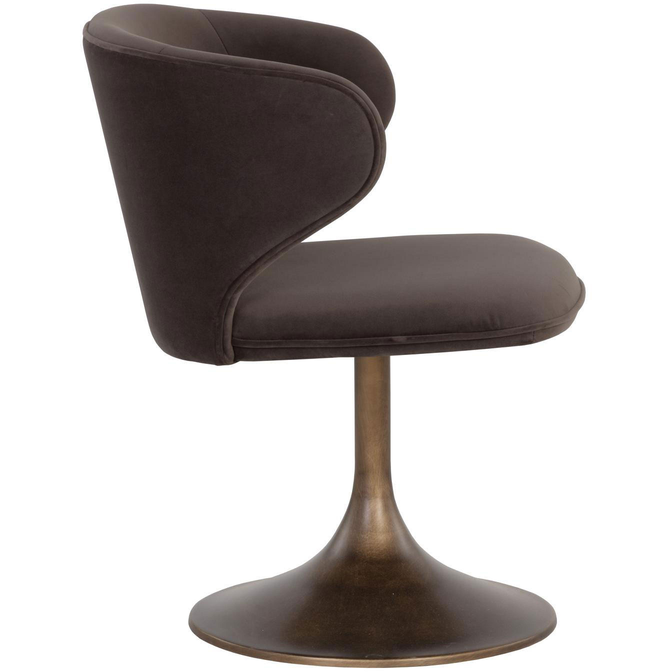 Create a captivating dining space with this eye-catching swivel dining chair that has a contemporary flair. Stocked in meg ash fabric and completed with a round, antique brass stainless steel base. Also available in casablanca cloud fabric.
