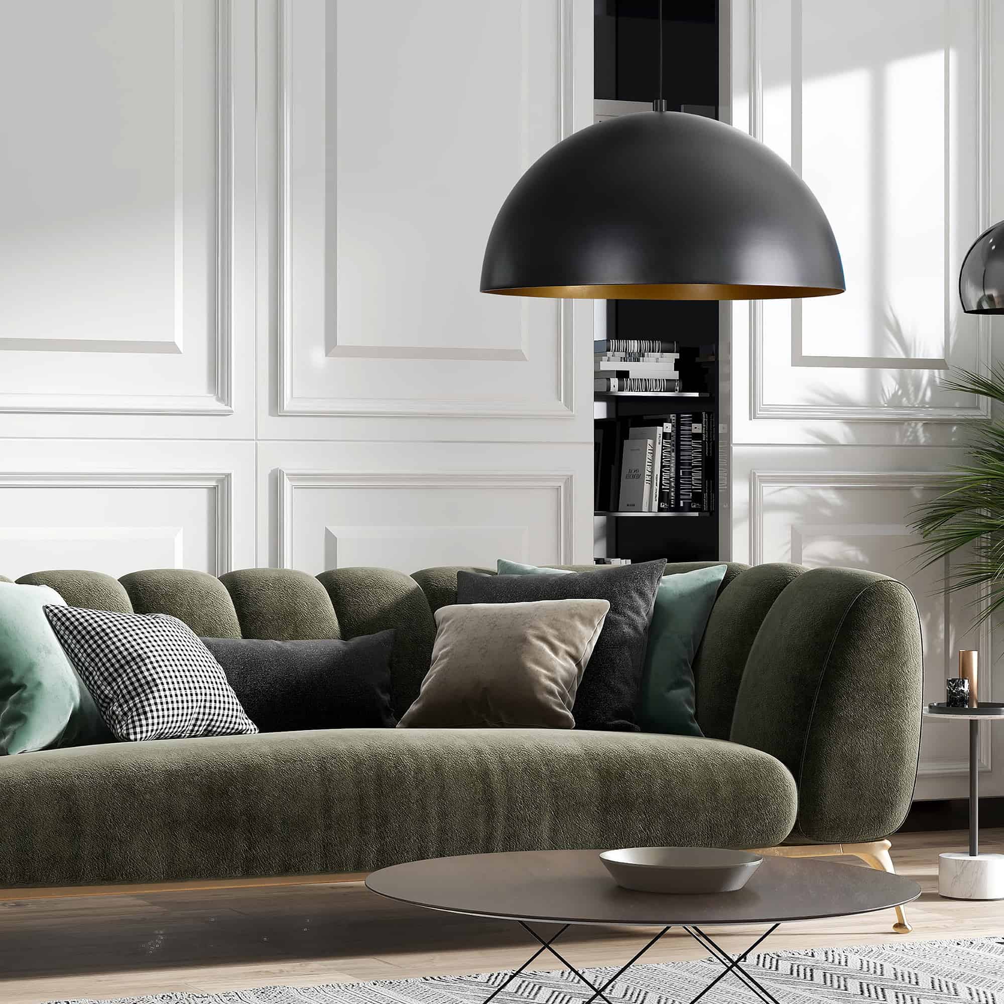 Dark and warm energies collide in a stylish fashion with this ceiling fixture. Hanging in the industrial kitchen or dining space, its aluminum matte black outer shade and matte gold inner shade complement the style of the space.