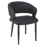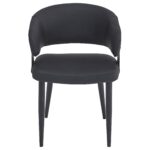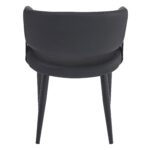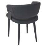 Push the style limits with this curved back chair. The bucket-inspired back will envelop you in comfort while the seat will hold you for hours of seated conversation. Black metal detail on the frame, and black metal legs provide a sturdy base for the textured faux leather upholstery. Use for casual dining spaces, or for more formal lounge or dining settings. These chairs are suitable for residential or commercial use.