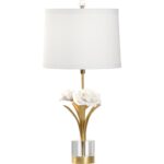 Hand formed white porcelain roses on gold leaf iron stems with a crystal mount.