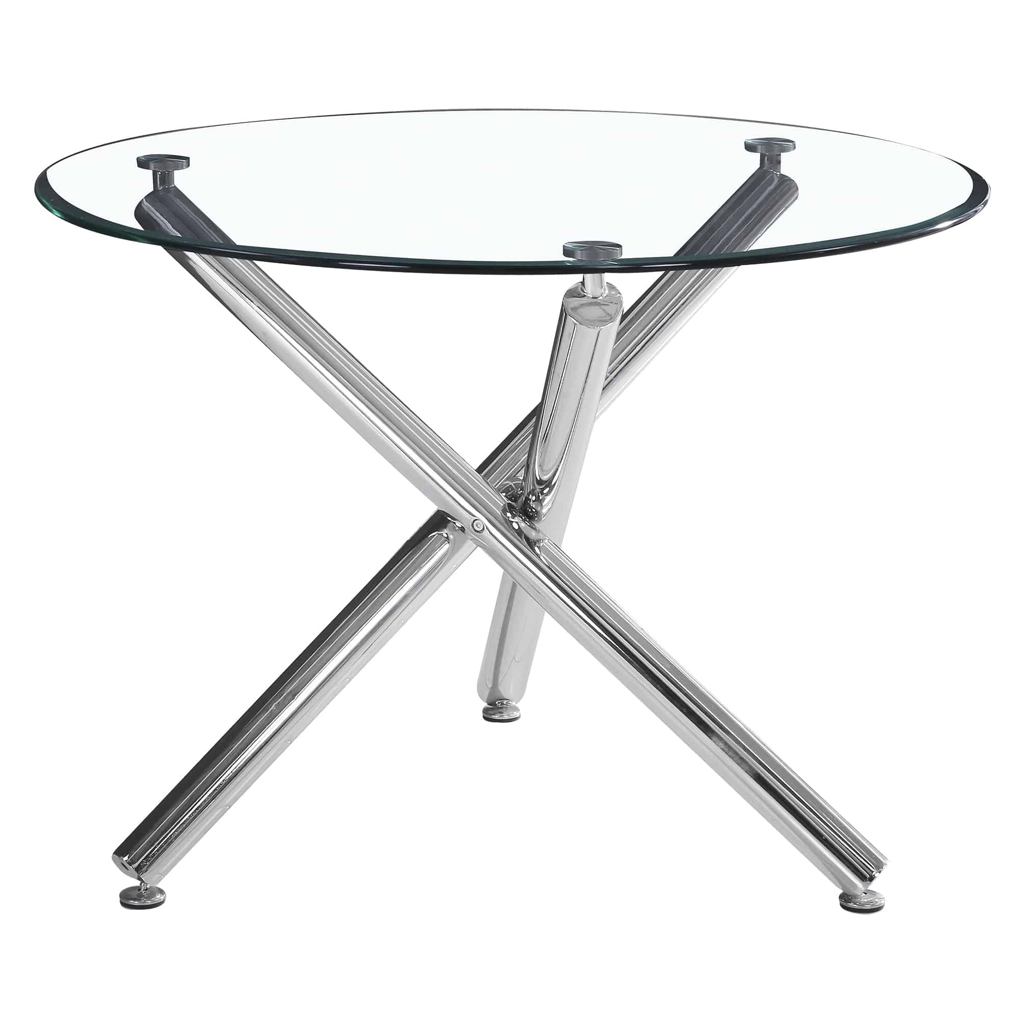 Contemporary beauty that is ideal for small spaces. The clear glass top and airy design create the impression of space. Chromed metal legs provide sturdy support. Great for casual dining. Composed of wood, faux leather, and metal, this side chair is a show stopper all its own. With its curved wood seat frame, seat cushion covered in faux leather upholstery with stitching details on the back, and chrome-finished metal legs, this chair unifies a multitude of elements all into one perfectly composed design. The comfortable seat allows for hours of conversation around the dinner table, while the slim, tapered look of the metal legs adds a splash of sophisticated design.
