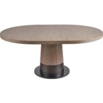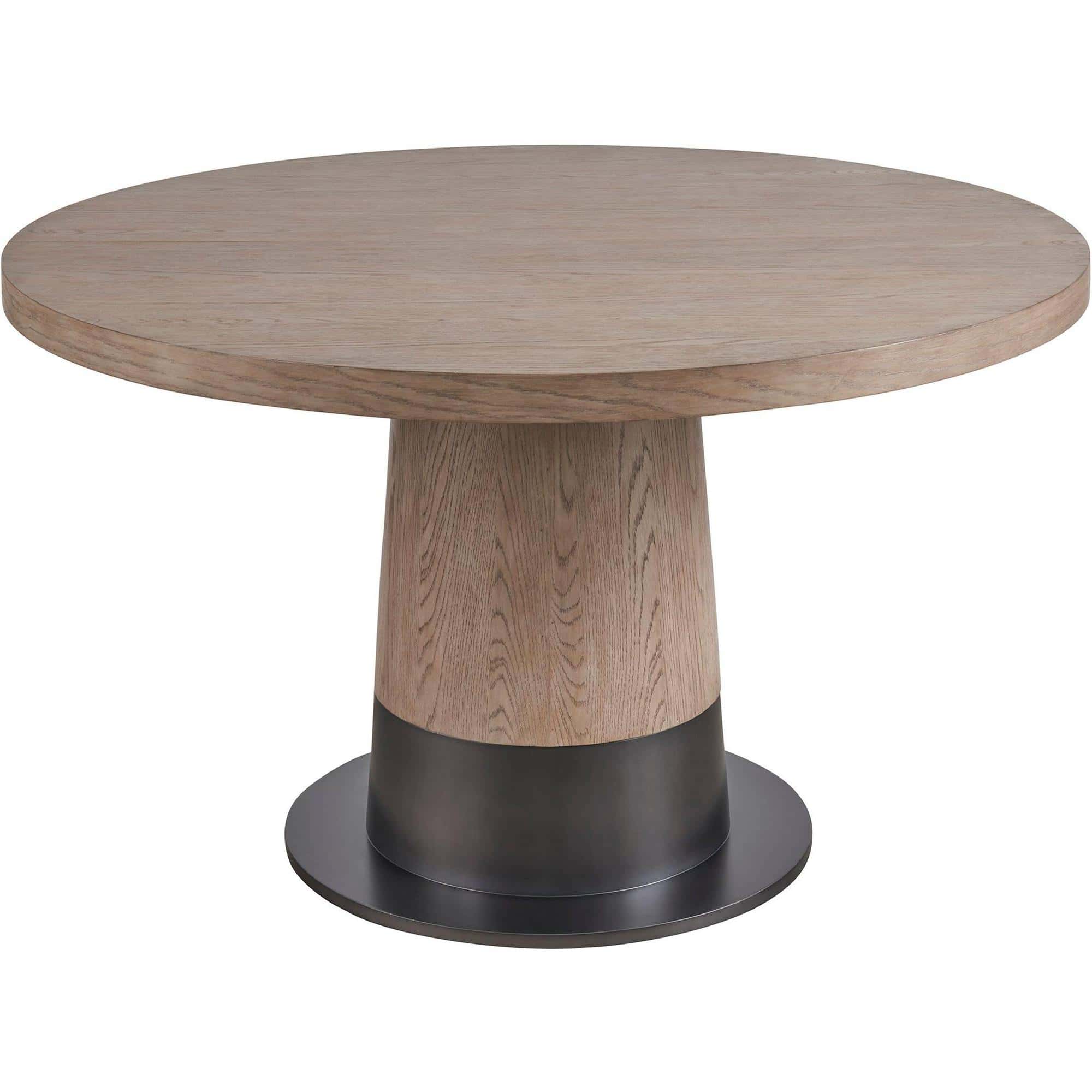 The Solara Dining Table showcases an intriguing two-tone aesthetic, blending the warmth of a Gray Oak finish with the cool, aged character of a Satin Pewter metal base. This rounded table harmoniously combines textures and hues, infusing spaces with a cool, dynamic vibe and a nod to mid-century design sensibilities.