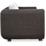 The Soma outdoor sofa finds a graceful interplay of form and purpose. Its dark brown finished PE synthetic wicker frame and sunproof, heathered Olefin fabric cushions exude poise and durability. Curved, playful arms and quick-dry foam invite relaxation while ensuring timeless panache.