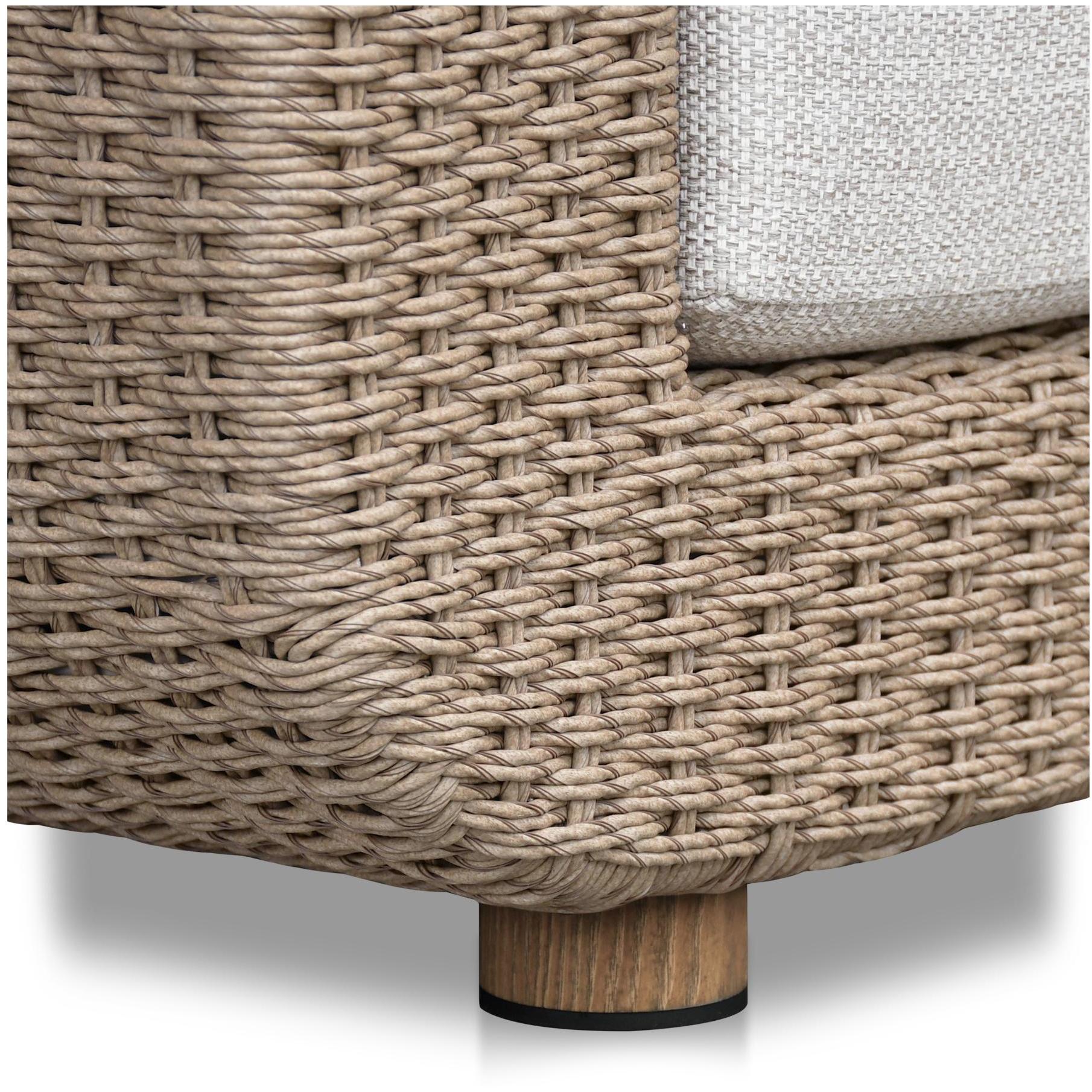 The Soma outdoor sofa finds a graceful interplay of form and purpose. Its natural finished PE synthetic wicker frame and sunproof, heathered Olefin fabric cushions exude poise and durability. Curved, playful arms and quick-dry foam invite relaxation while ensuring timeless panache.