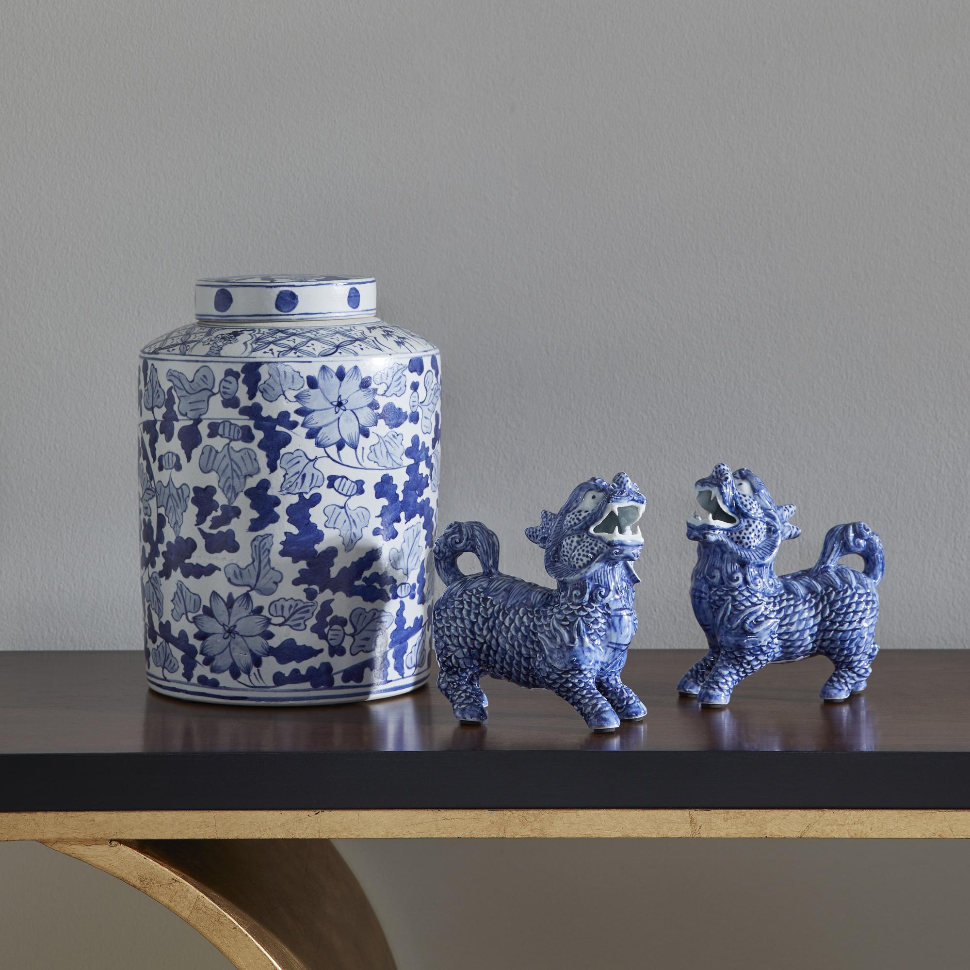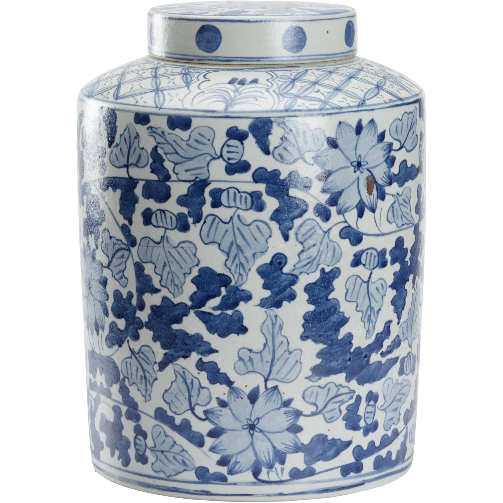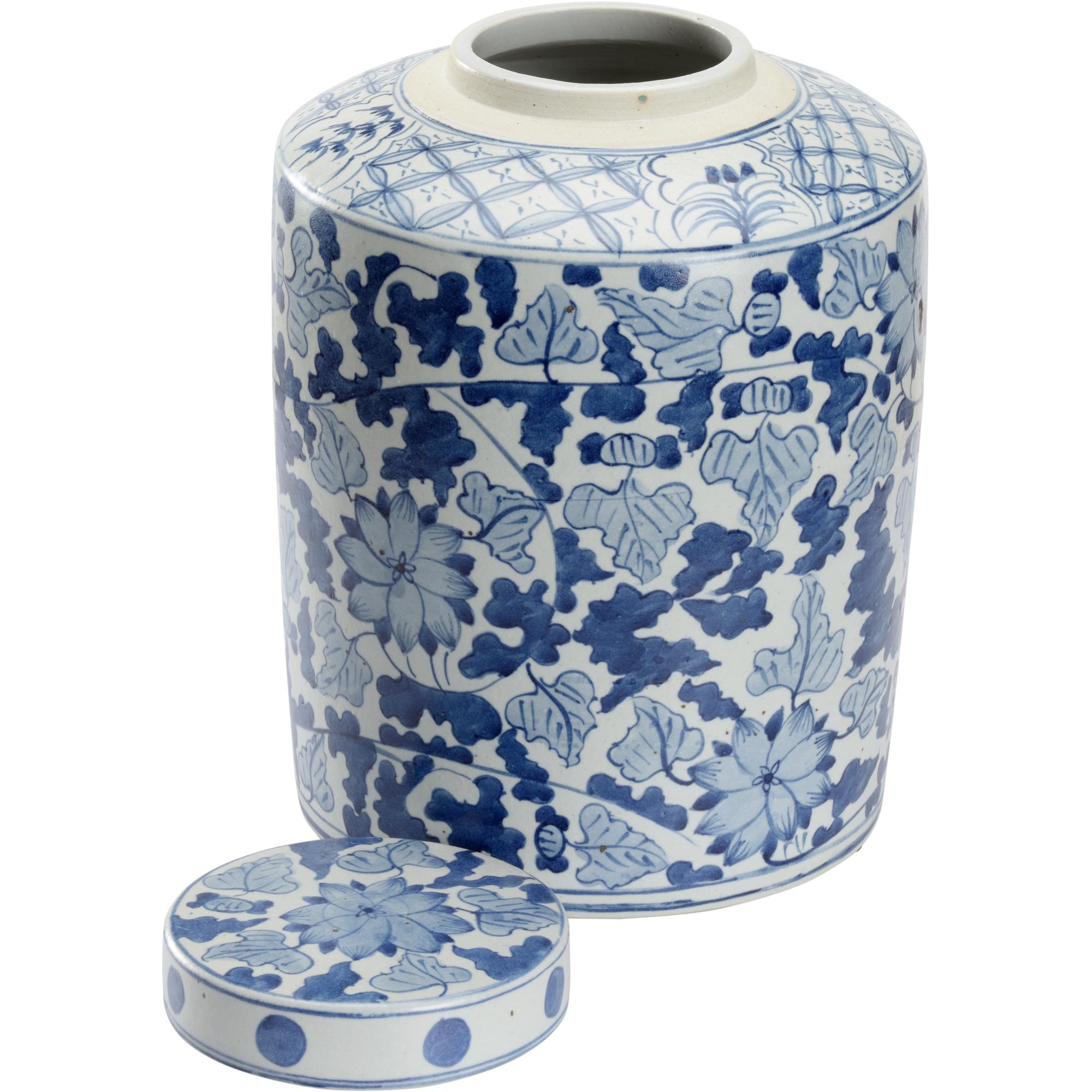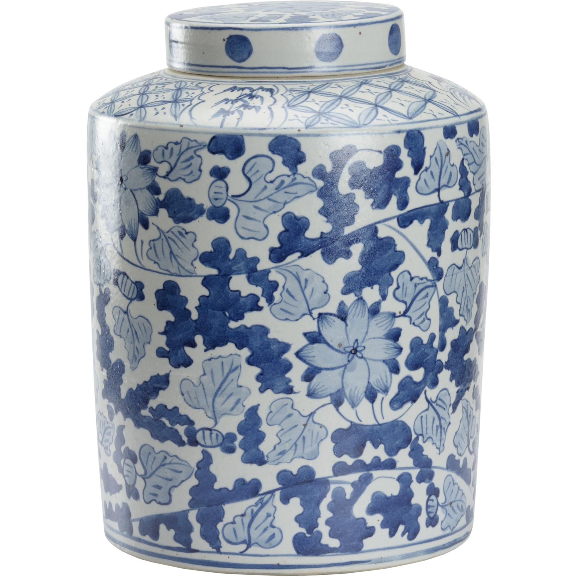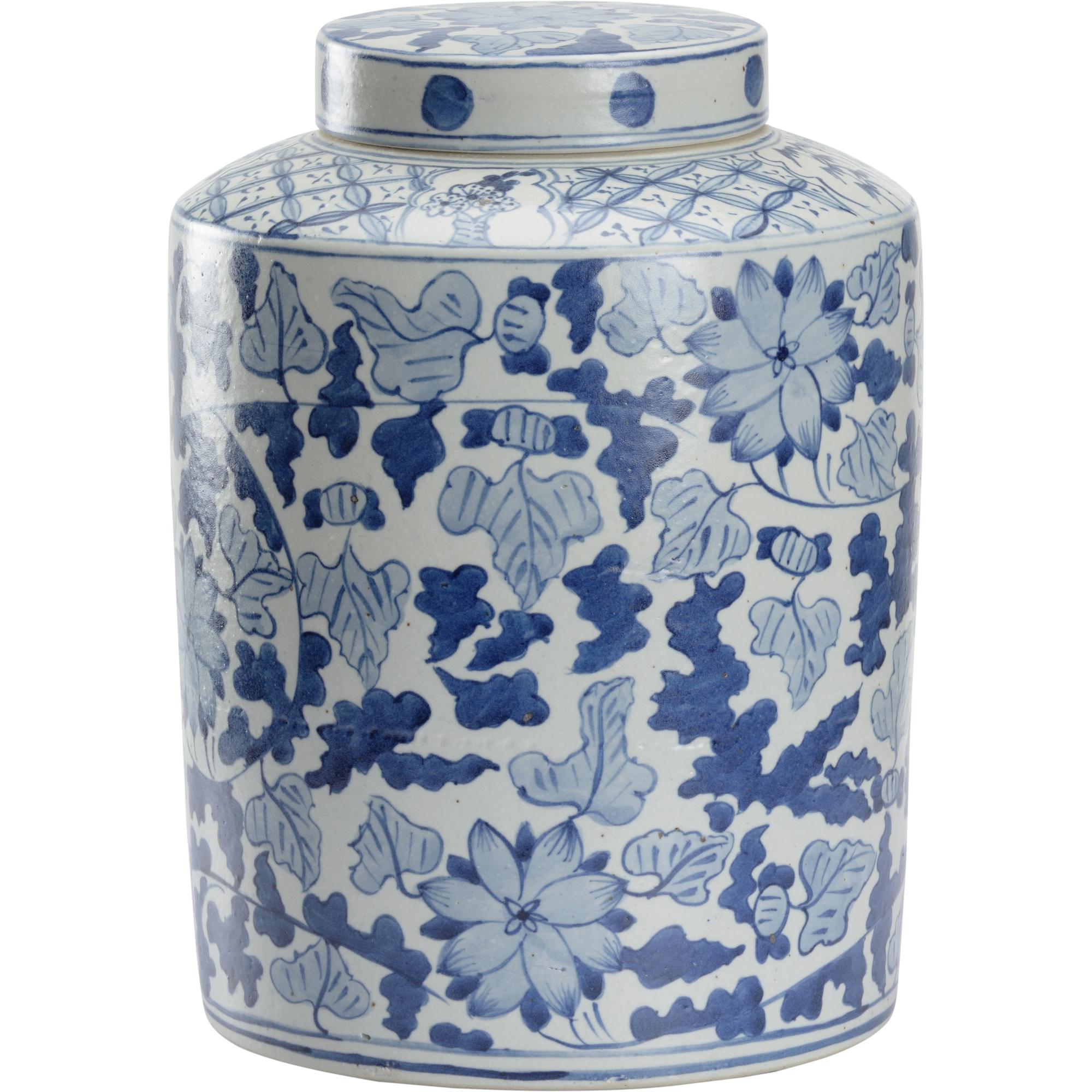 A large classic chinoiserie motif in a favorite shade of blue and white, the Song Leaf Ginger Jar is perfect by itself or paired with many.