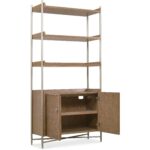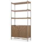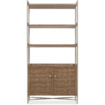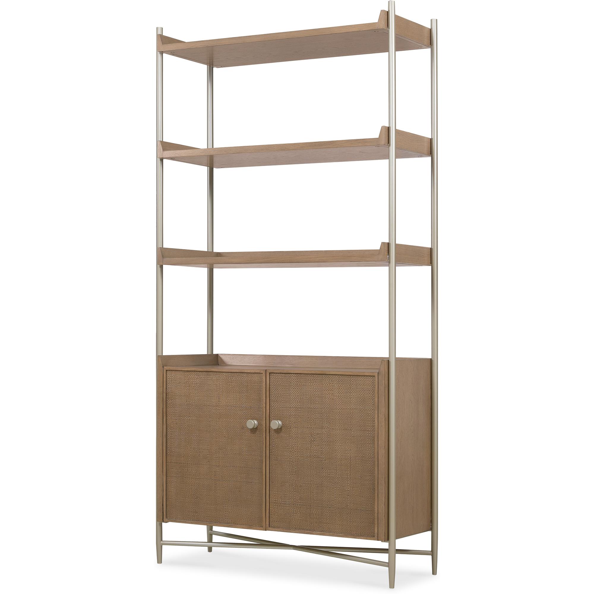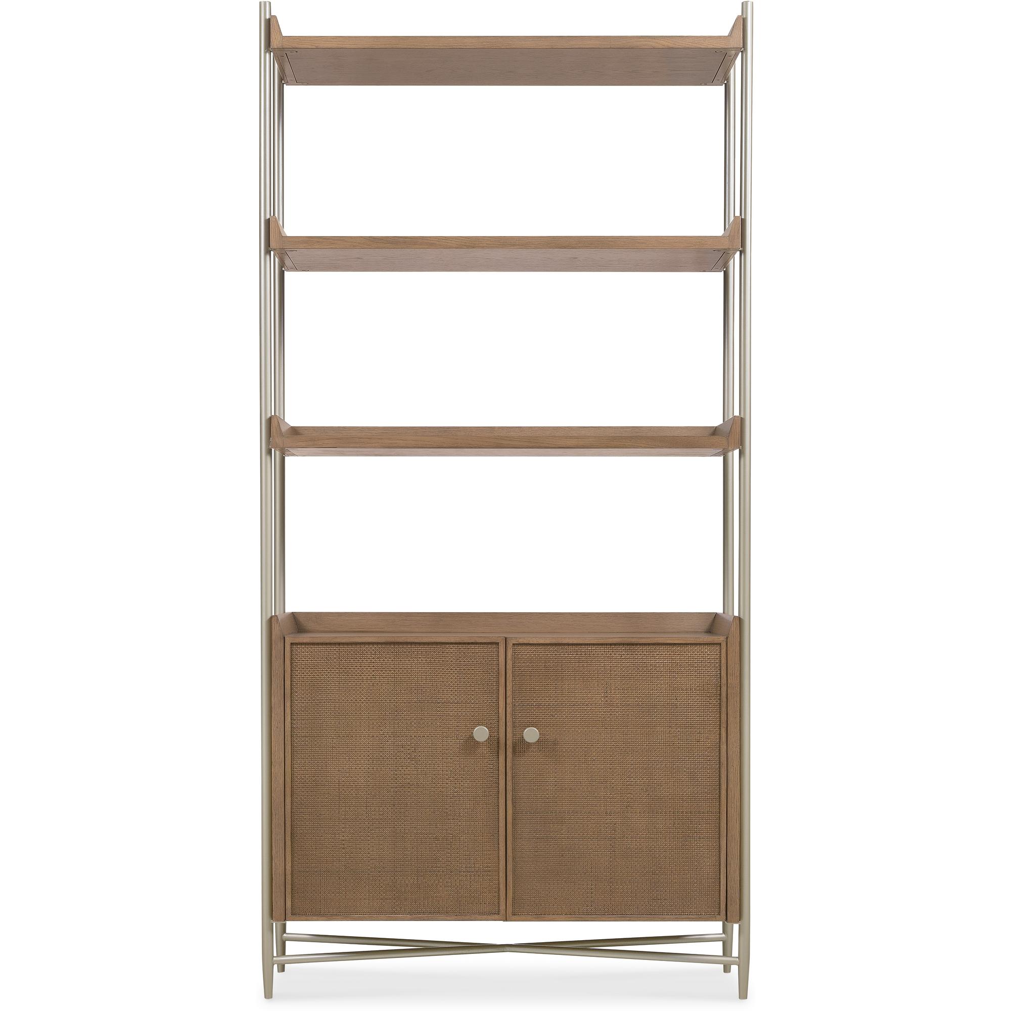 Features: Two fixed wood shelves with gallery backs Two wood framed doors with cane fronts, soft close hinges and magnetic door catches One adjustable wood shelf behind doors Metal frame, stretcher and tapered legs
