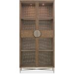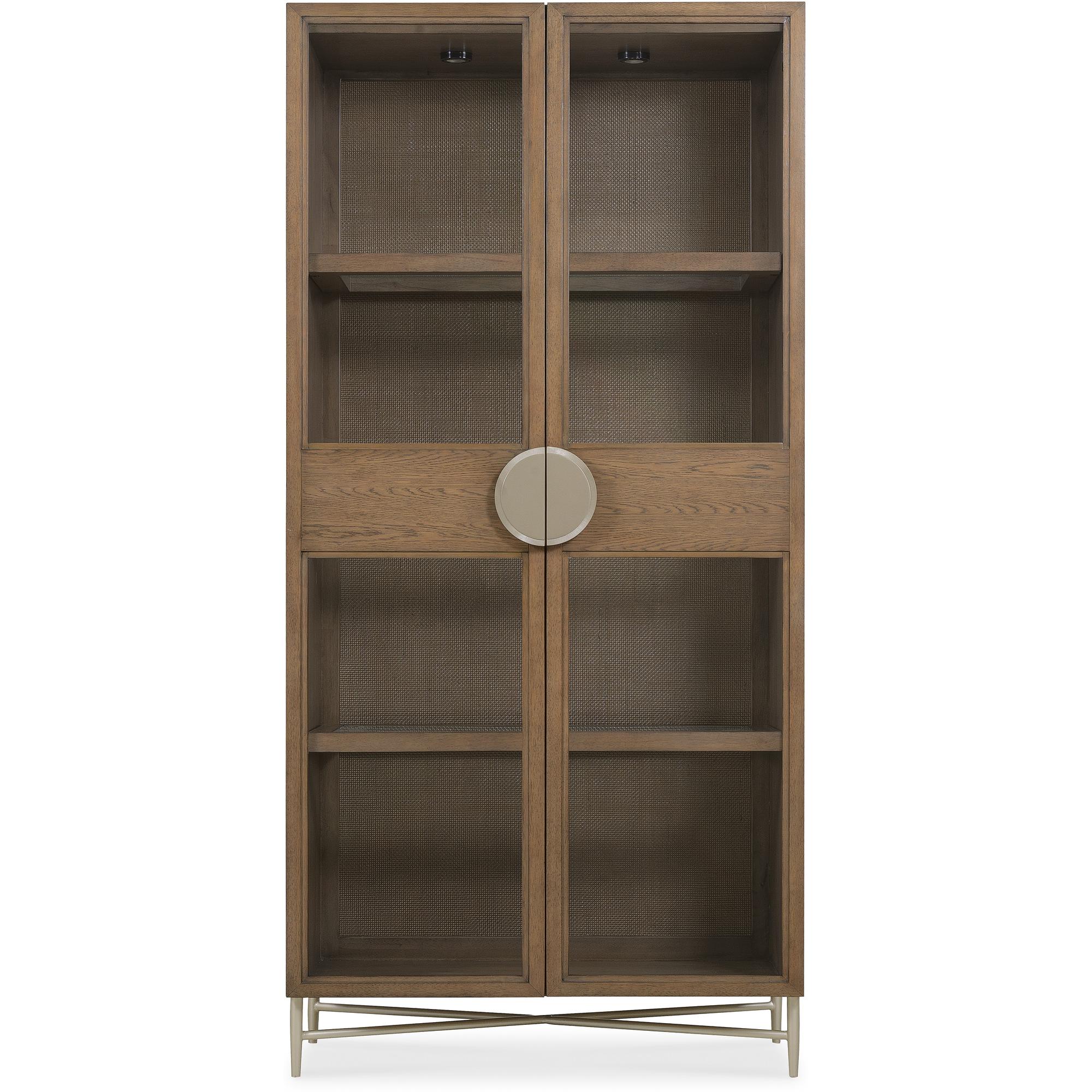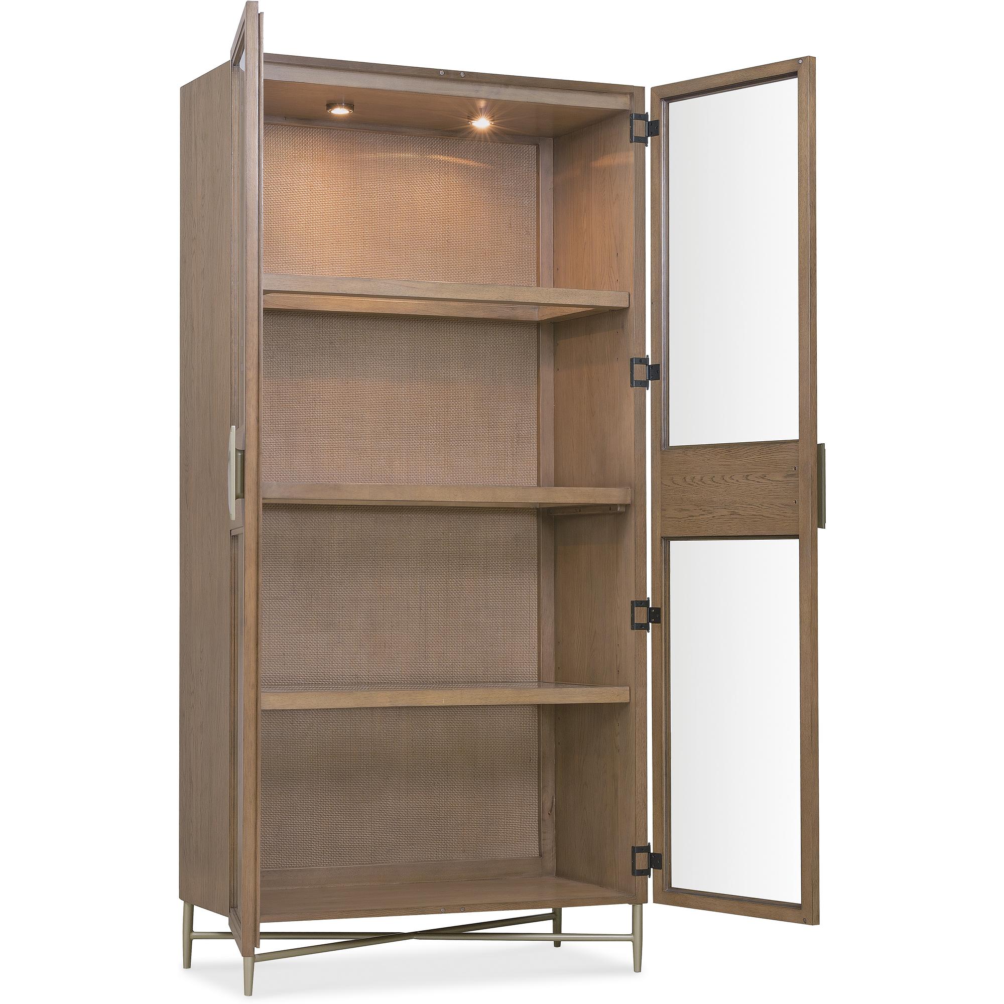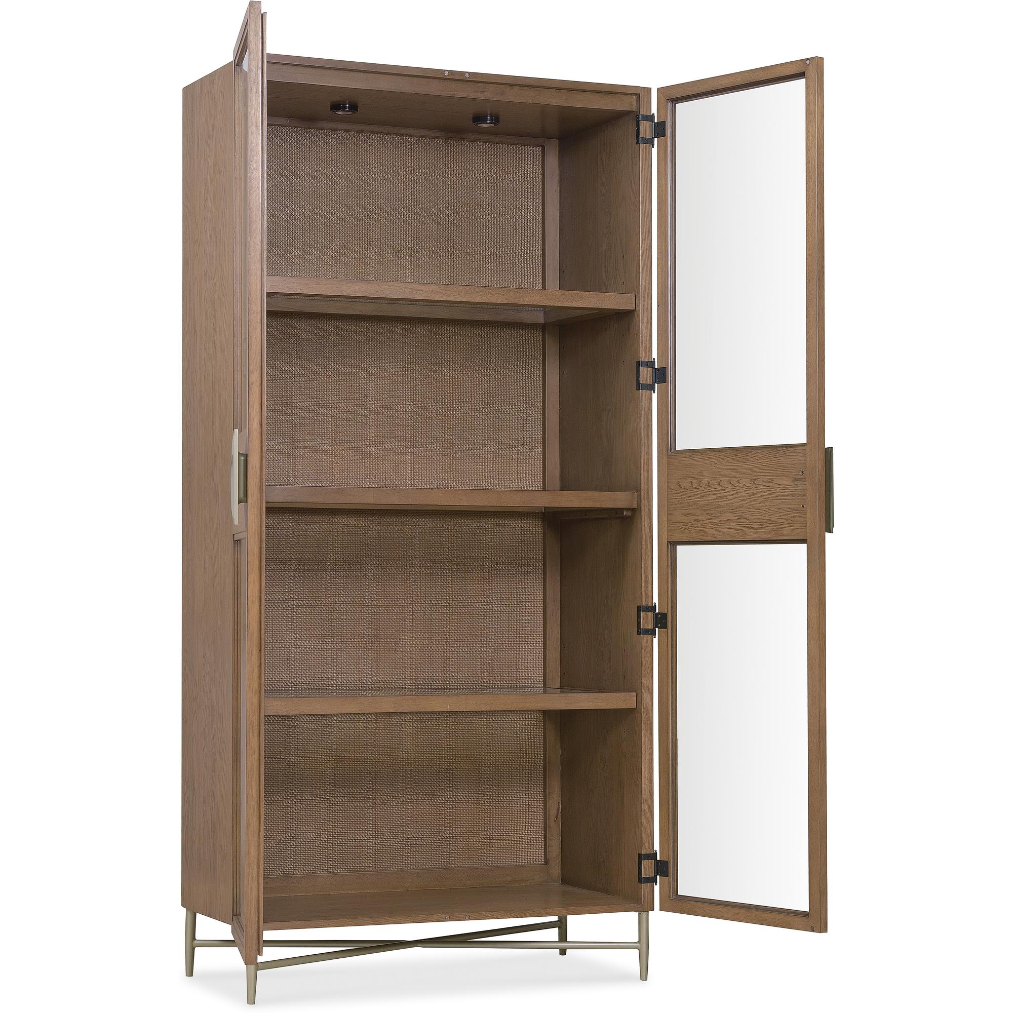 Features: Two wood framed doors with tempered glass Two lights with three intensity touch switch located on right side of back panel Top and bottom shelves are adjustable wood framed tempered glass shelves Middle shelf is a fixed wood framed tempered glass shelf Back panel is cane Metal base, stretcher and tapered legs