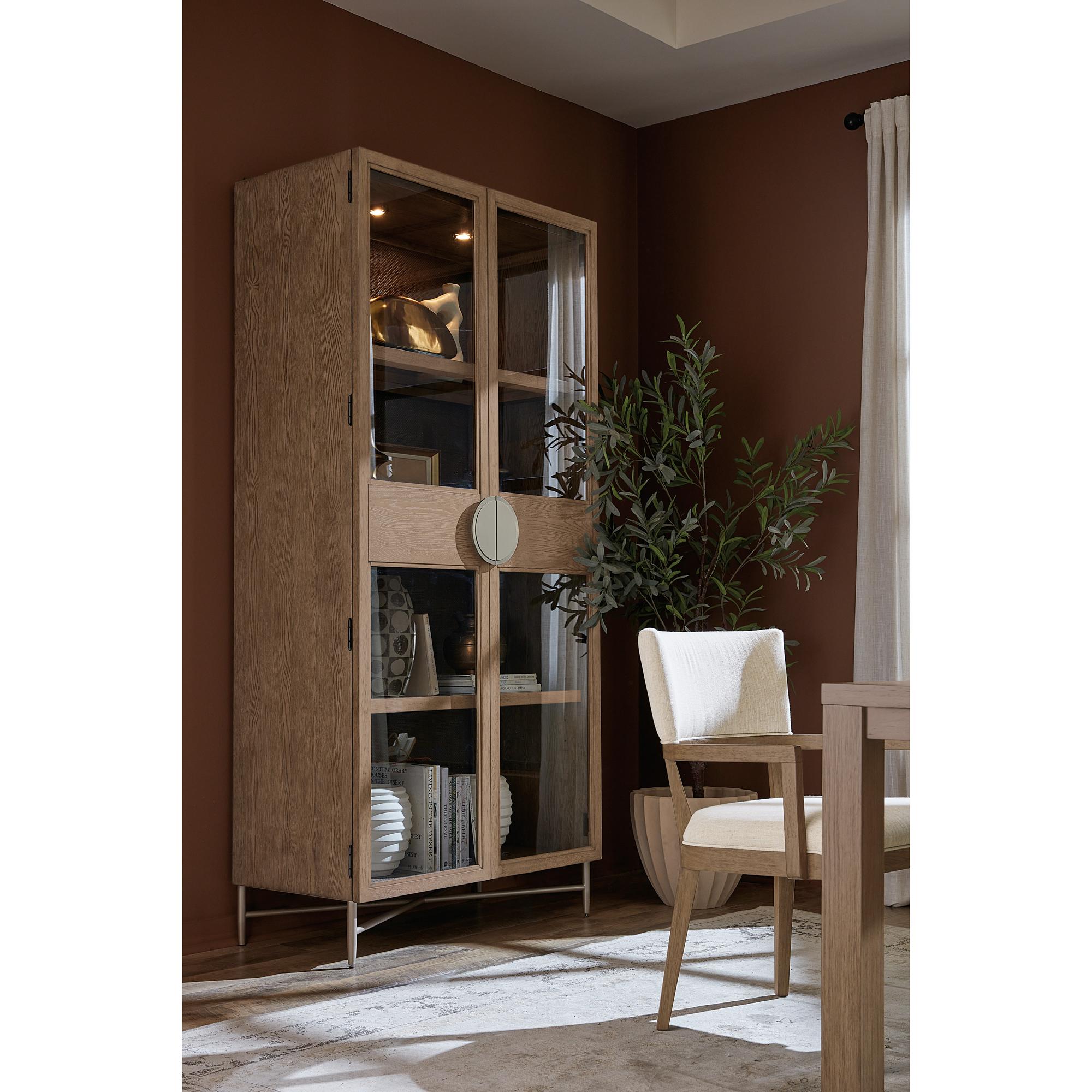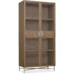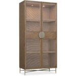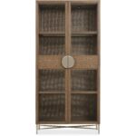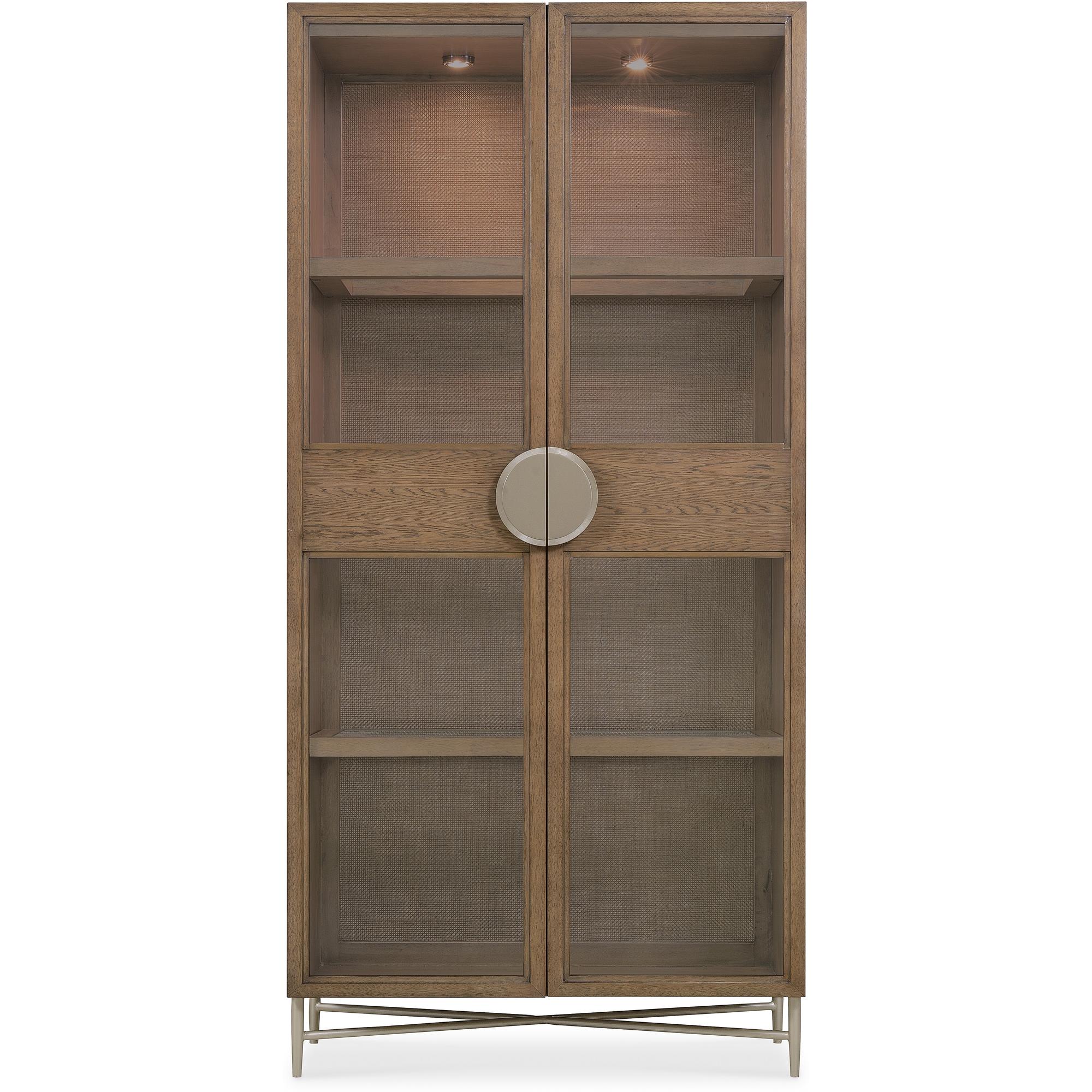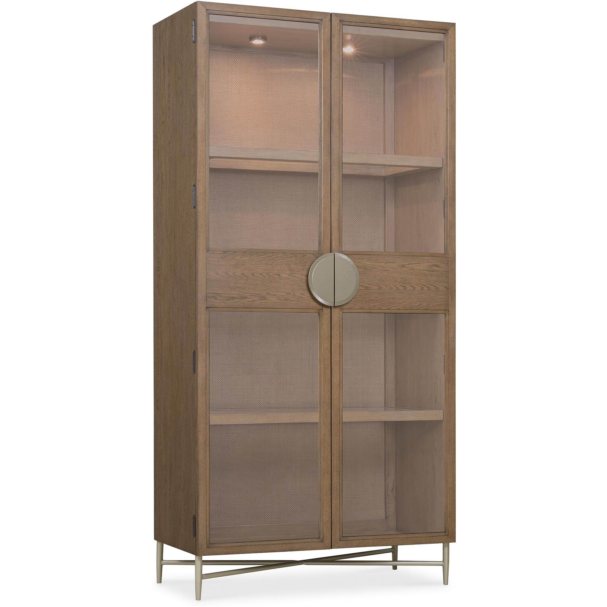 Features: Two wood framed doors with tempered glass Two lights with three intensity touch switch located on right side of back panel Top and bottom shelves are adjustable wood framed tempered glass shelves Middle shelf is a fixed wood framed tempered glass shelf Back panel is cane Metal base, stretcher and tapered legs