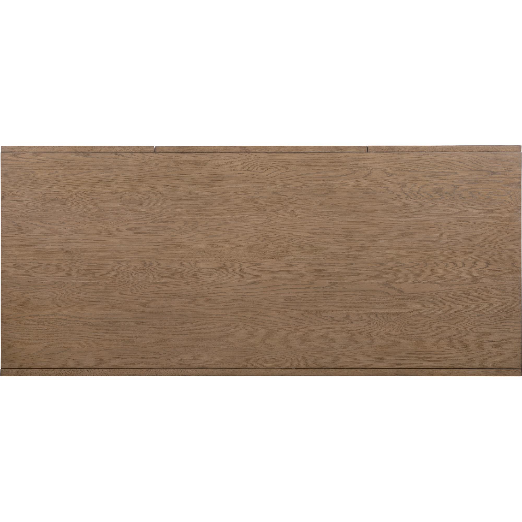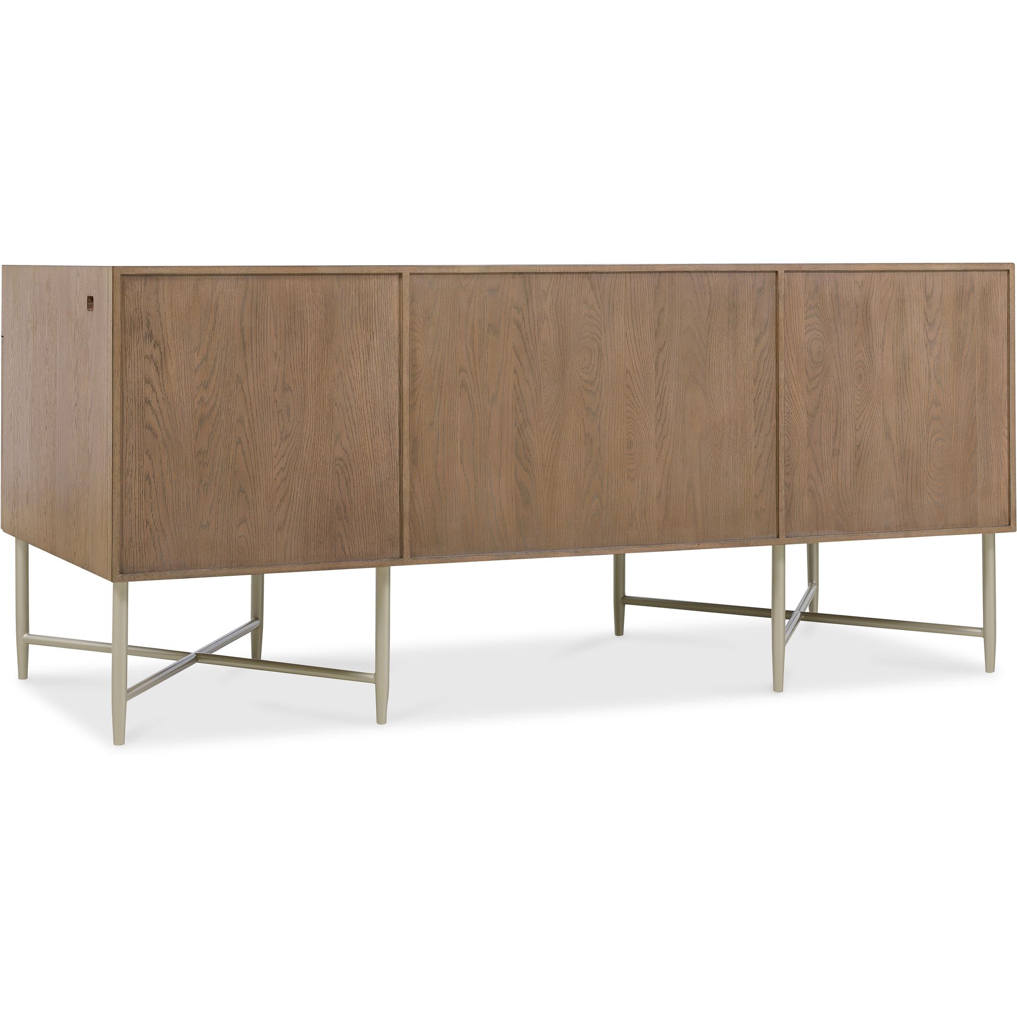 Finish: Wren: quartered and cathedral-cut white oak veneers in a light earthen-toned finish. Matching woven split cane drawer fronts. Satin-finished knobs and metal.