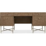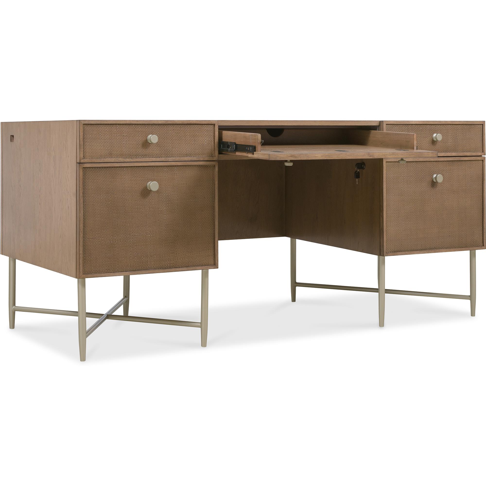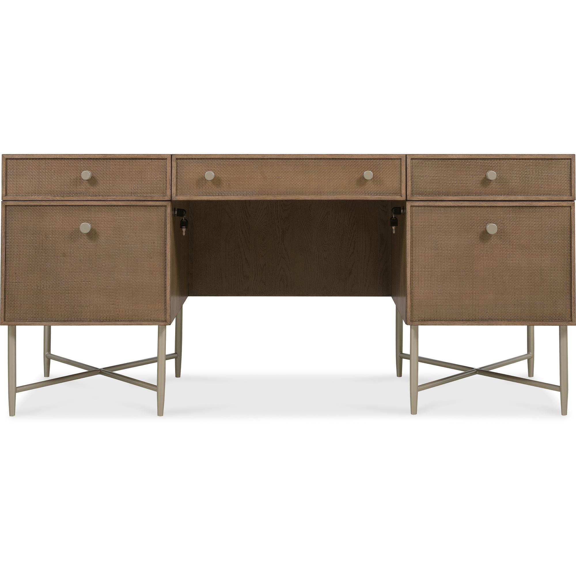 Features: Five drawers with cane inset fronts Removable/interchangeable writing surface and pencil tray can be used in either right or left top drawer Each of the top side drawers have two removable partitions Center drawer with drop-front writing surface and wire management Two locking file drawers with pendaflex letter/legal filing system Grommet on side for wire management Metal base, stretchers and tapered legs Cane front drawers