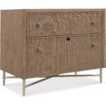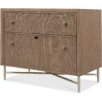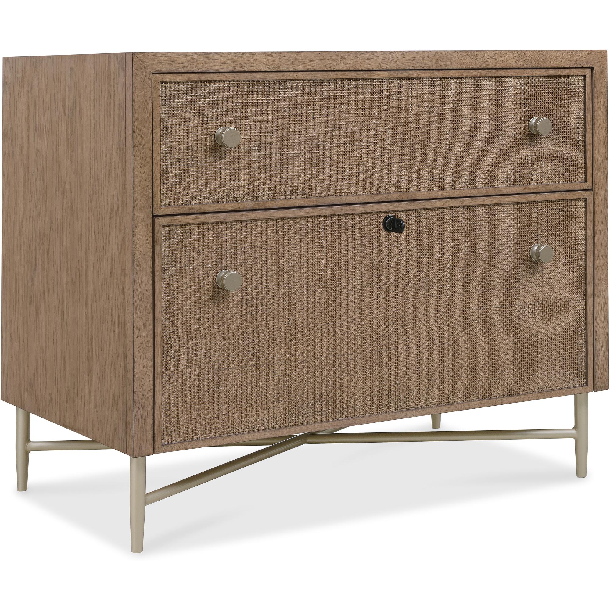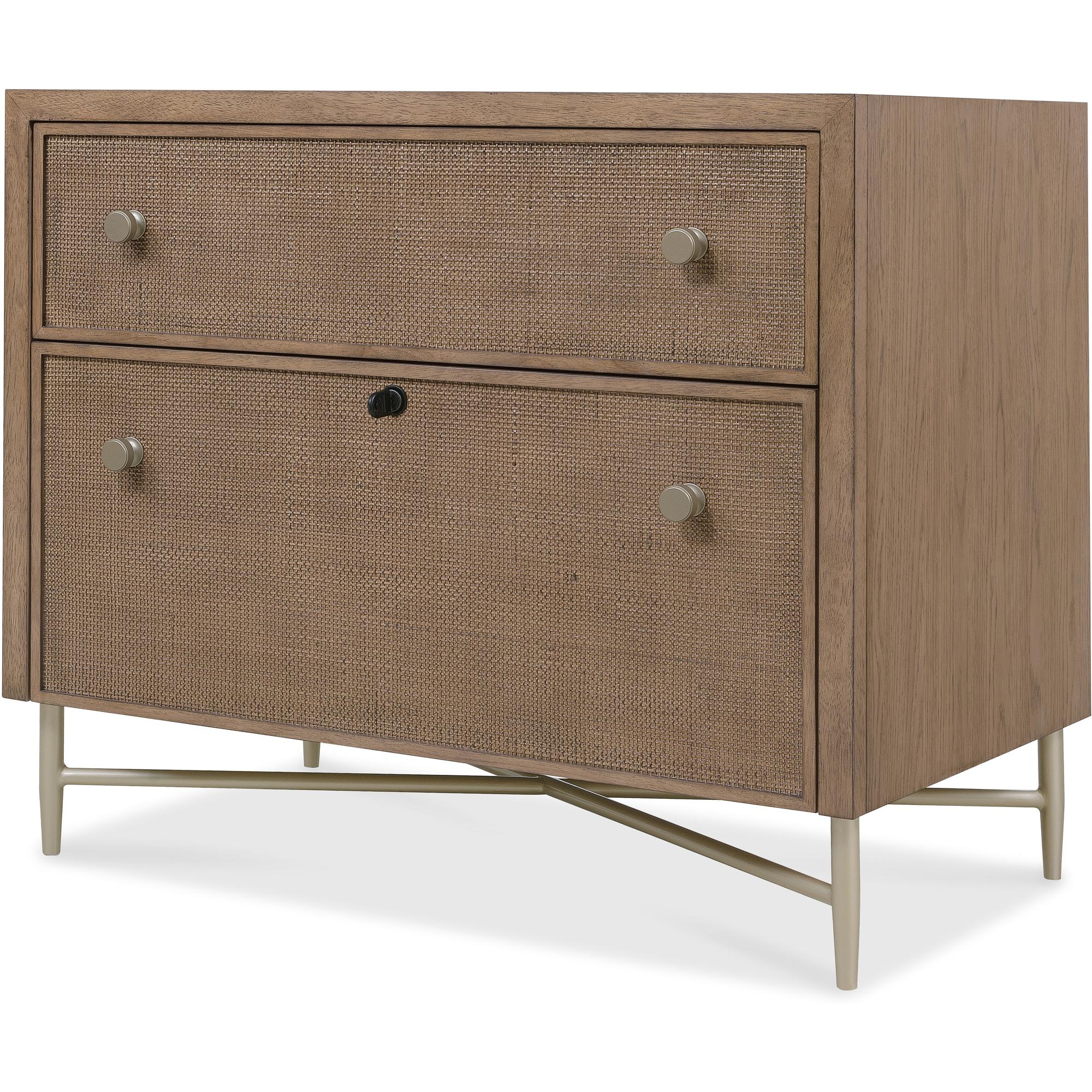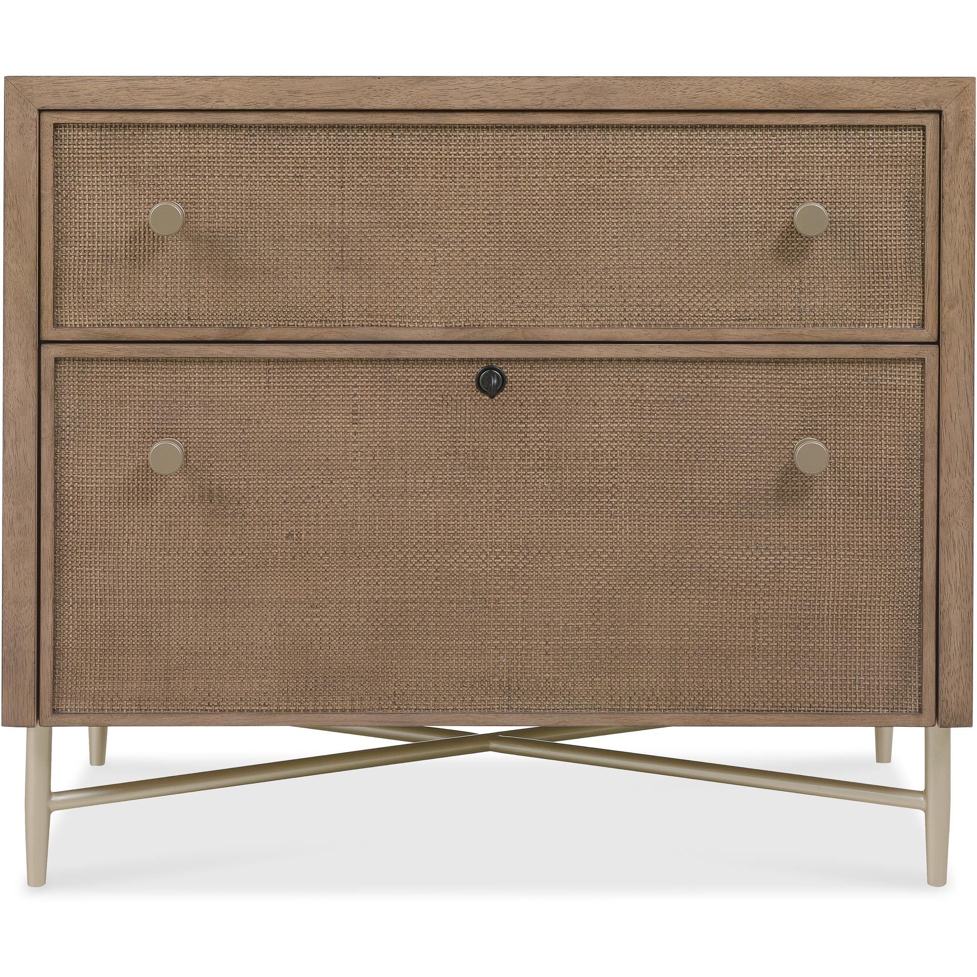 Features: Two drawers Top drawer is a utility drawer with cane front Bottom drawer is a locking file drawer with letter/legal filing option with a cane front Metal base and legs