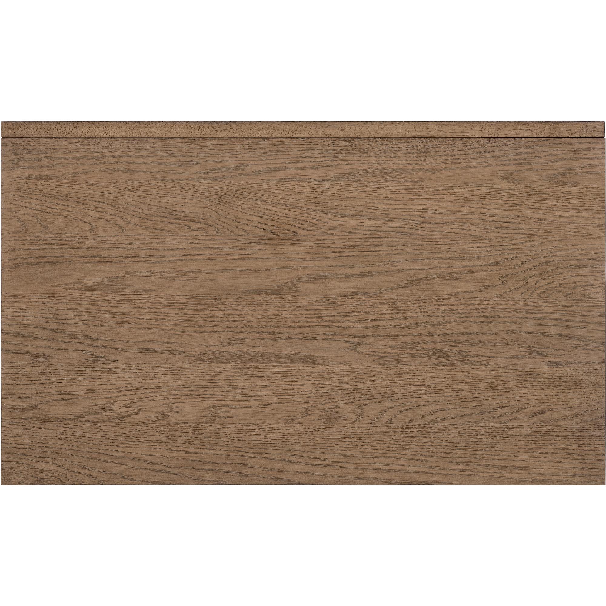 Finish: Wren: quartered and cathedral-cut white oak veneers in a light earthen-toned finish. Matching woven split cane drawer fronts. Satin-finished knobs and metal.
