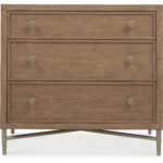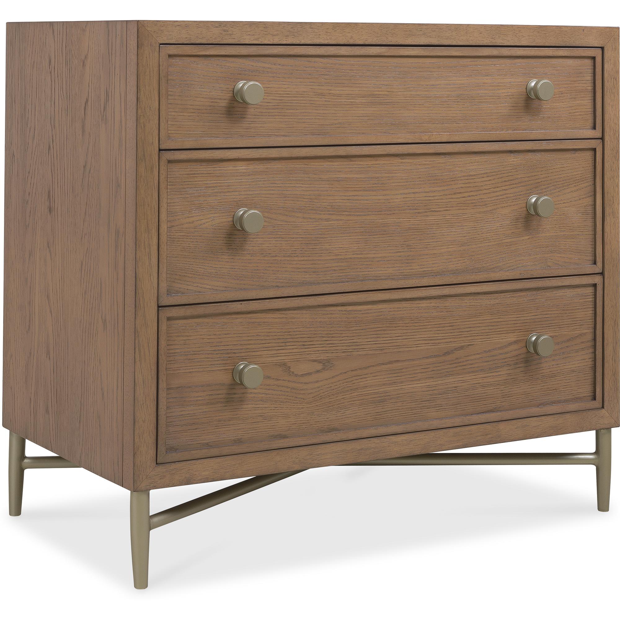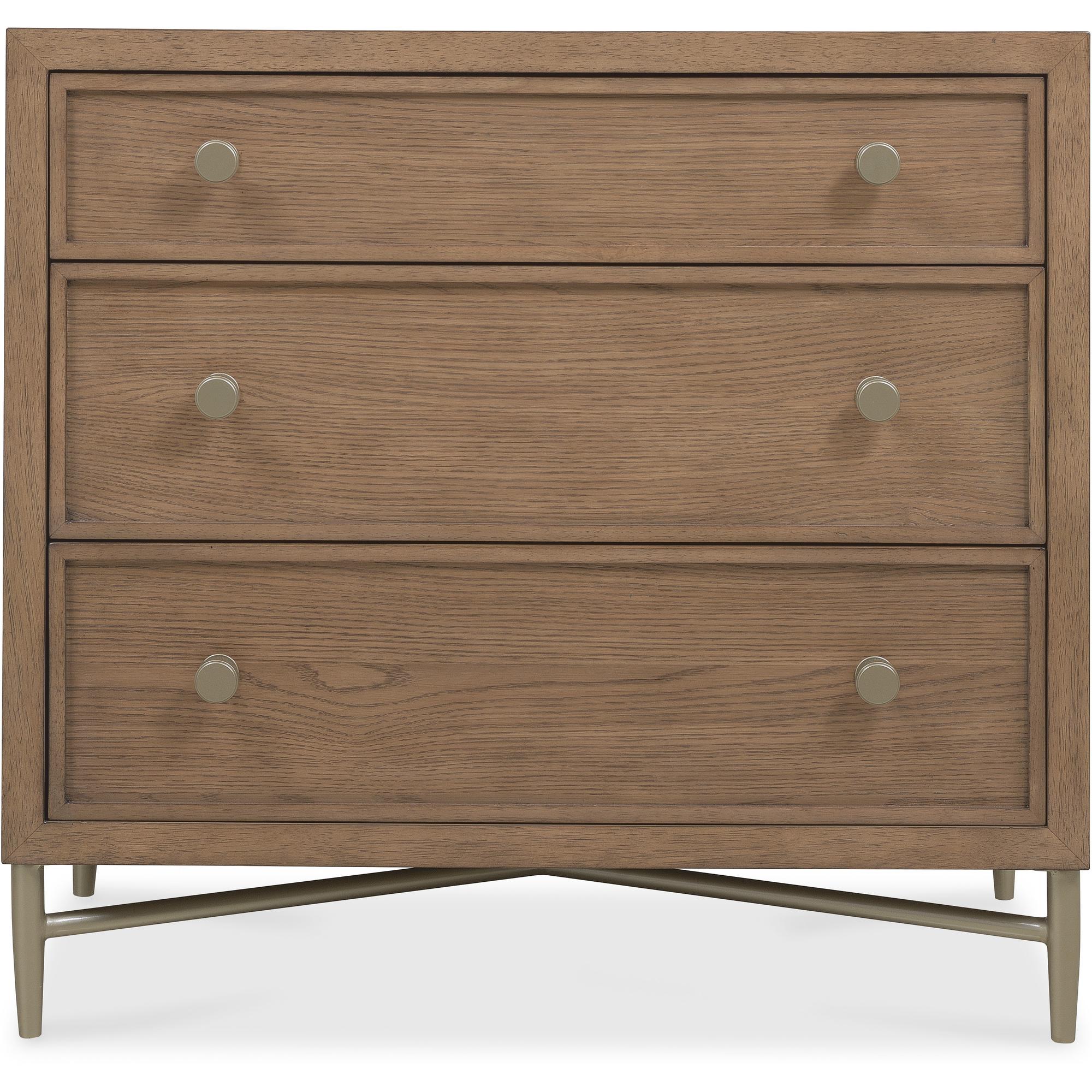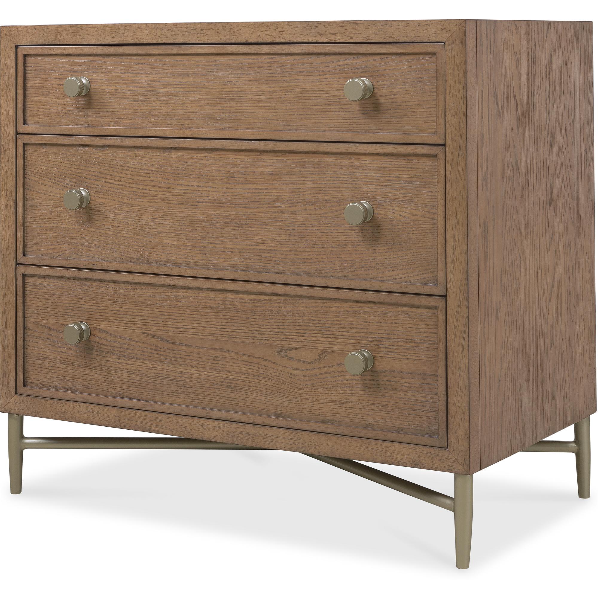 Features: Three self-closing drawers Top drawer has cream-colored removable drop-in felt liner Cord clip on back Metal base, stretcher and tapered legs