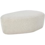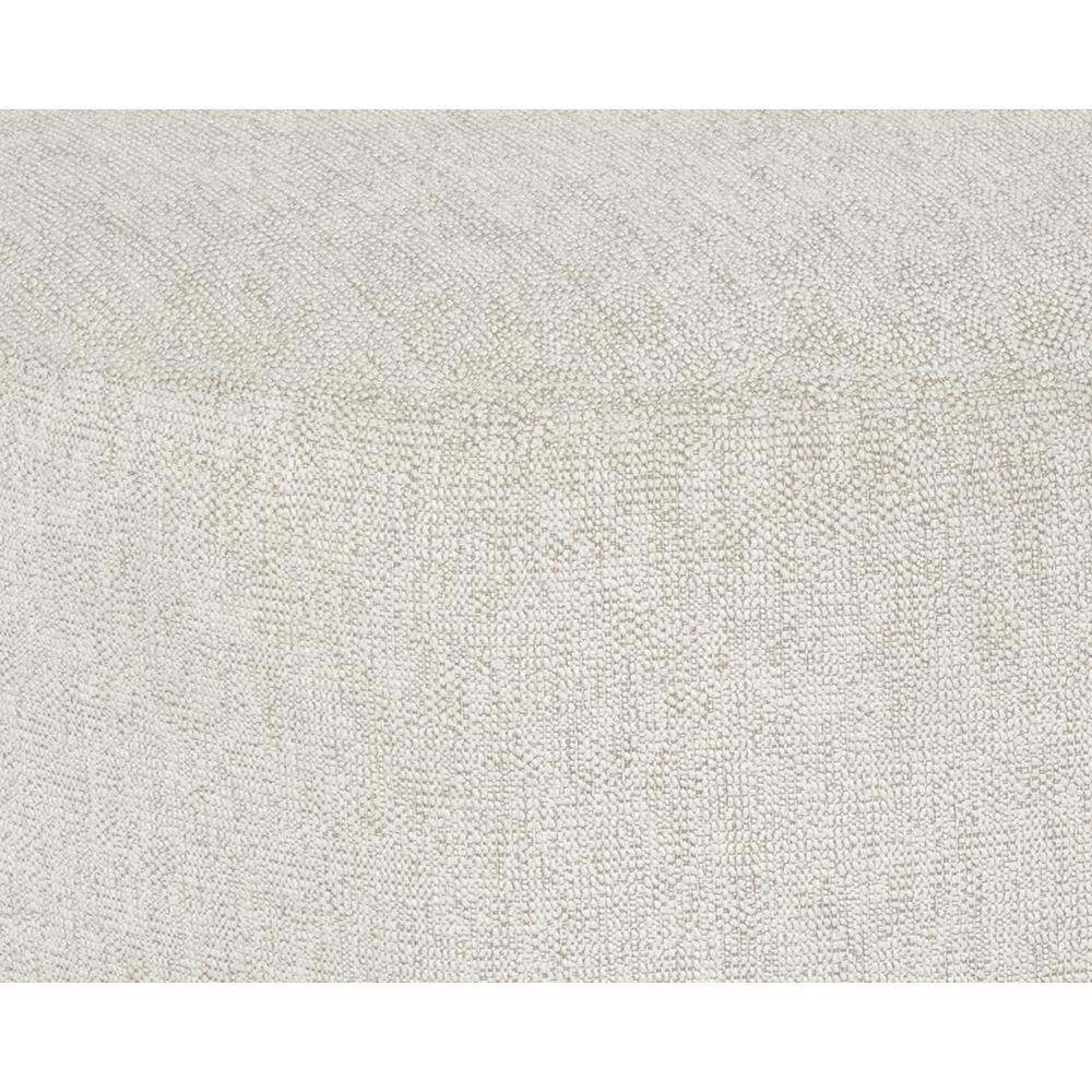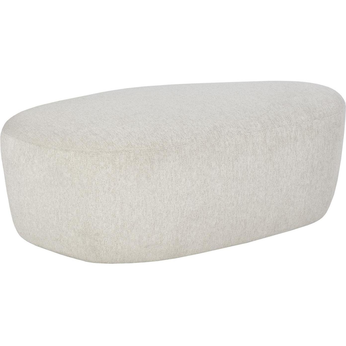 Boasting a design that is all about that curve appeal, this marvelous ottoman will stylishly add shape to any space. Stocked in dove cream fabric and completed with a wooden base. Coordinating swivel armless chair and sofa also available.