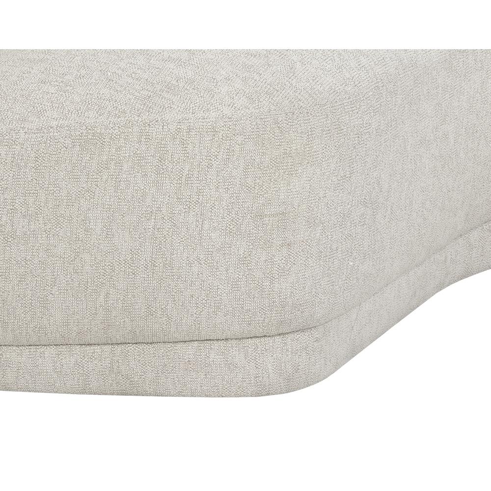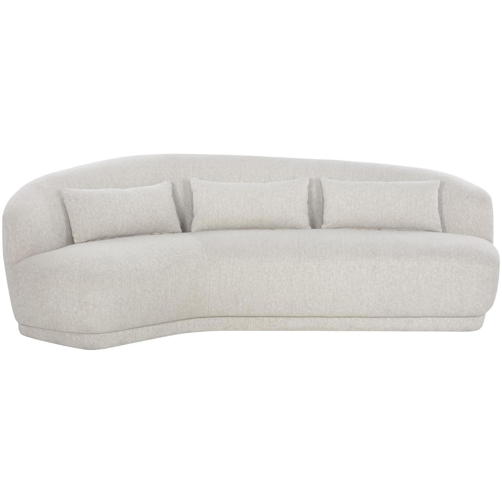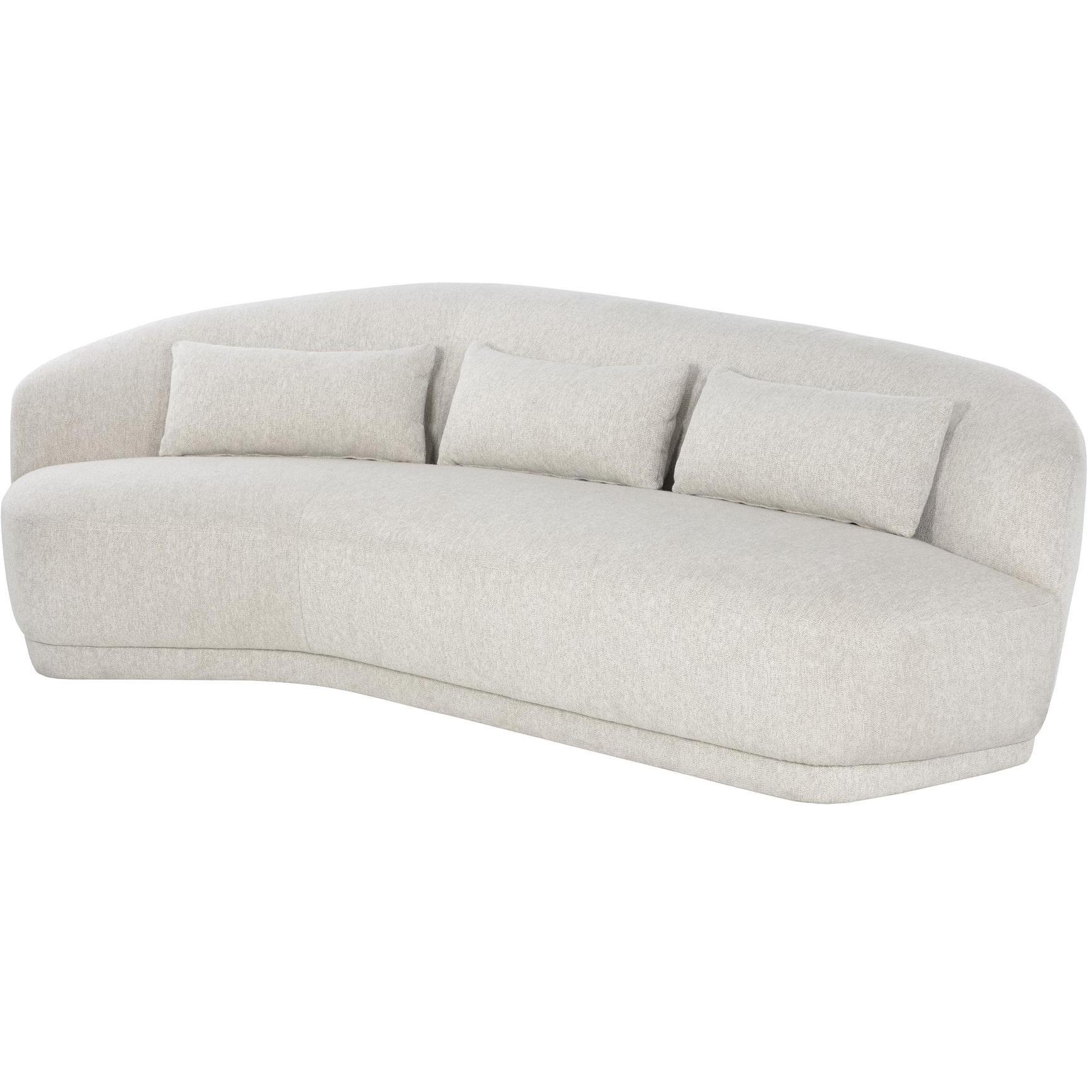 Boasting a design that is all about that curve appeal, this marvelous sofa will add shape to any space. Stocked in dove cream fabric and completed with a wooden frame. Includes three pillows. Coordinating swivel armless chair and ottoman also available.
