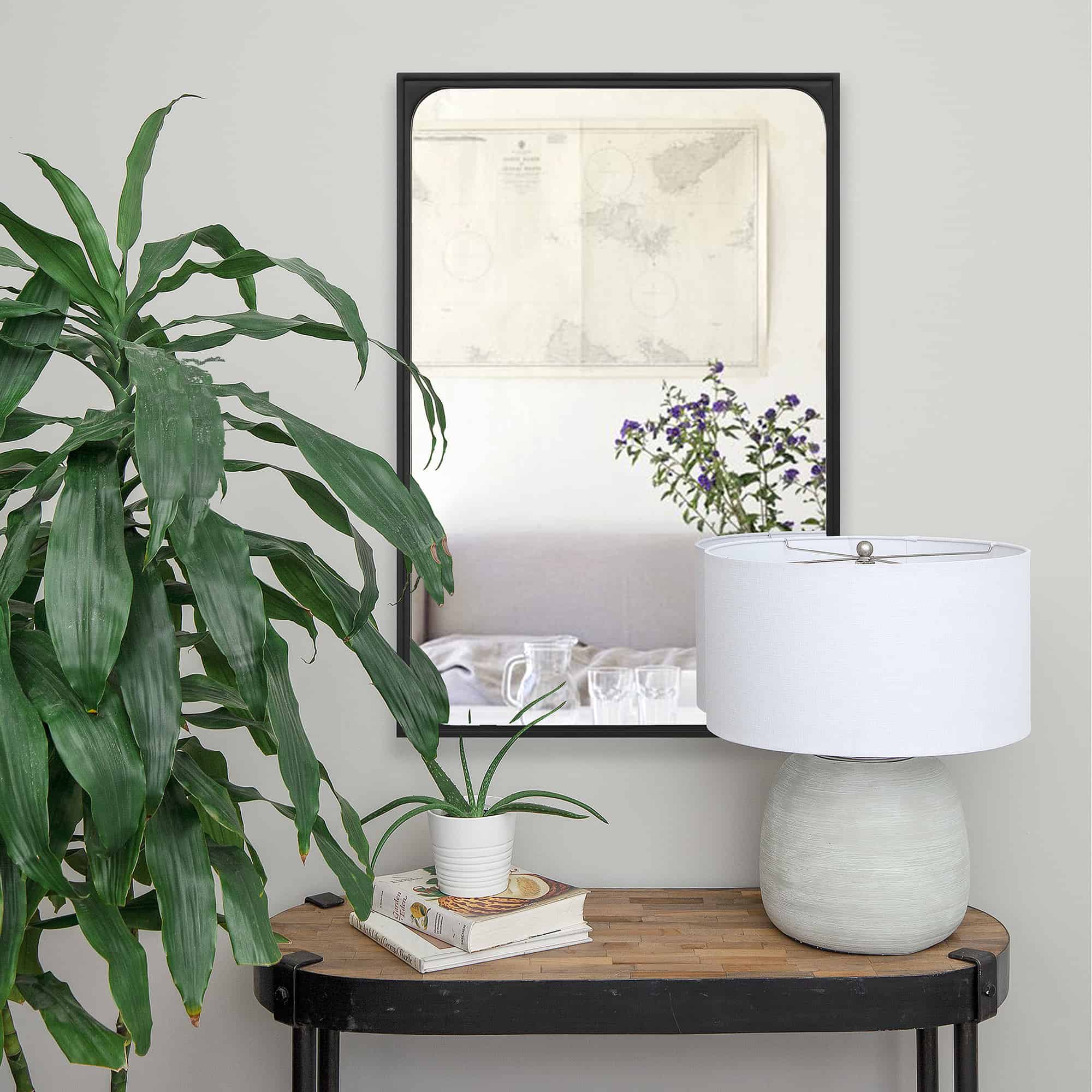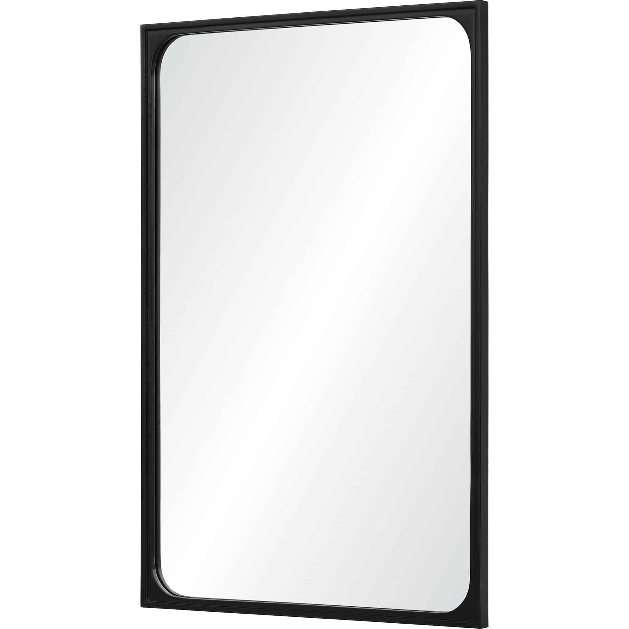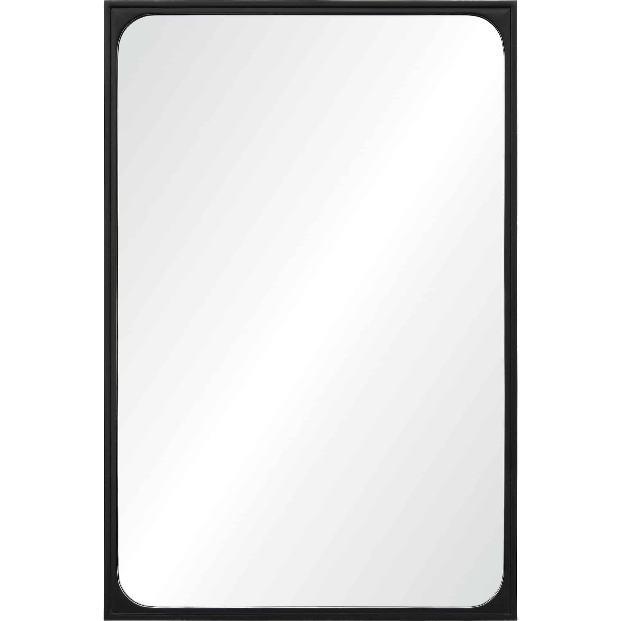 The sophisticated styling of this traditional wall mirror reveals a raw, yet refined charm. The carved wood mirror frame clips the rectangular looking glass into neatly curved corners, gently rounding at the inner edges. A black powder coated finish adds a hint of industrial chic to the decorative mirror’s farmhouse influences.