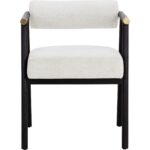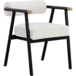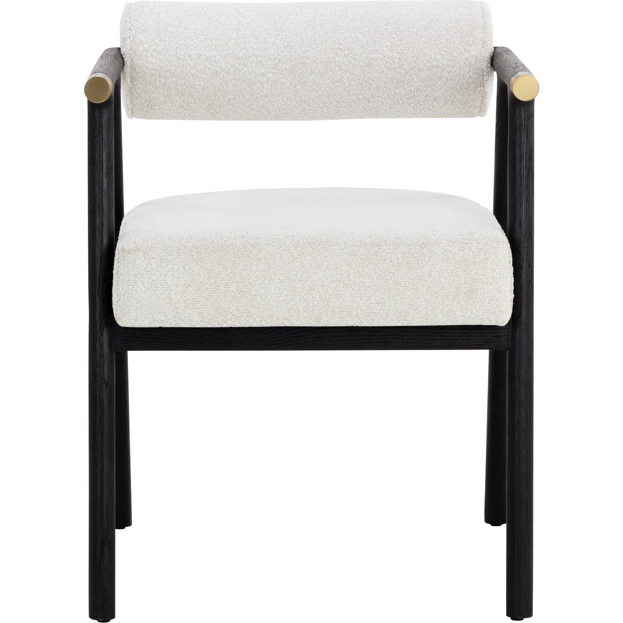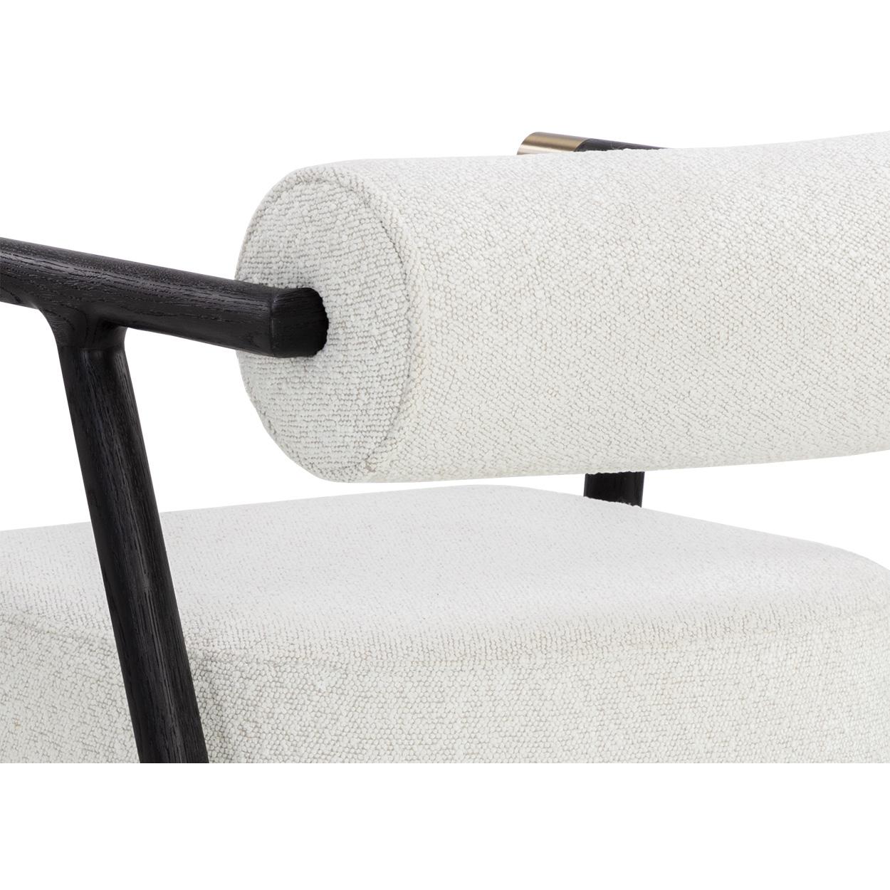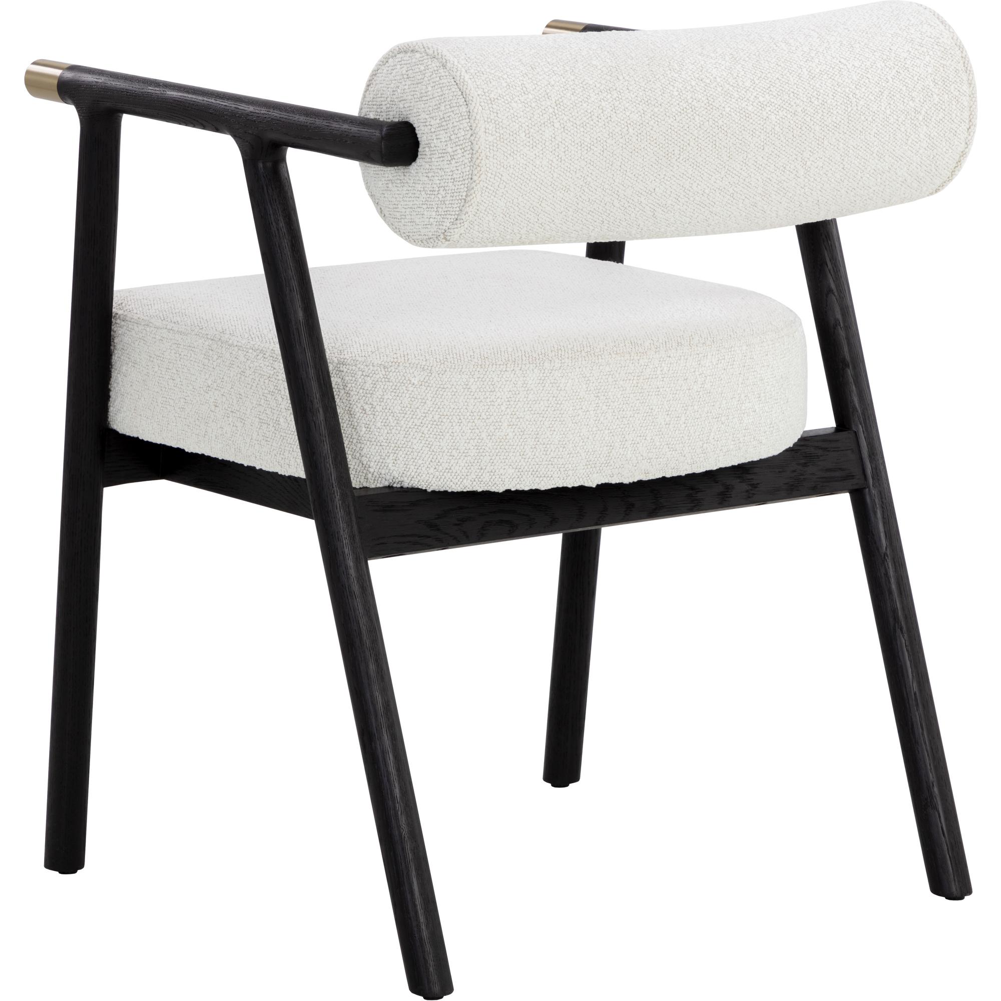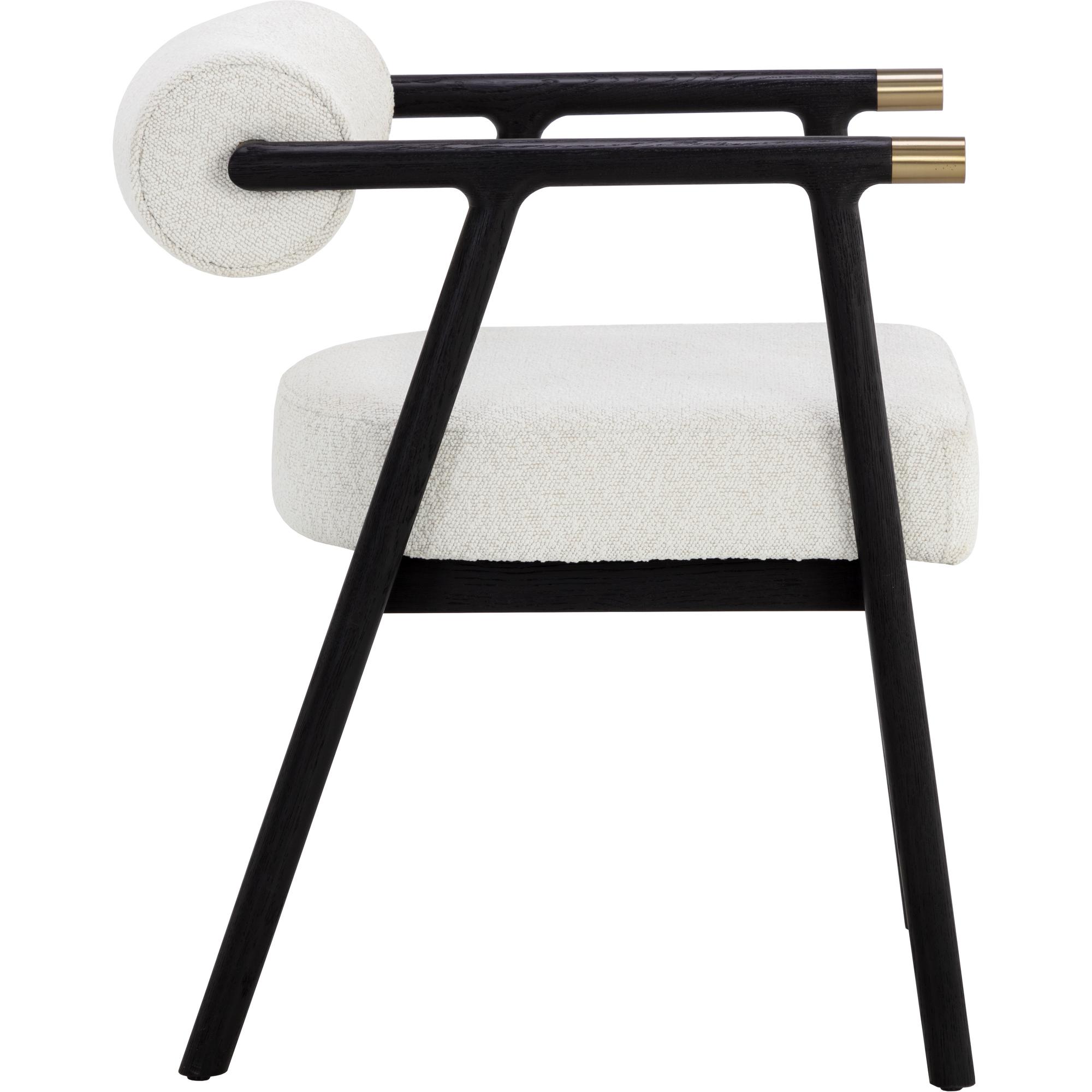 The attractive profile of the Sova Dining Armchair encapsulates modern sophistication. Black oak wood, copenhagen white boucle fabric and brushed brass metal caps create a timeless combination of refined materials.