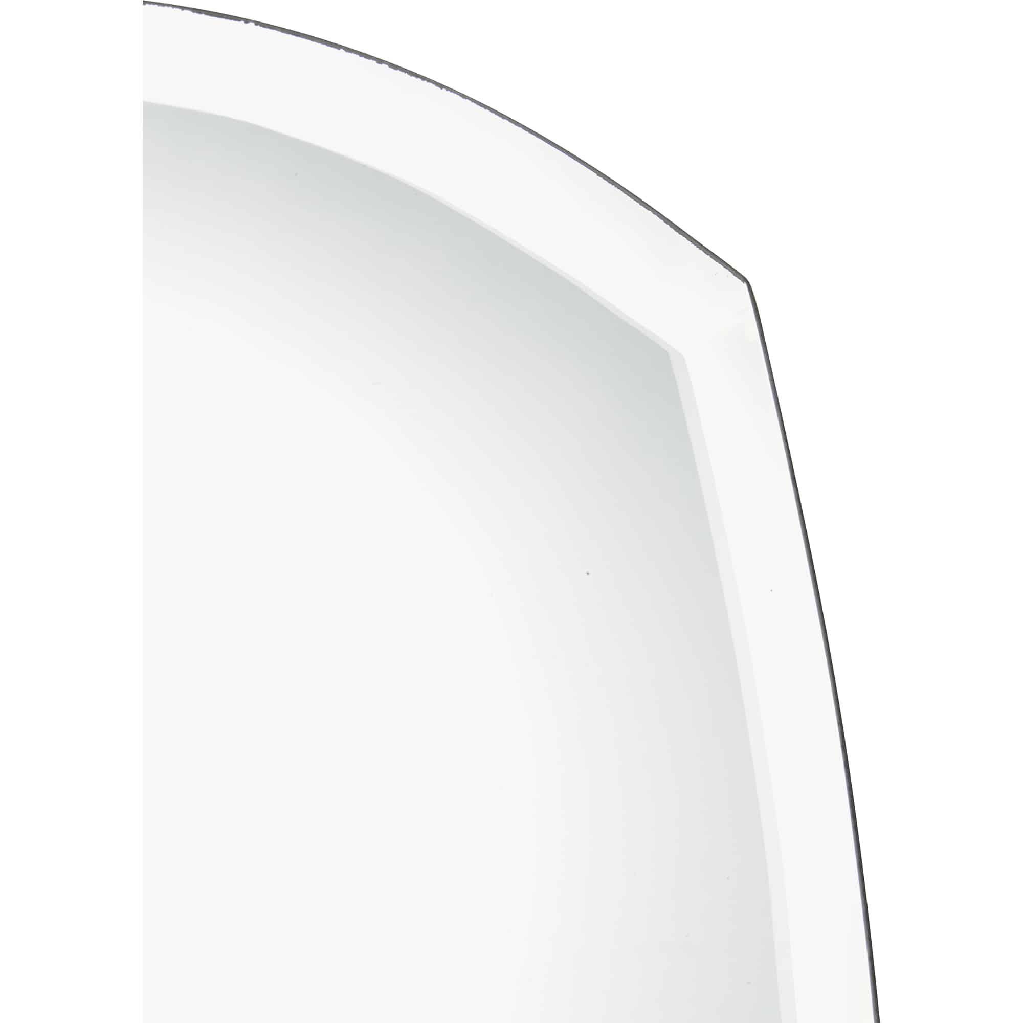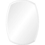This contemporary mirror has a unique shape that would have a great designer effect in a bathroom. It has beveled and polished edges. The mirror is attached to a backing with strong hangers.